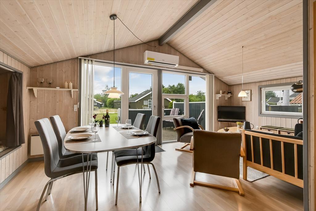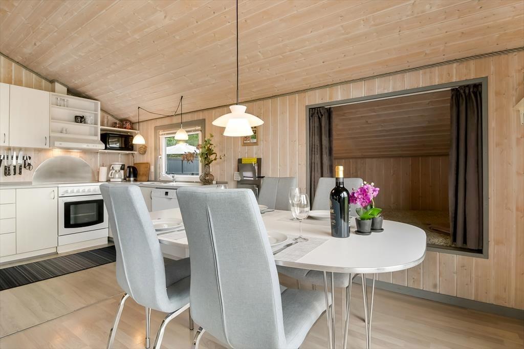 Når du træder indenfor i sommerhuset på Bork Hytteby 39, mødes du af en afslappet og hjemlig atmosfære, hvor der er kræset om detaljerne. De lyse træpaneler og det åbne rumforløb skaber en varm stemning, mens vinduespartierne lader lyset strømme ind og forbinder dig med naturen udenfor. I det åbne opholdsrum kan du og din bedre halvdel slænge jer i sofaen efter en lang gåtur ved fjorden – måske med en god bog og en kop varm kakao inden for rækkevidde. Køkkenet er praktisk og hyggeligt, og det er nemt at fremtrylle morgenmad eller aftensmad i fællesskab. Efter en dag fyldt med indtryk kan I trække jer tilbage til sommerhusets sovepladser og lade roen sænke sig, mens aftenmørket falder på udenfor.