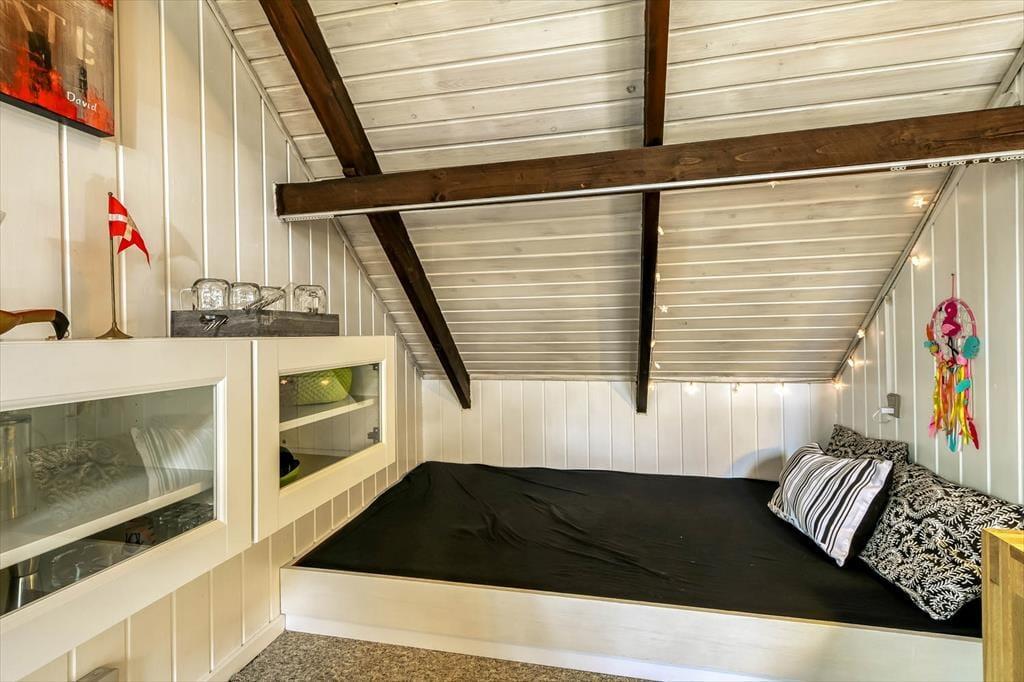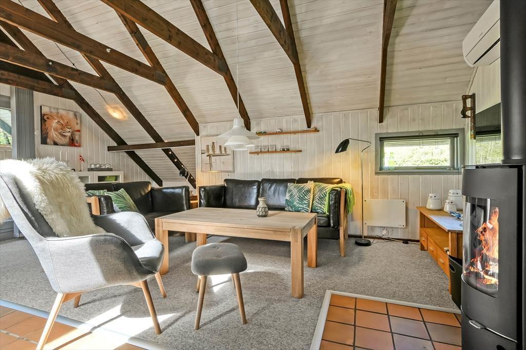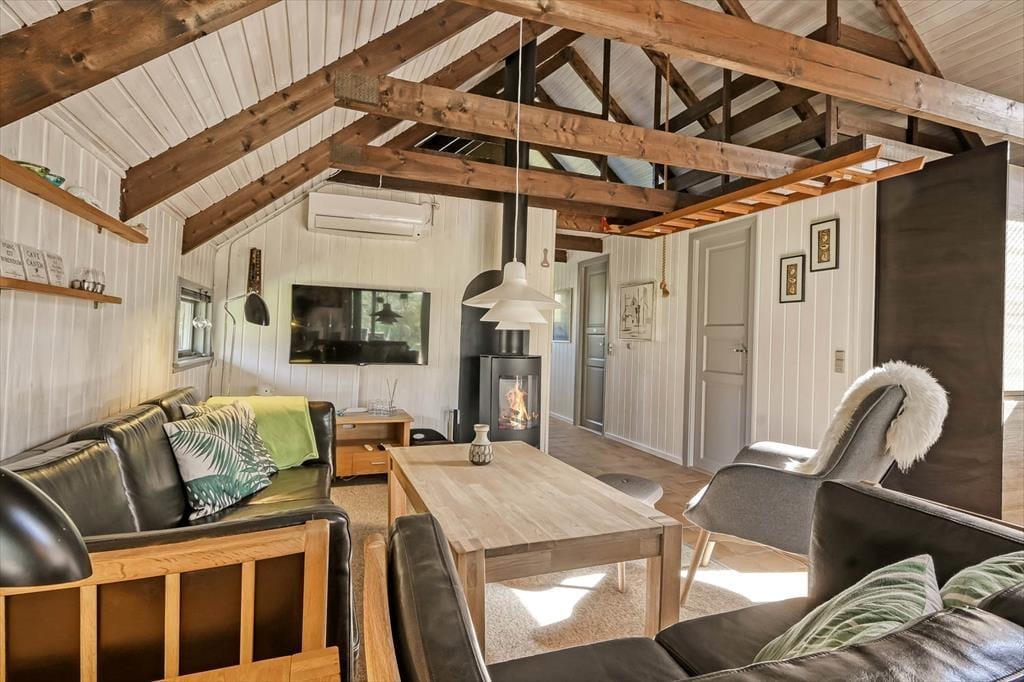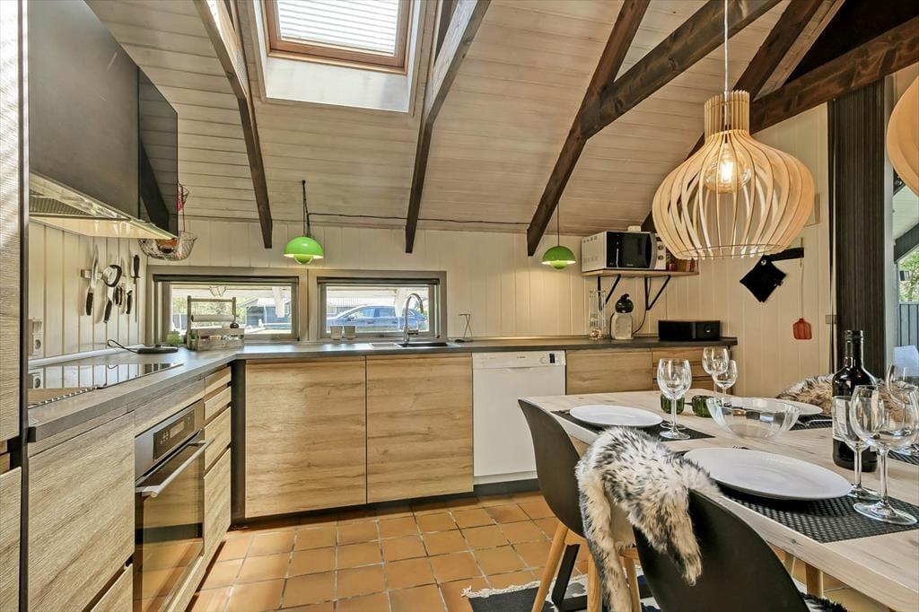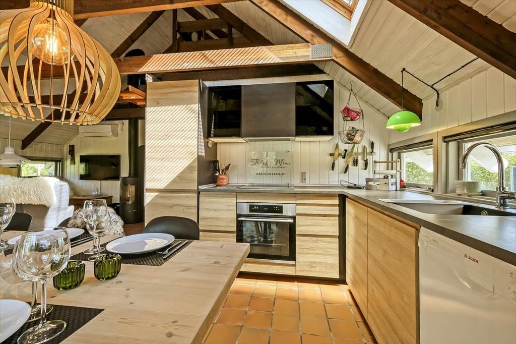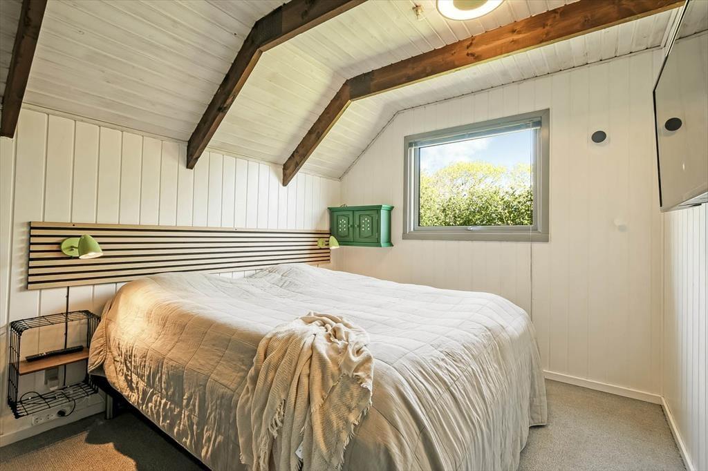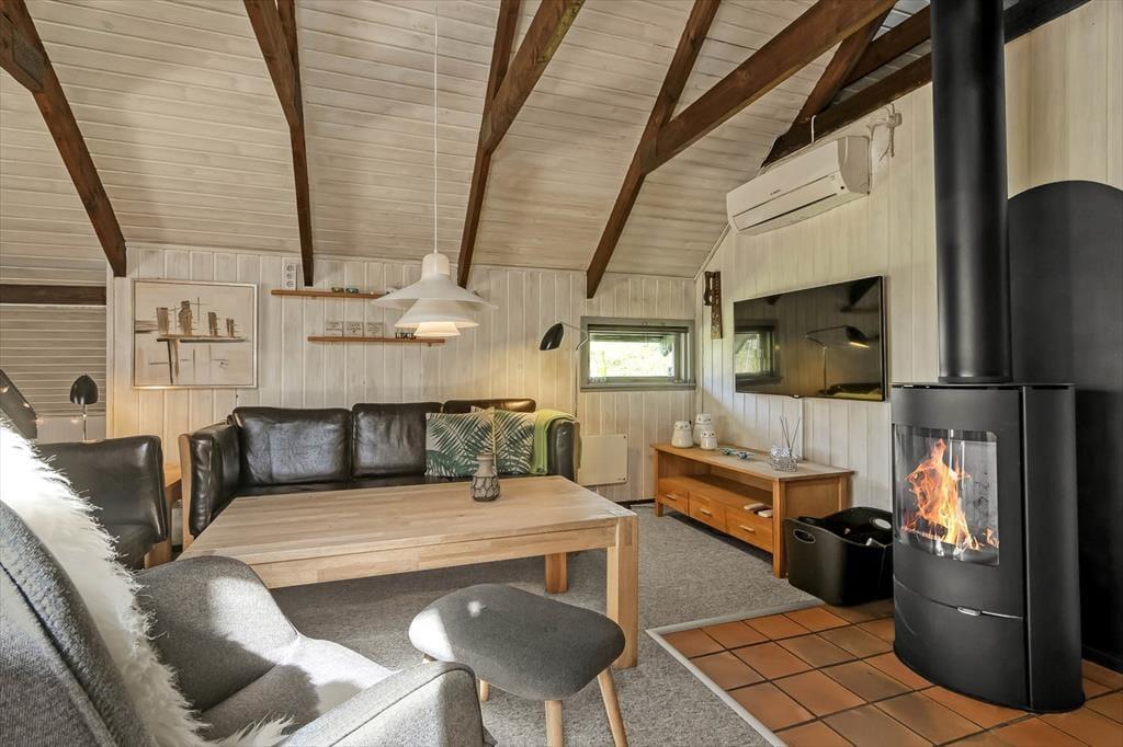 Det første, der møder dig, er den hyggelige stemning, som gennemsyrer hele sommerhuset – fra stuen med dens bløde sofaer og varme detaljer til det charmerende køkken, hvor duften af nybrygget kaffe eller hjemmebag hurtigt breder sig. Indretningen er både lys og hjemlig, og du mærker med det samme, at her kan du læne dig tilbage og nyde ferielivet i dit eget tempo. De hyggelige værelser giver plads til hele familien, og der er tænkt på både samvær og ro til afslapning. Den åbne planløsning samler jer om feriens små øjeblikke – hvad enten det er brætspil, læsestunder eller hyggelige middage, mens hundene putter sig ved jeres fødder.