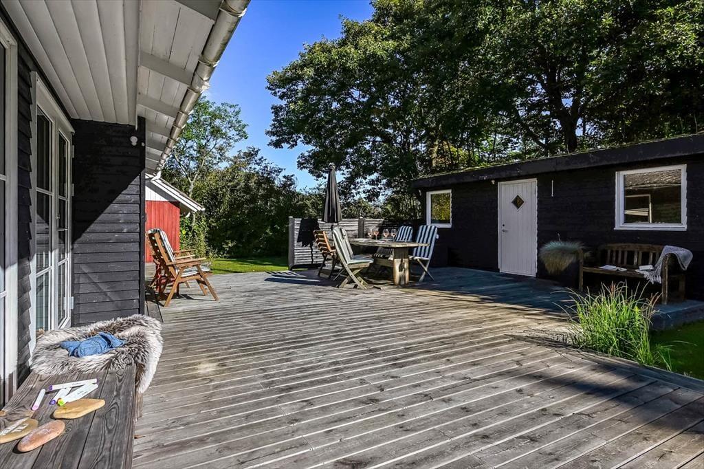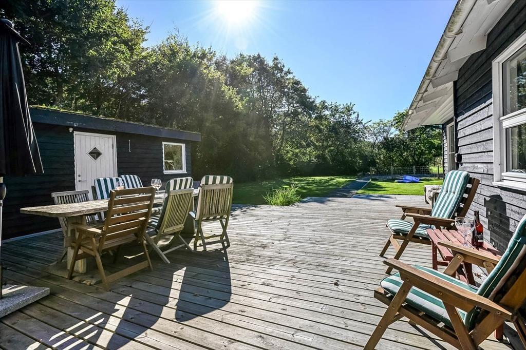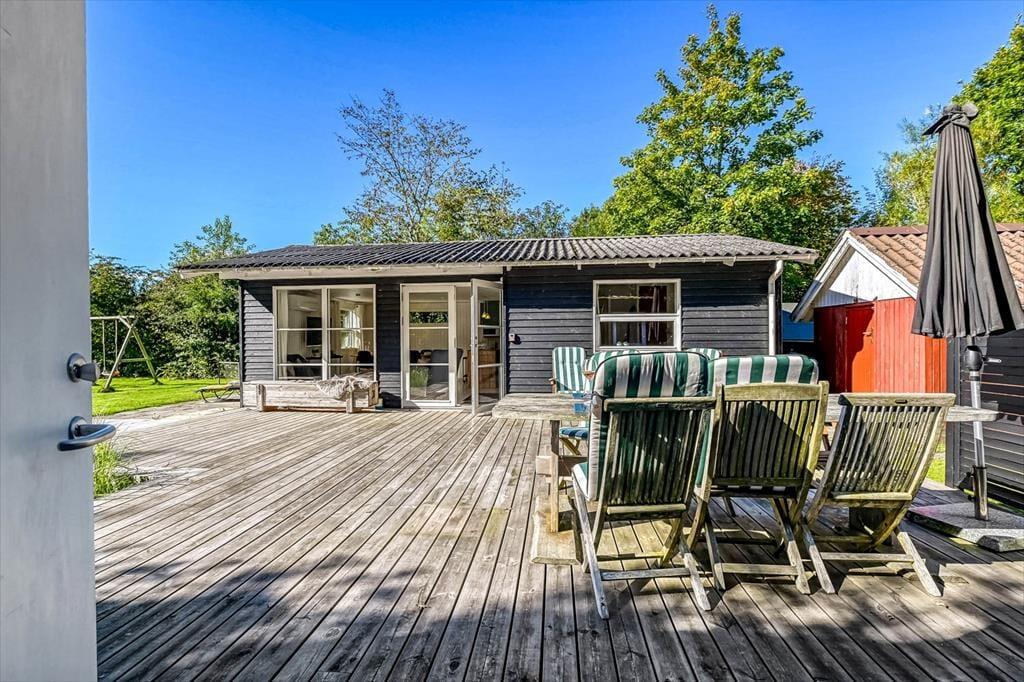 Sommerhuset ligger på en skøn grund med en dejlig træterrasse, der indbyder til lange dage under åben himmel. Her kan du starte morgenen med friskbrygget kaffe og fuglefløjt i baggrunden, eller du kan sætte jer sammen til aftensmad, mens solen går ned over sommerhusområdet. På terrassen er der god plads til at slappe af, uanset om du nyder en stille stund i skyggen eller lader børnene lege på græsset foran. Atmosfæren er rolig og afslappet, og du vil hurtigt opleve, hvordan feriedagene glider ubemærket afsted mellem måltider, solstrejf og latter fra terrassen.
