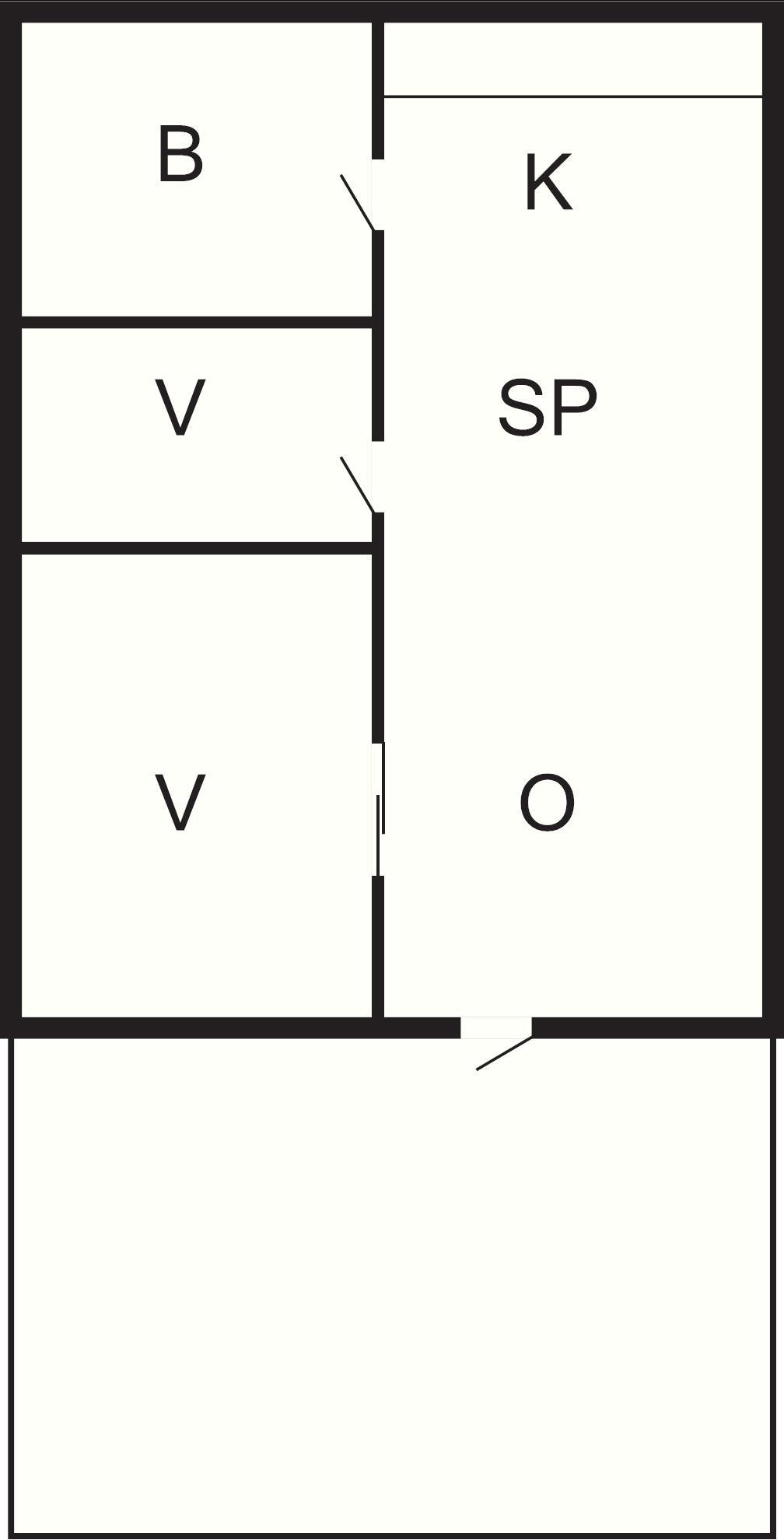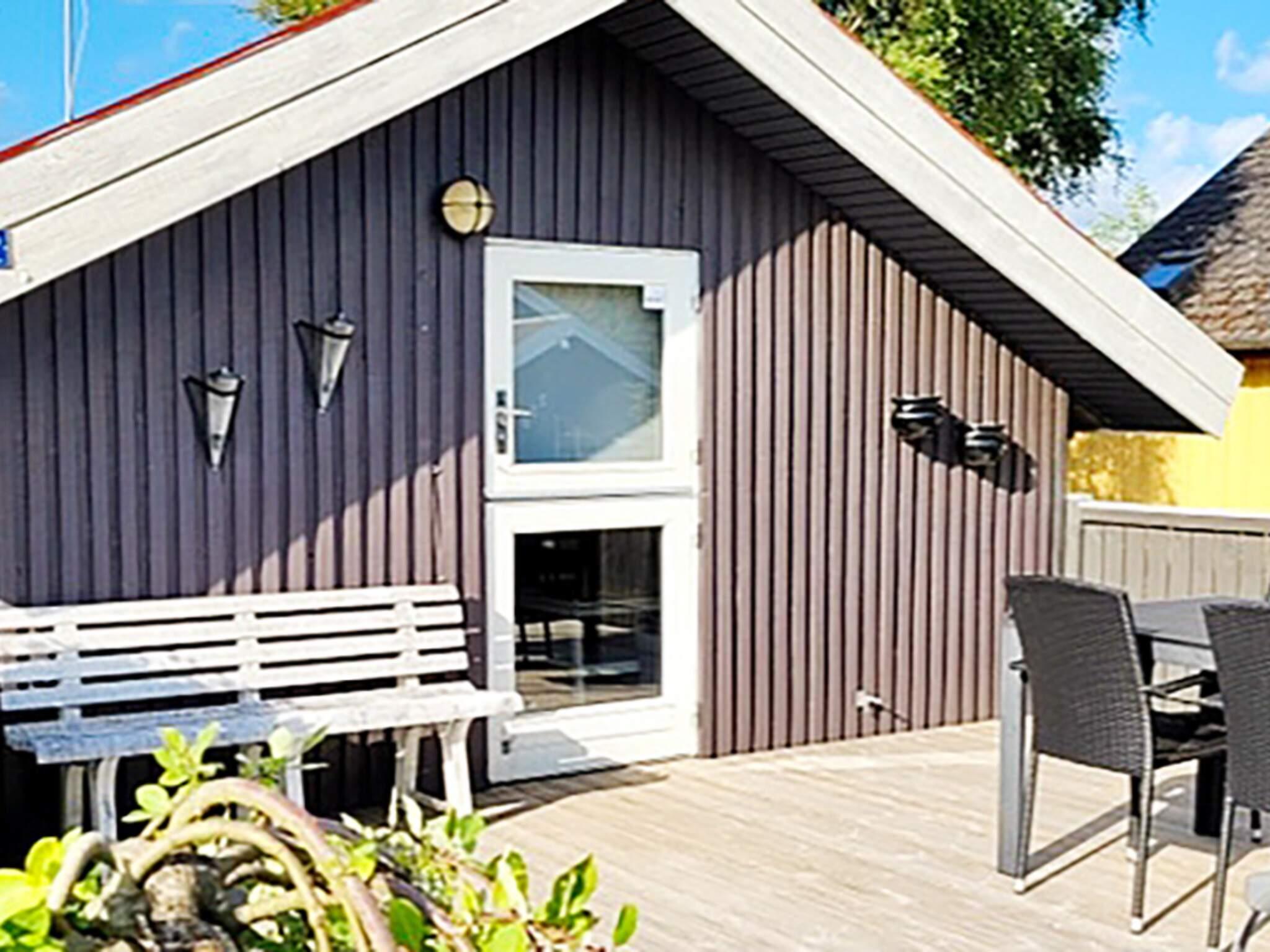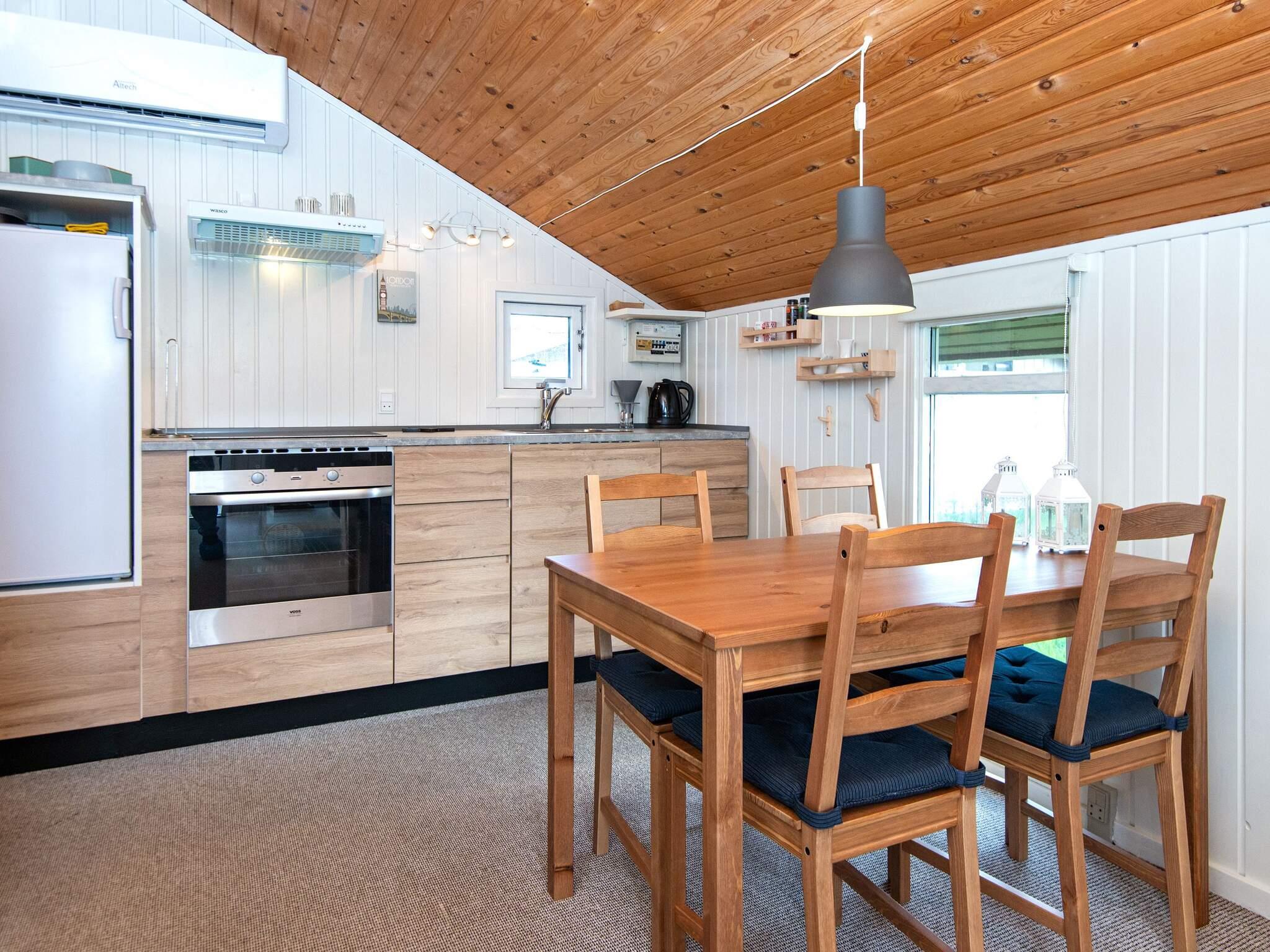 Interiøret indeholder et soveværelse med dobbeltseng og et mindre værelse med en køjeseng designet til børn. Det åbne køkken og opholdsstue er lyst og praktisk og byder på alt hvad du behøver til hyggelige måltider og aftener sammen. Herfra træder du direkte ud på en 25 m² træterrasse, ideelt placeret til sol hele dagen. Terrassen er et vidunderligt sted at nyde udendørs spisning eller bare slappe af i den friske luft. Haven er fuldt indhegnet, hvilket giver ro i sindet, hvis du rejser med en hund.