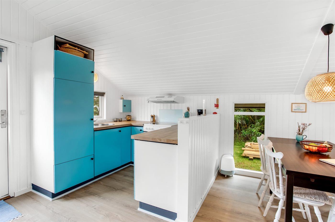 Køkkenet er udstyret med 1 køleskab. Der er 4 elkogeplader, bageovn, mikrobølgeovn.
