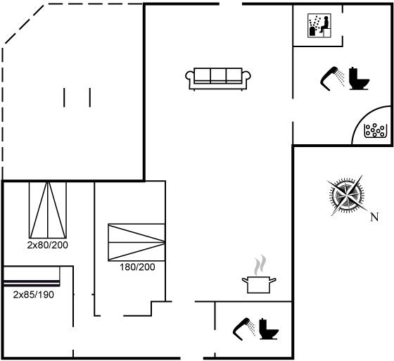 Der er 2 badeværelser med bruseniche og 2 toiletter. Der er gulvvarme på 2 badeværelser. I saunaen er der mulighed for afslapning.