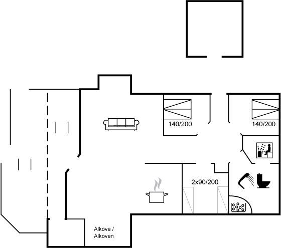 Der er i alt 3 soveværelser. Sovepladserne fordeler sig på: 4 sovepladser i dobbeltsenge. 2 sovepladser i enkeltsenge.