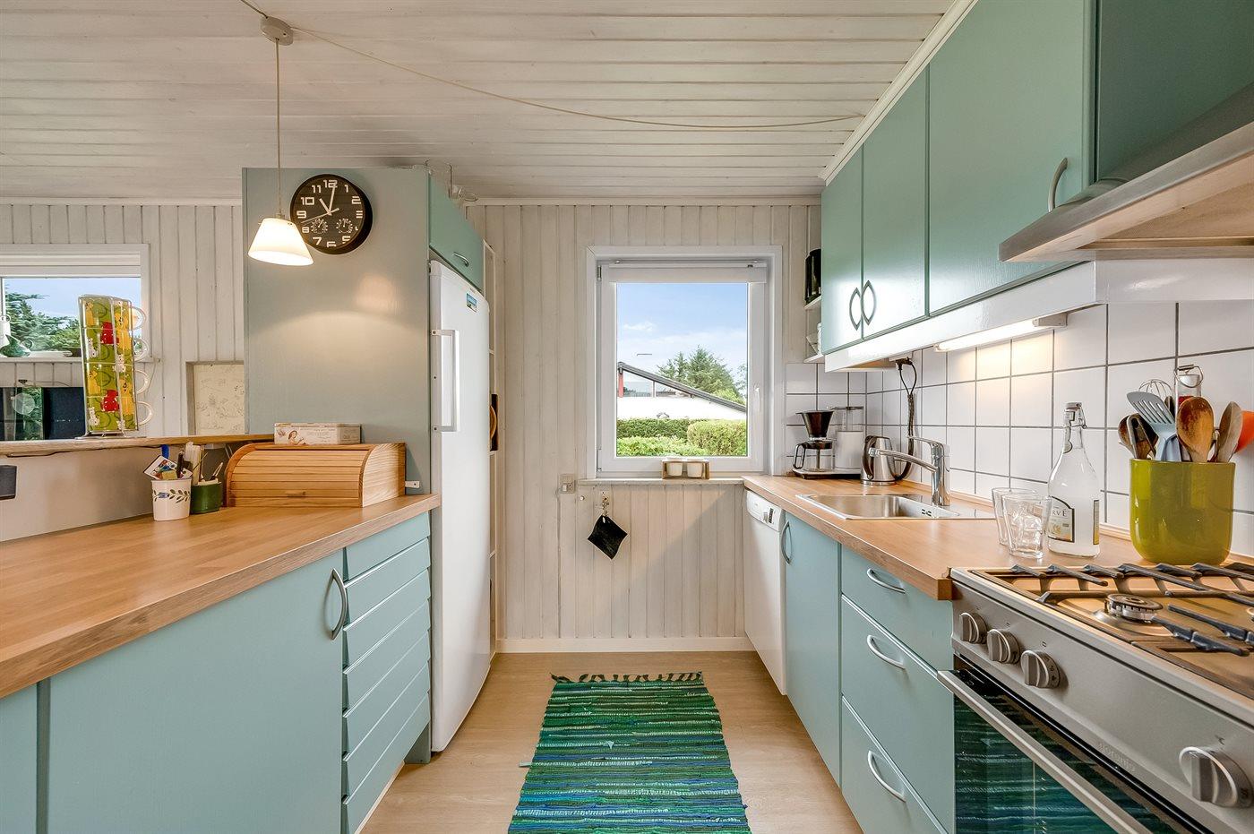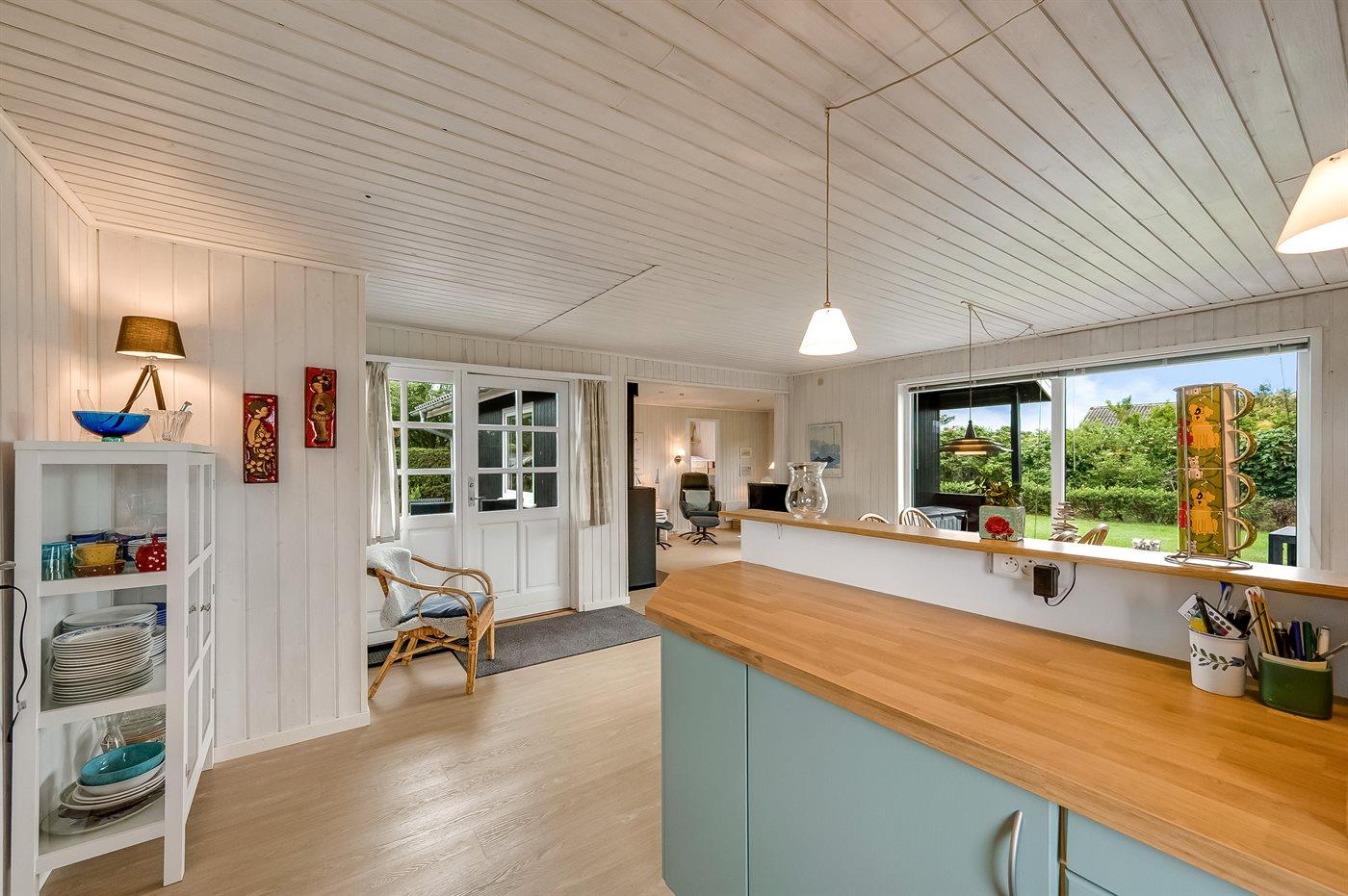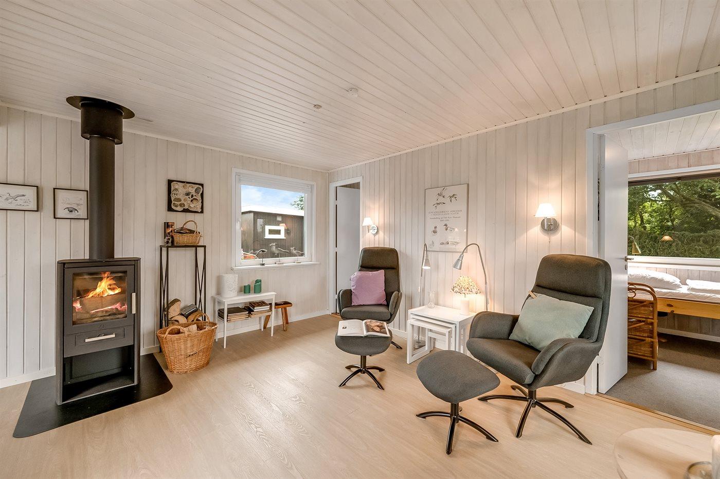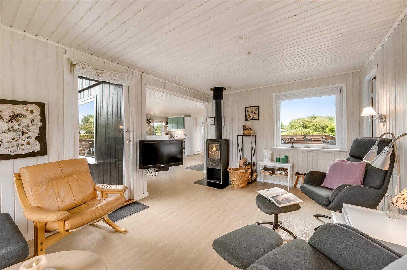 Det lyse køkken er bl.a. udstyret med opvaskemaskine. I opholdsstuen findes brændeovn, TV og stereoanlæg med CD-afspiller. Desuden gratis, trådløs internetforbindelse til rådighed (computer skal medbringes - fiber bredbånd).