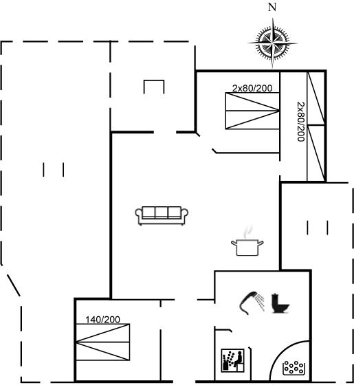 Der er i alt 3 soveværelser. Sovepladserne fordeler sig på: 4 sovepladser i dobbeltsenge. 2 sovepladser i enkeltsenge. Derudover er der 1 stk. barneseng.