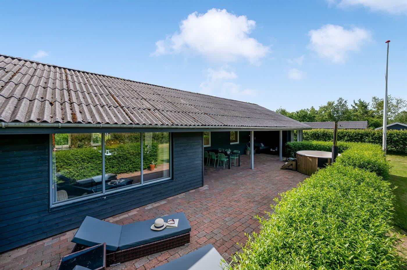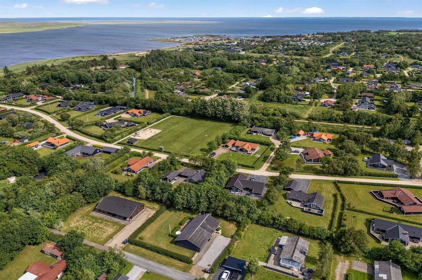 Ferieboligen er beliggende på en 944 m² stor havegrund. Grunden er indhegnet. Der er 3000 m til havet. Der er 800 m til fjorden. Nærmeste forretning er beliggende i en afstand af 1000 m. Til ferieboligen hører 25 m² terrasseareal. Desuden er der 39 m² overdækket terrasse. Grill til rådighed. Parkering ved ferieboligen.