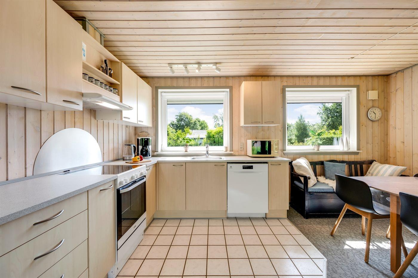 Køkkenet er udstyret med 1 køleskab. Der er 4 keramiske kogeplader, varmluftovn, mikrobølgeovn samt opvaskemaskine.