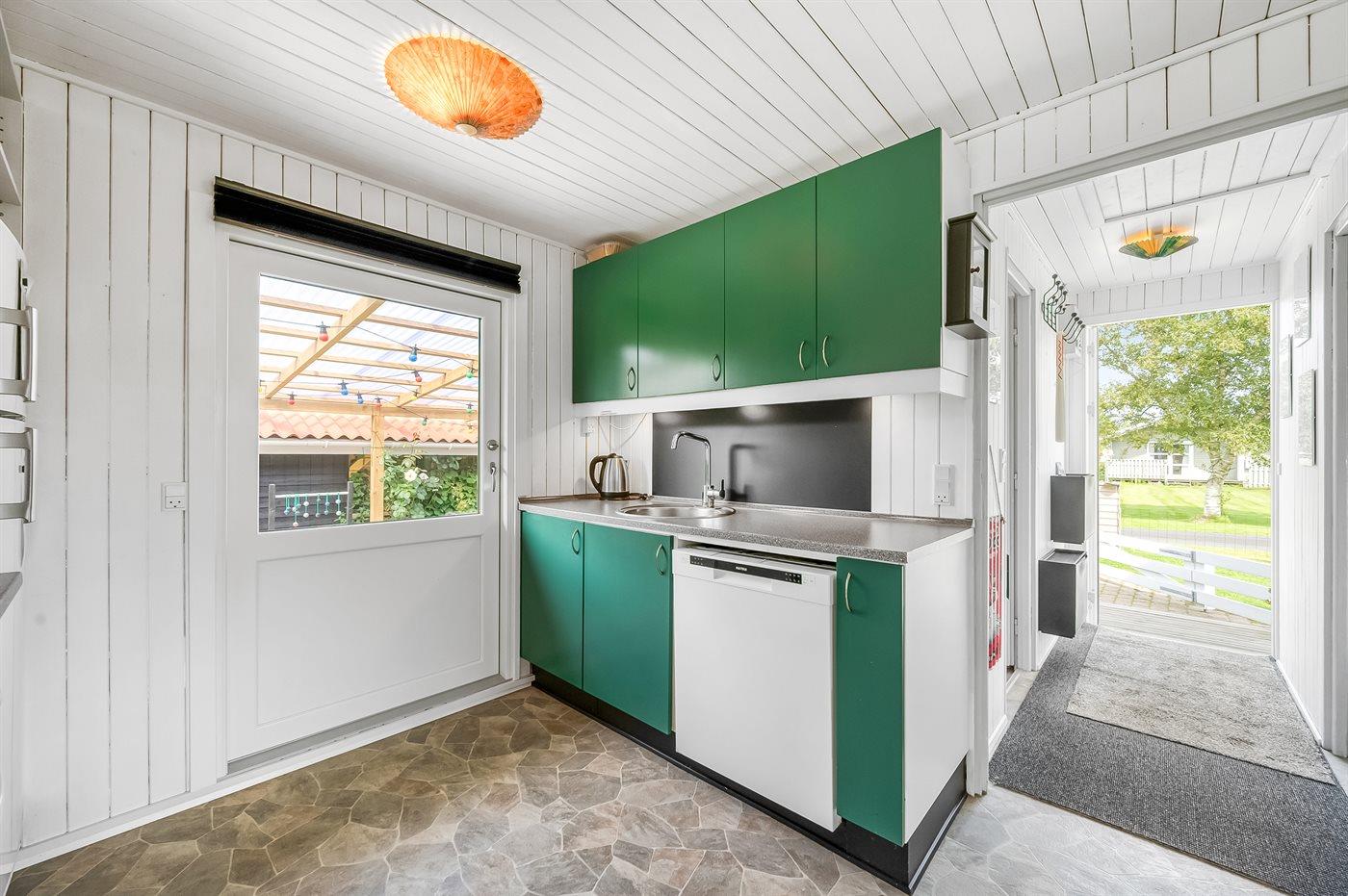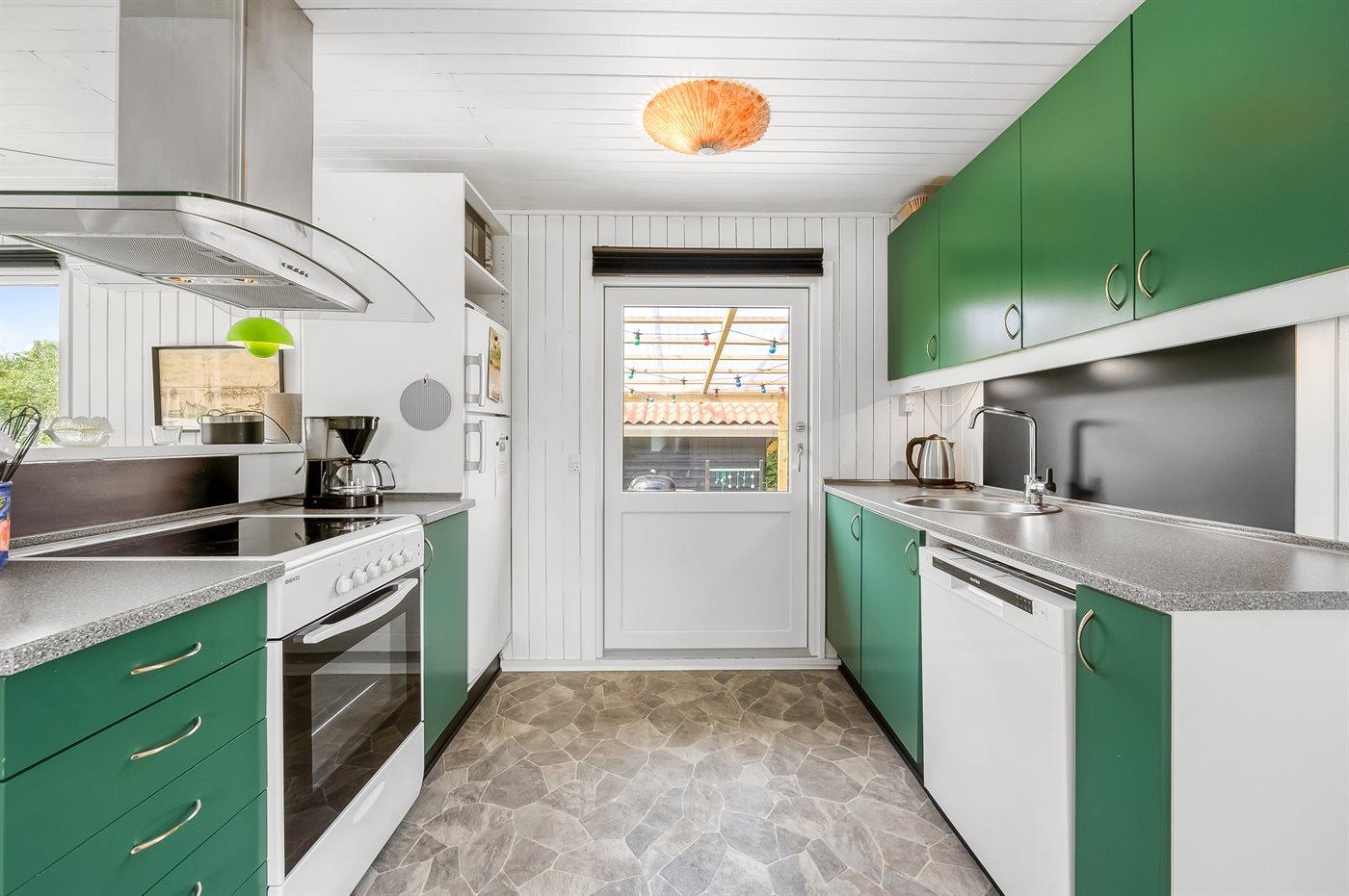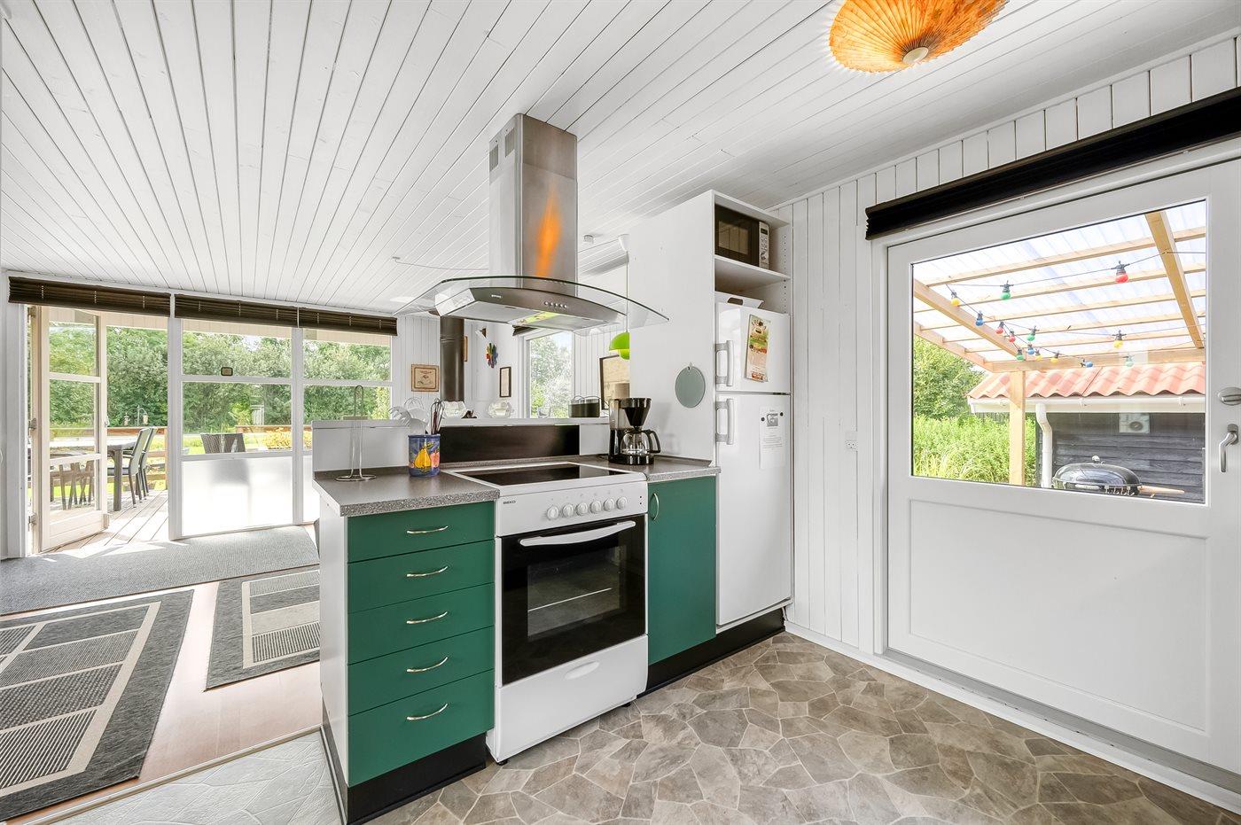 Køkkenet er udstyret med 1 køleskab. Der er 4 keramiske kogeplader, varmluftovn, mikrobølgeovn samt opvaskemaskine.
