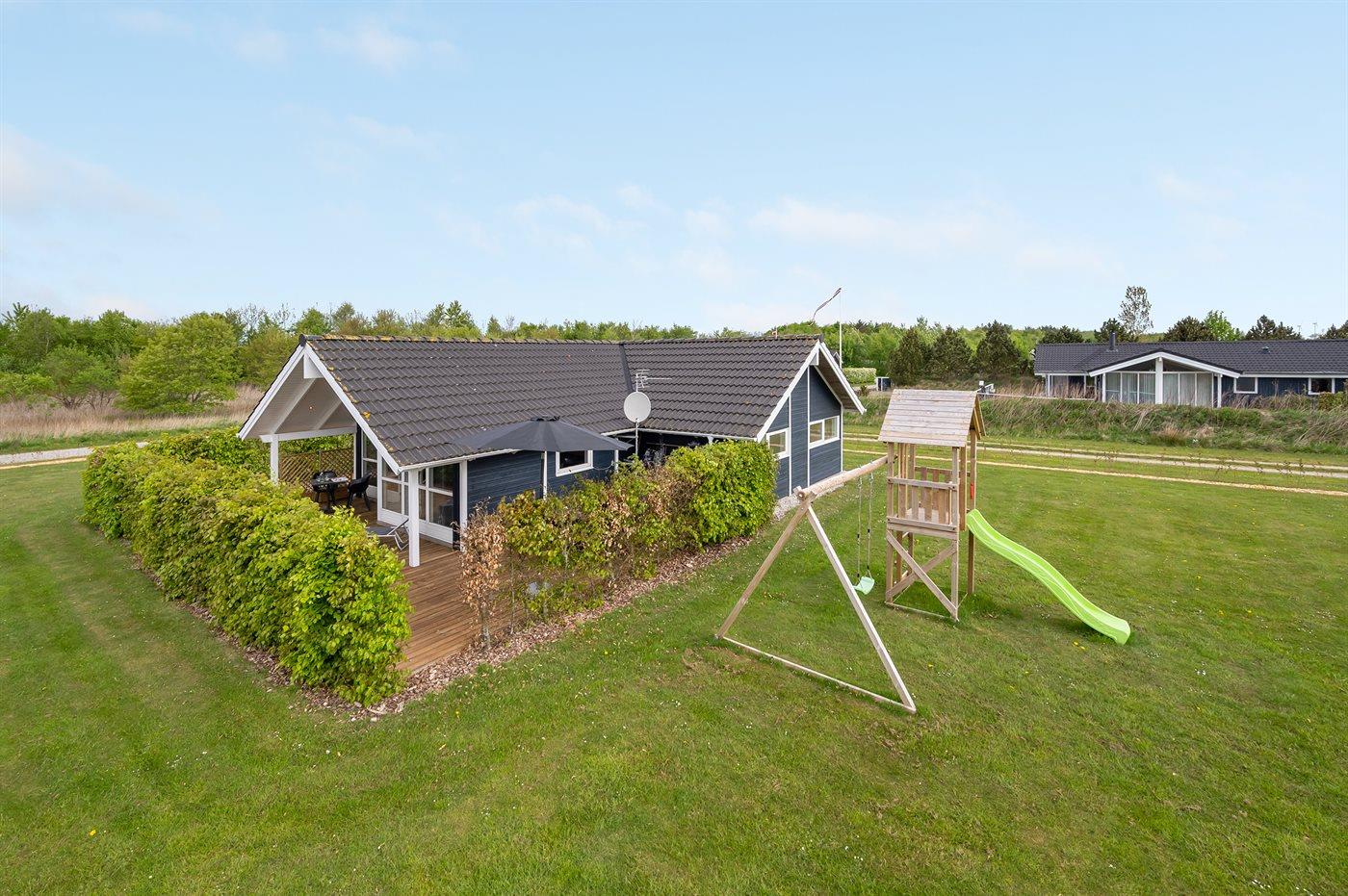 Ferieboligen er beliggende på en 1200 m² stor havegrund. Der er 7300 m til havet. Der er 1200 m til fjorden. Nærmeste forretning er beliggende i en afstand af 600 m. Til ferieboligen hører 69 m² terrasseareal. Desuden er der 14 m² overdækket terrasse. Der er redskabsrum. Gynge. Parkering ved ferieboligen.