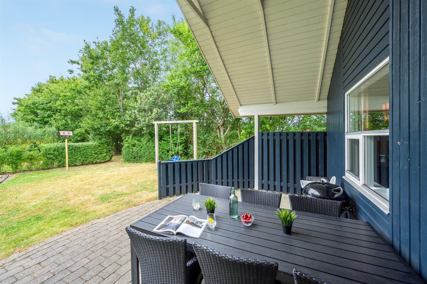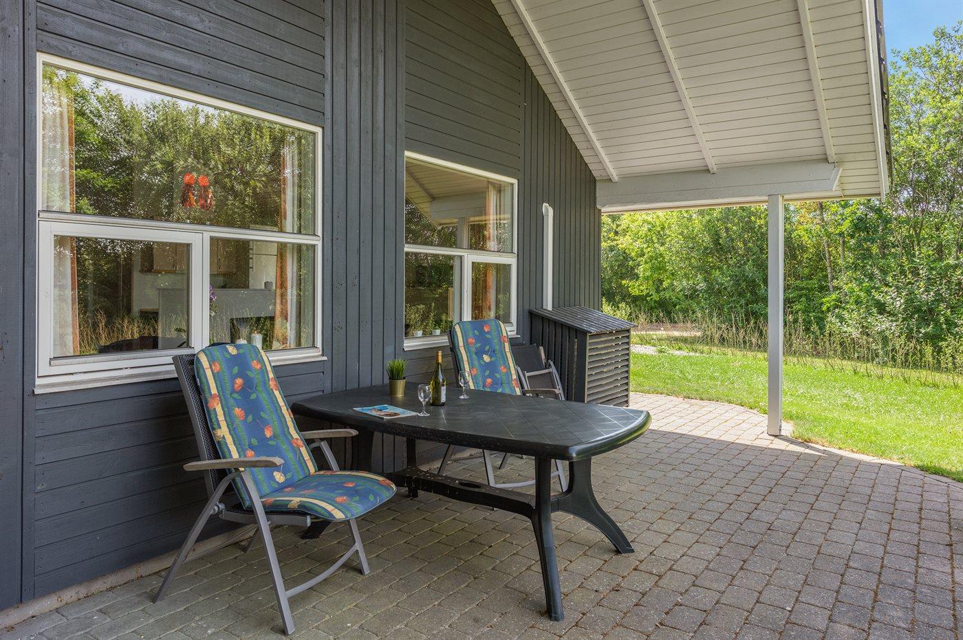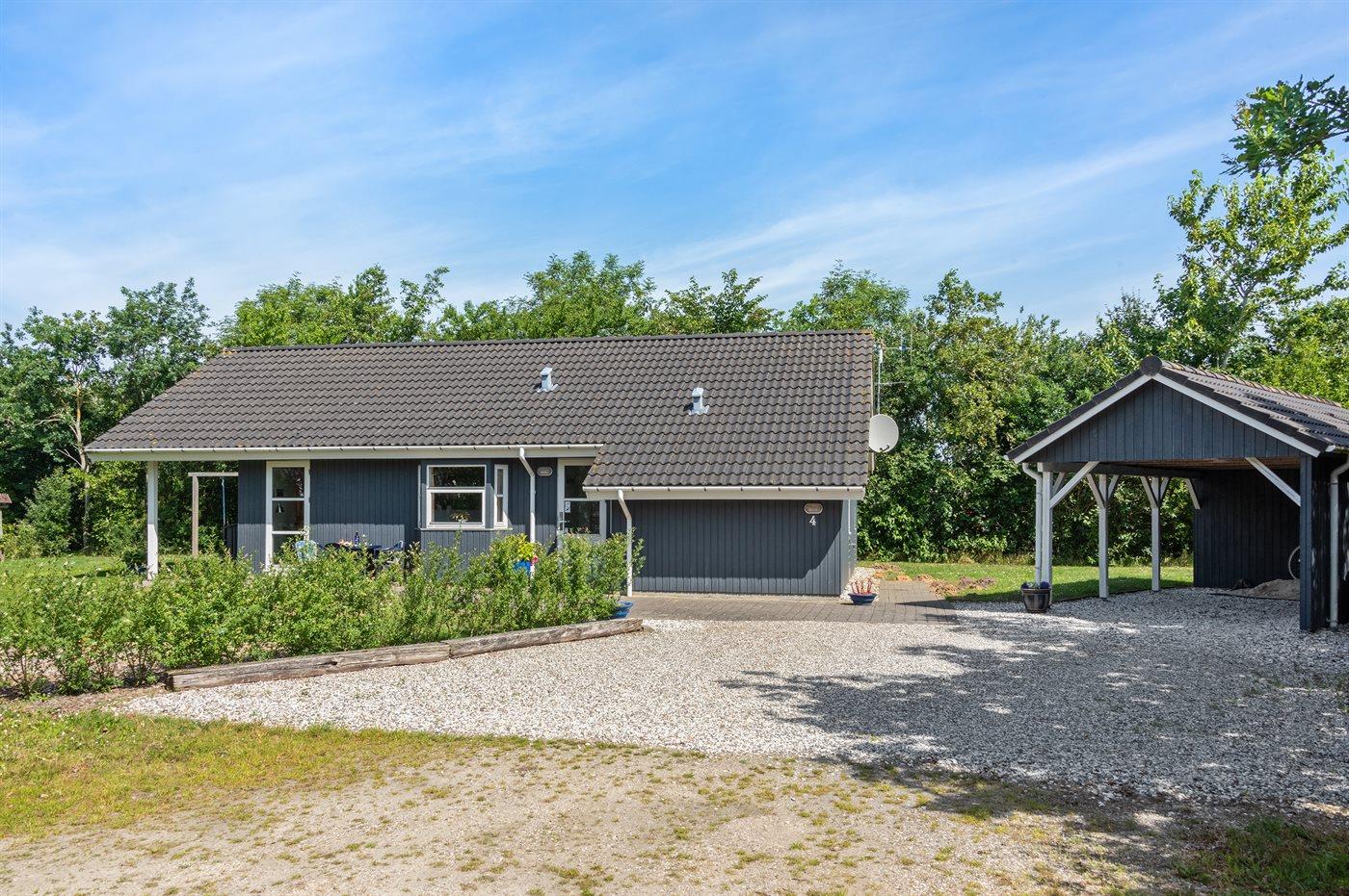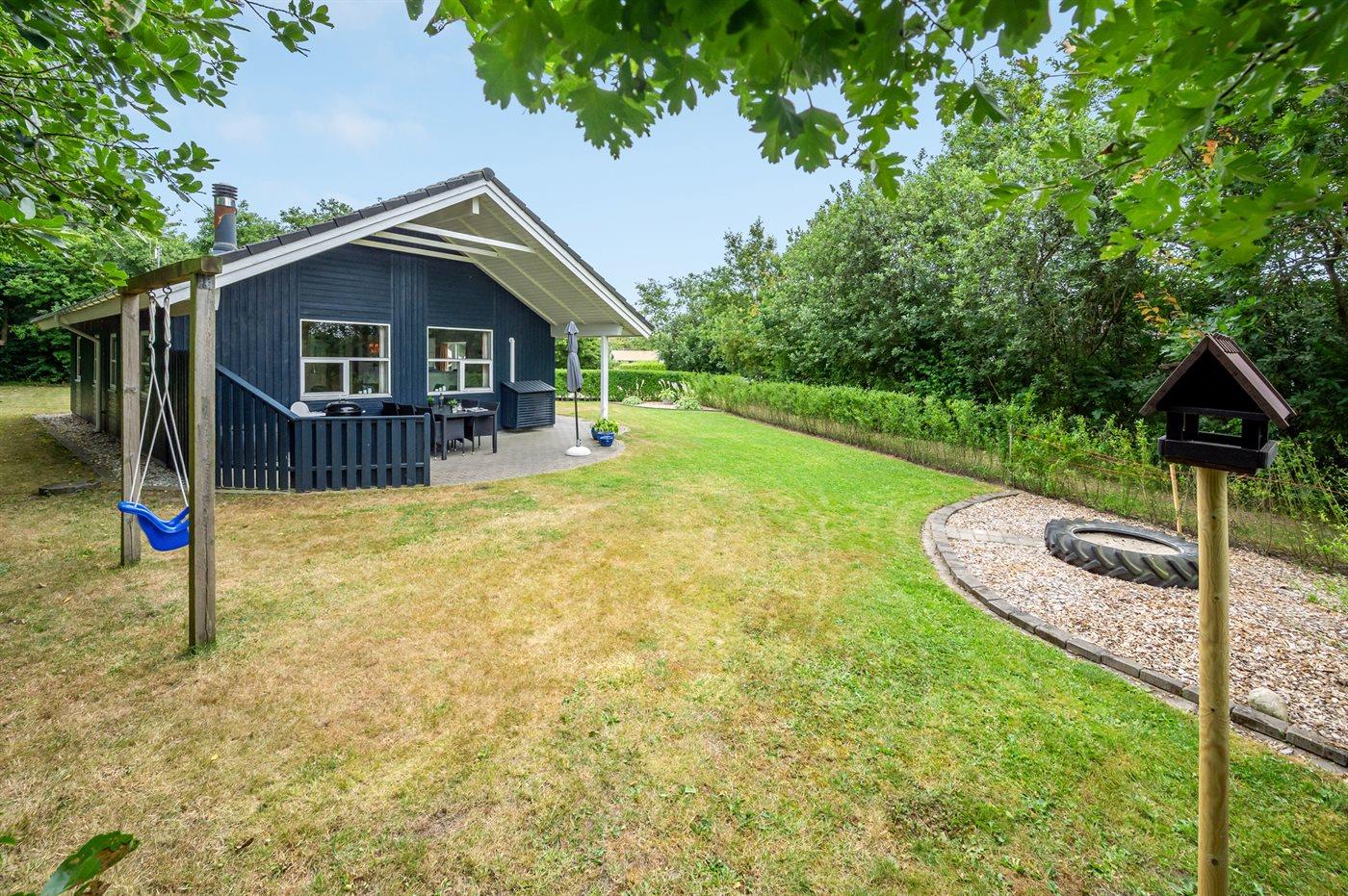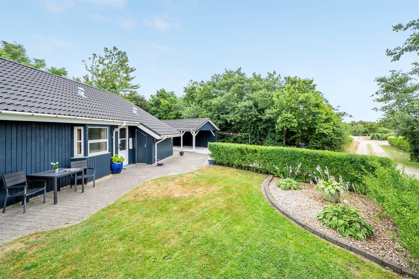 Ferieboligen er beliggende på en 968 m² stor havegrund. Der er 7000 m til havet. Der er 1000 m til fjorden. Nærmeste forretning er beliggende i en afstand af 1000 m. Til ferieboligen hører 24 m² terrasseareal. Desuden er der 14 m² overdækket terrasse. Der er redskabsrum. Gynge. Sandkasse. Der er carport til rådighed. Parkering ved ferieboligen.