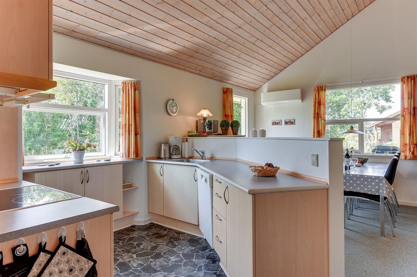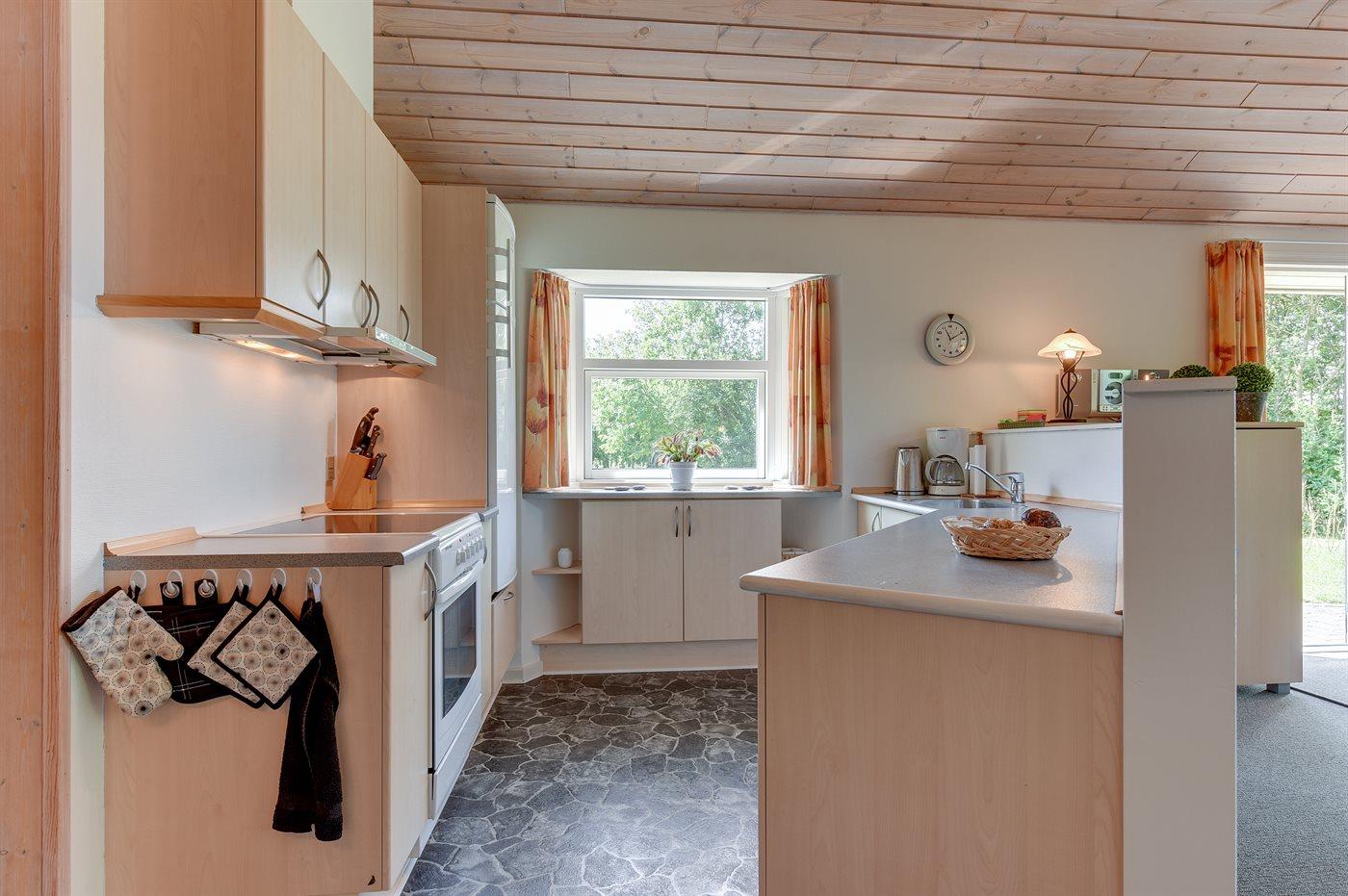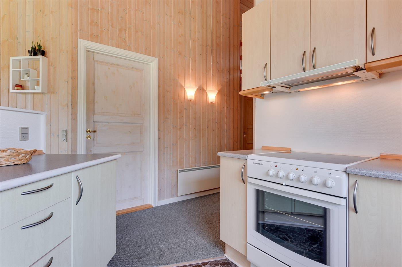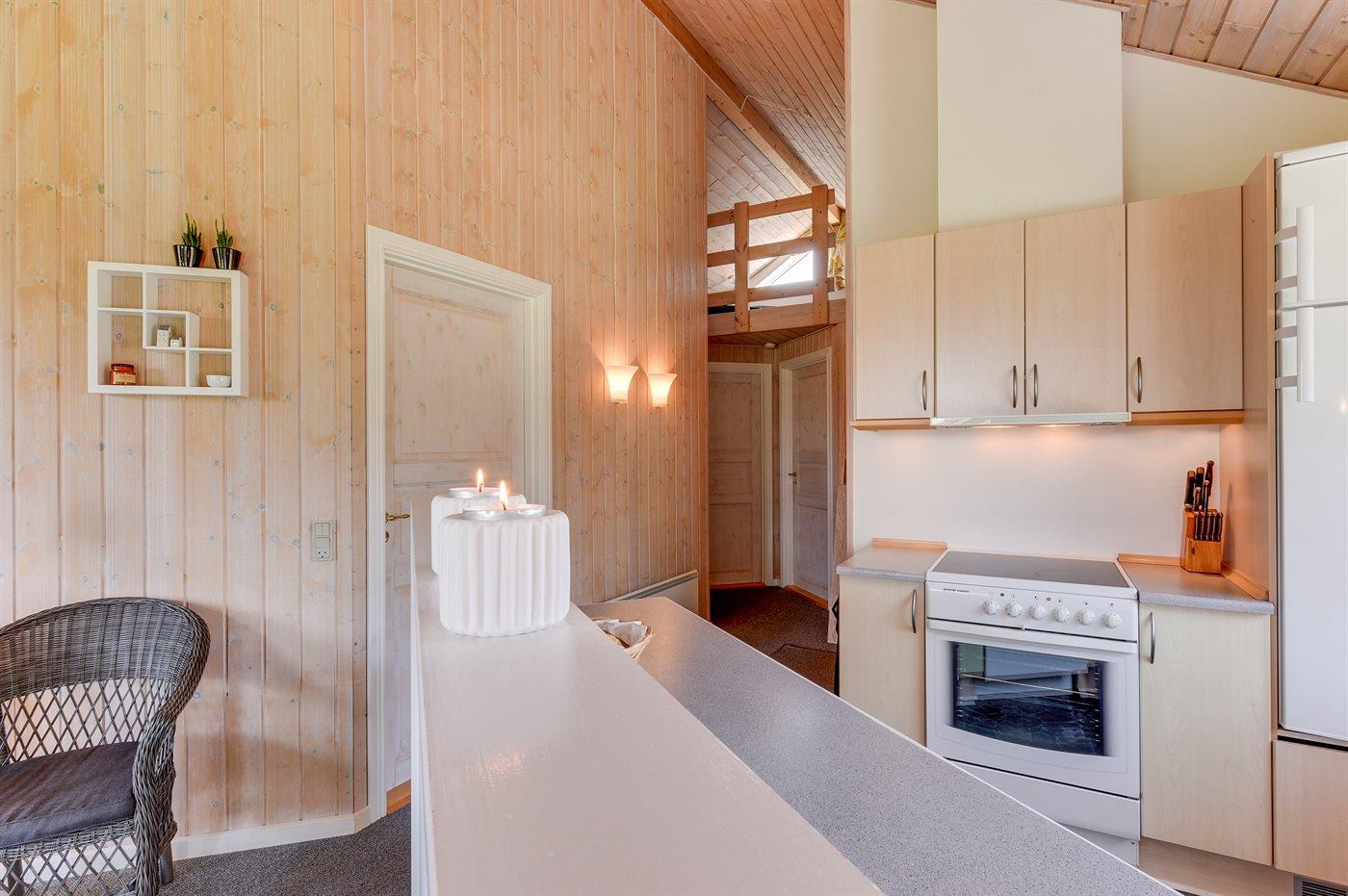 Køkkenet er udstyret med 1 køleskab. Der er 4 keramiske kogeplader, varmluftovn, mikrobølgeovn samt opvaskemaskine.