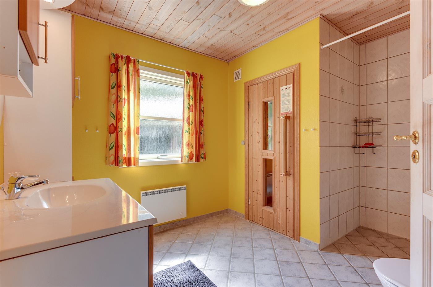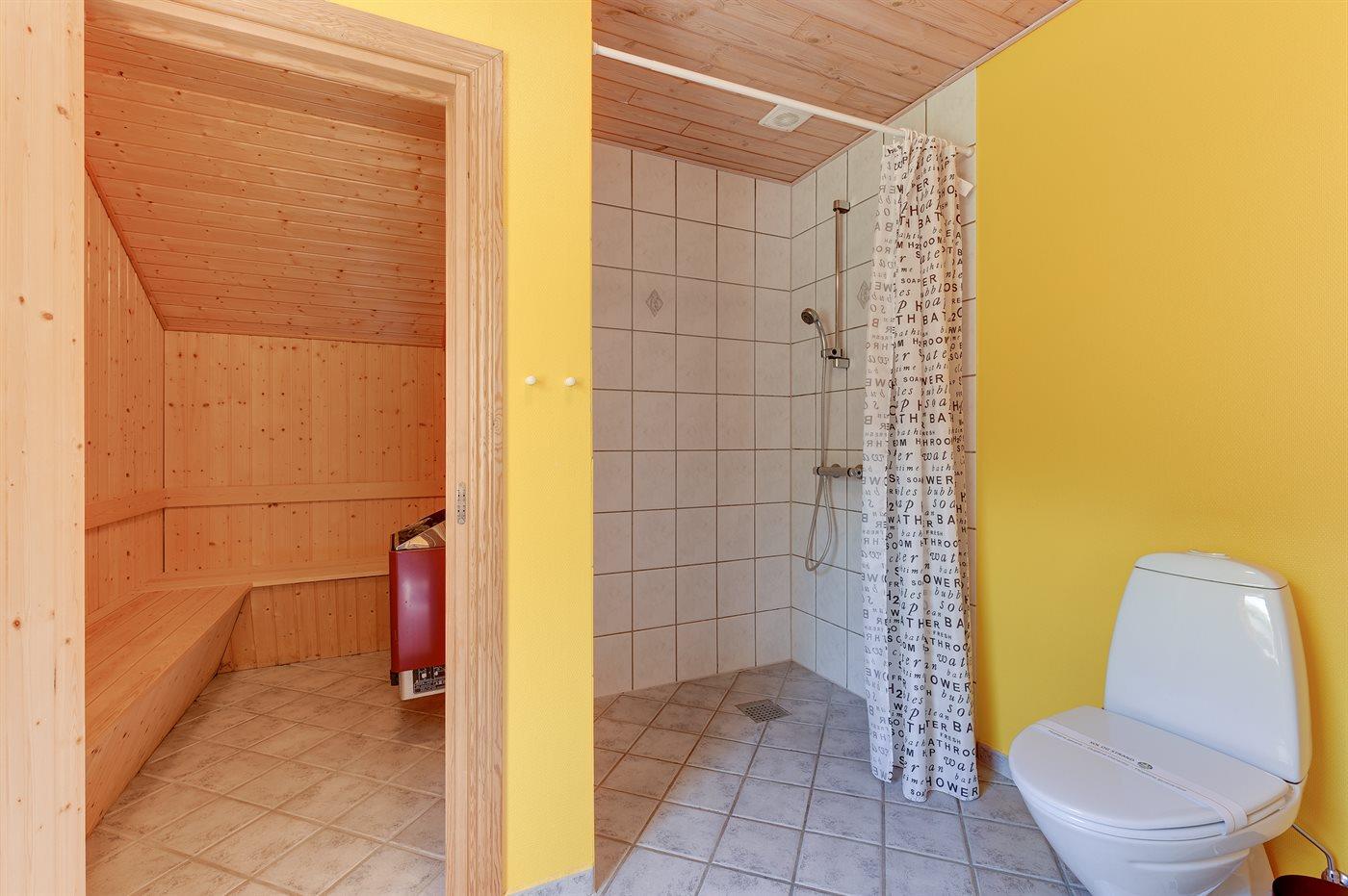 Der er 1 badeværelse med bruseniche og 1 toilet.. Der er gulvvarme på 1 badeværelse. I saunaen er der mulighed for afslapning.