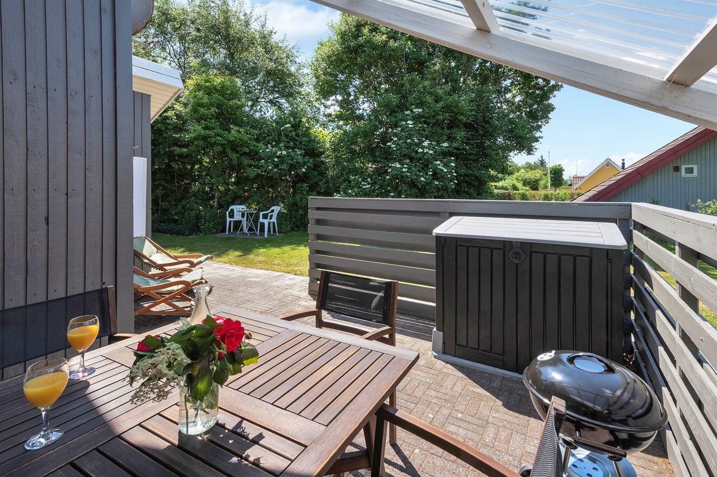 Ferieboligen er beliggende på en 225 m² stor naturgrund. Der er 6200 m til havet. Der er 1500 m til fjorden. Nærmeste forretning er beliggende i en afstand af 1500 m. Til ferieboligen hører 30 m² terrasseareal. Desuden er der 4 m² overdækket terrasse. Der er redskabsrum. Sandkasse. Parkering ved ferieboligen.