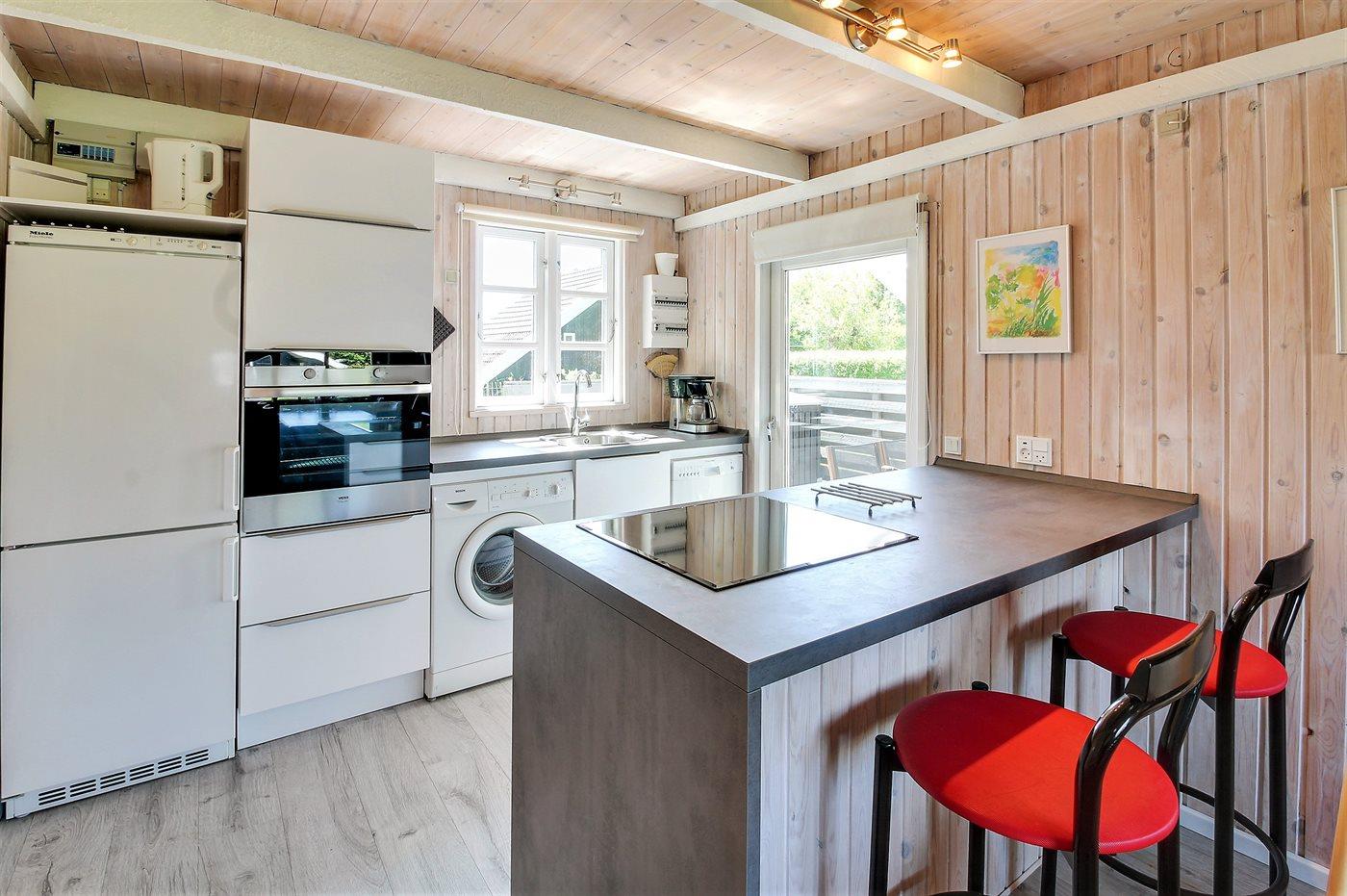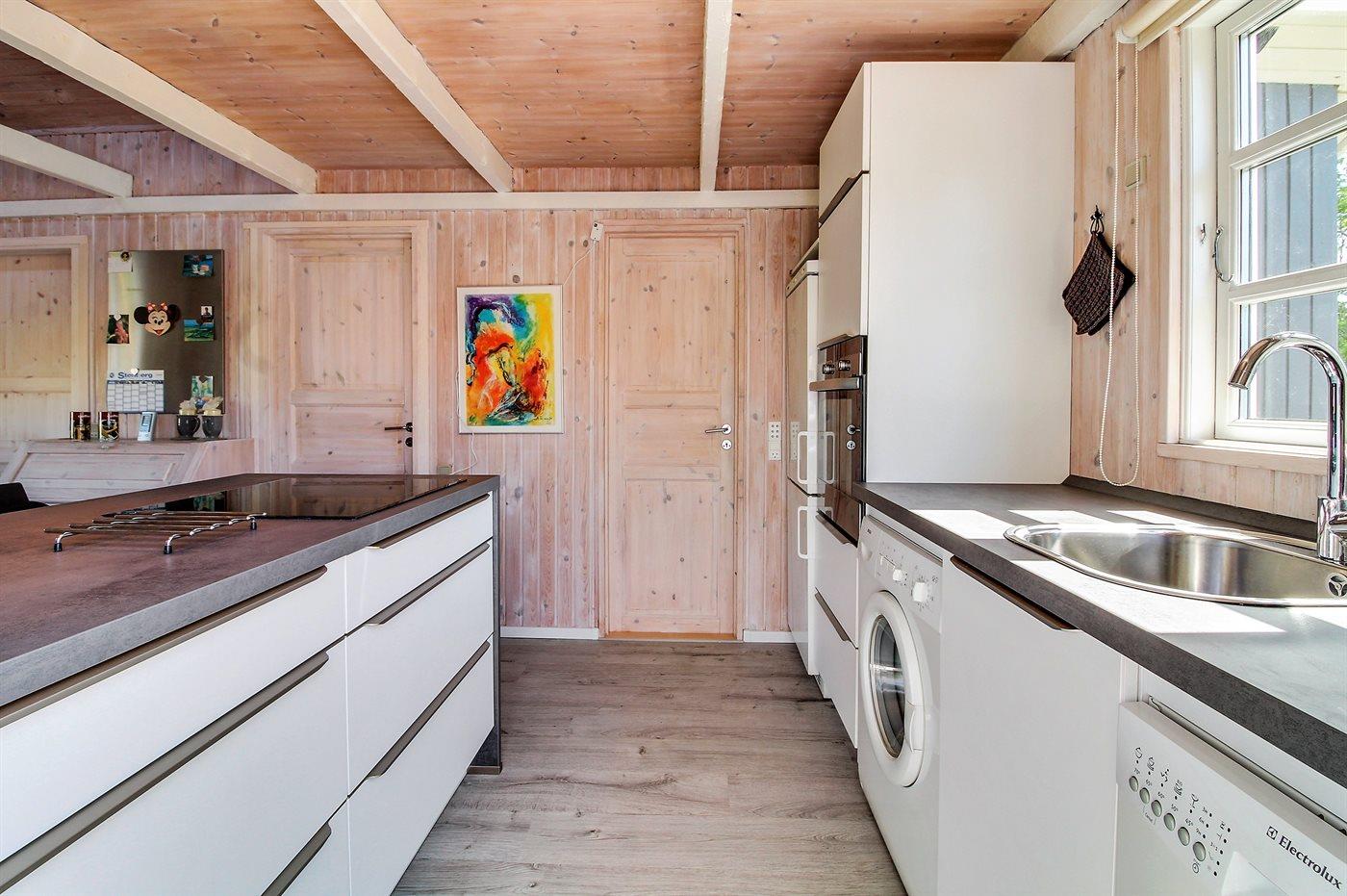 Køkkenet er udstyret med 1 køleskab. Der er 3 elkogeplader, bageovn, mikrobølgeovn samt opvaskemaskine.
