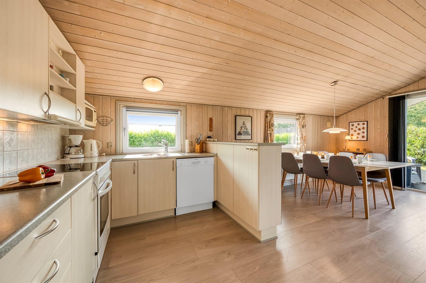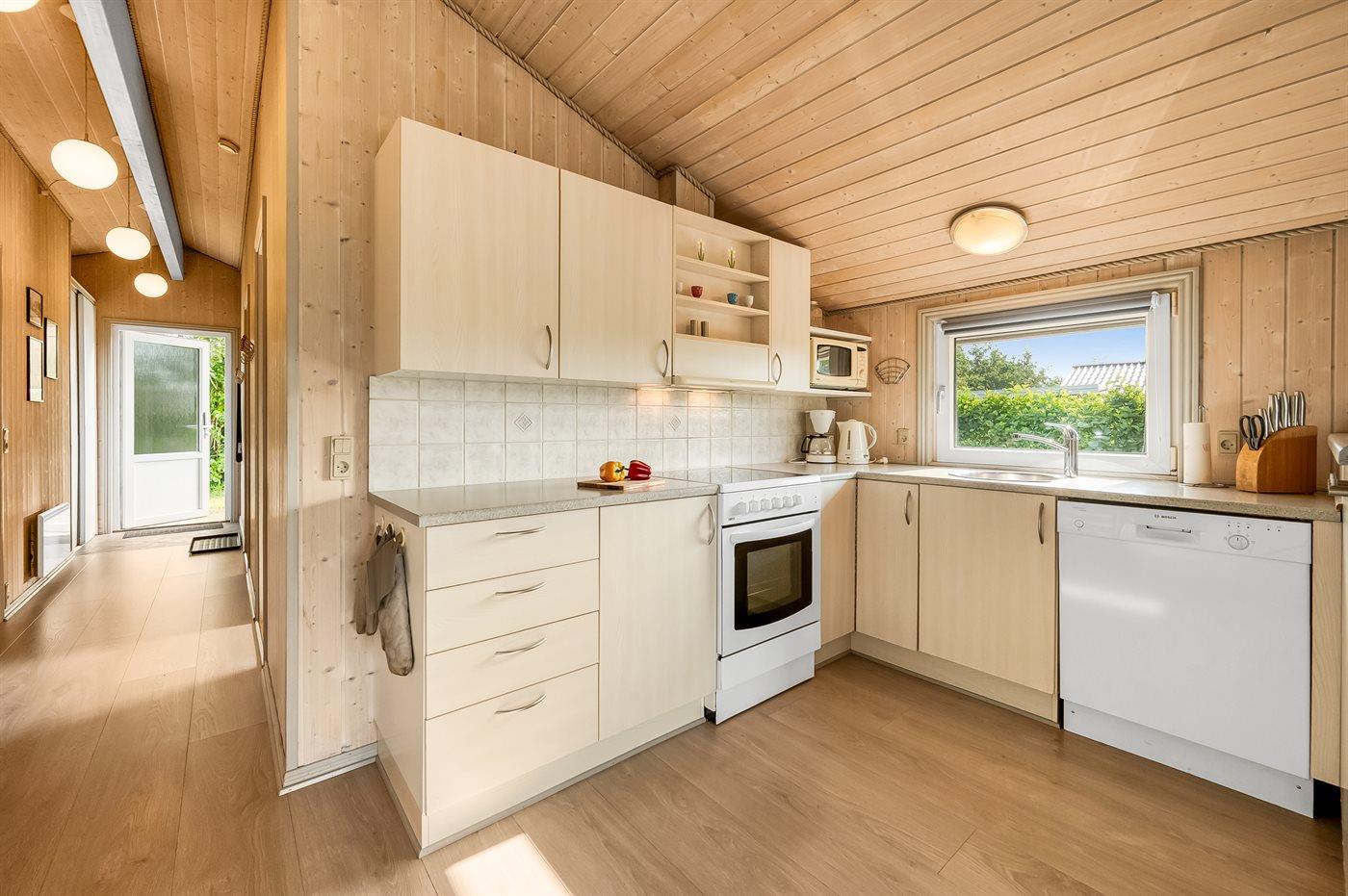 Køkkenet er udstyret med 1 køleskab. Der er 4 keramiske kogeplader, varmluftovn, mikrobølgeovn samt opvaskemaskine.