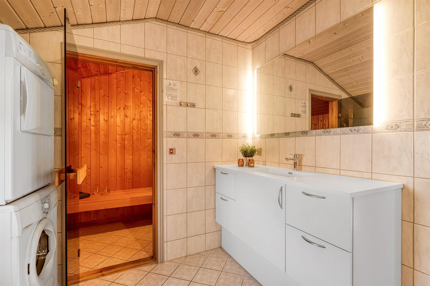 Der er 1 badeværelse med bruseniche og 1 toilet.. Der er gulvvarme på 1 badeværelse. I saunaen er der mulighed for afslapning.