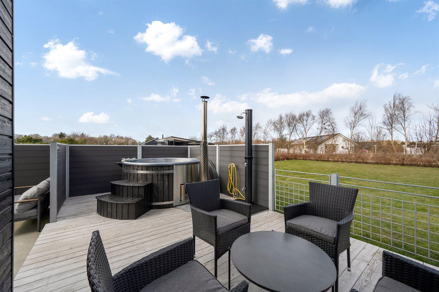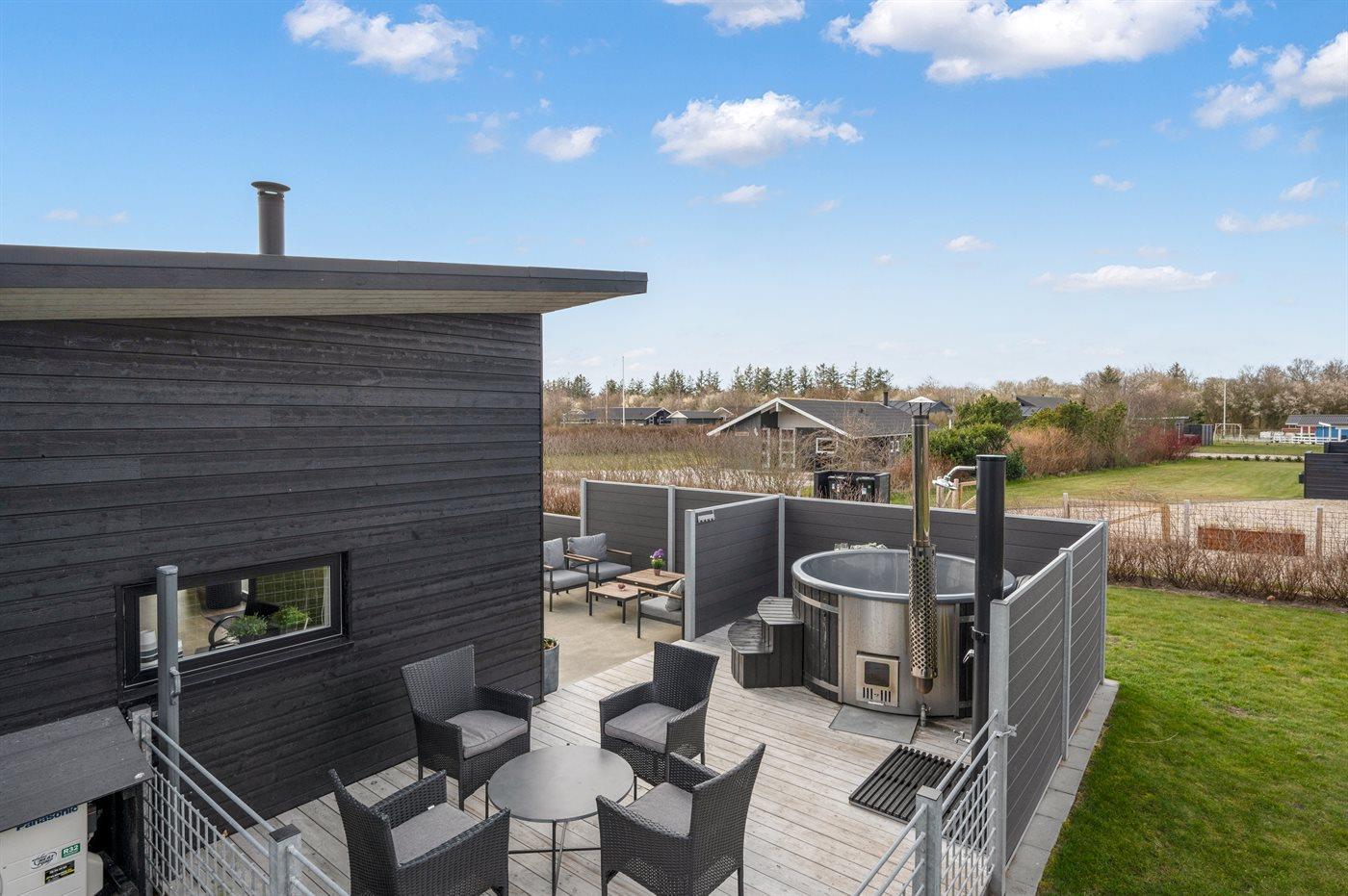 Et skønt sommerhus beliggende i det populære ferieområde ved Bork Havn. Til huset hører en helt fantastisk terrasse med et 6-pers. vildmarksbad, som kan benyttes året rundt.