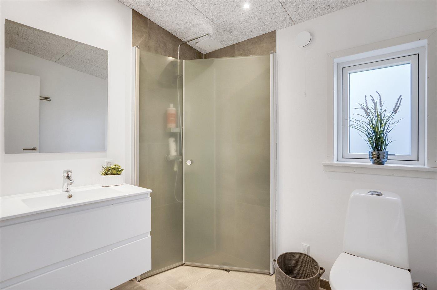 Der er 1 badeværelse med bruseniche og 2 toiletter, heraf 1 gæstetoilet. Der er gulvvarme på 1 badeværelse. Der er gulvvarme på gæstetoilettet.