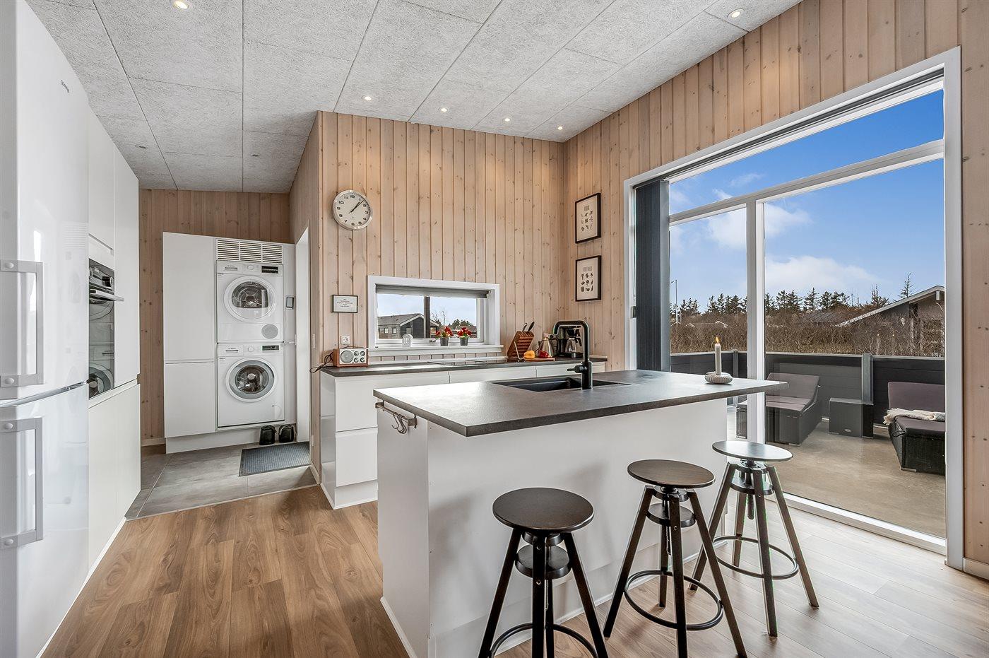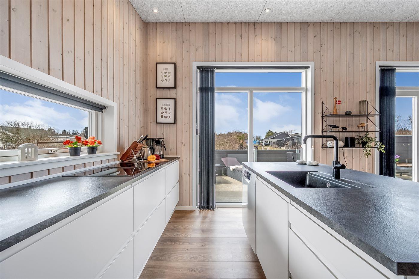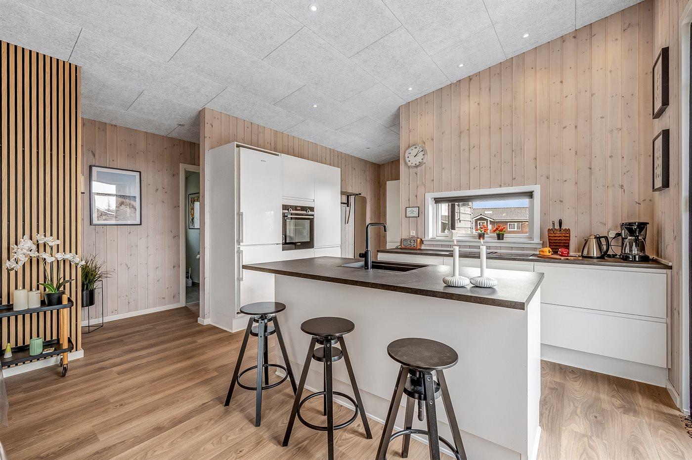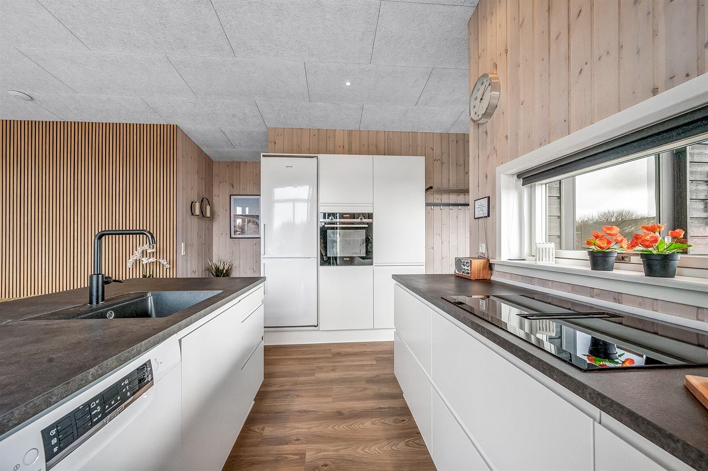 Køkkenet er udstyret med 1 køleskab. Der er 4 induktionskogeplader, varmluftovn, mikrobølgeovn samt opvaskemaskine.