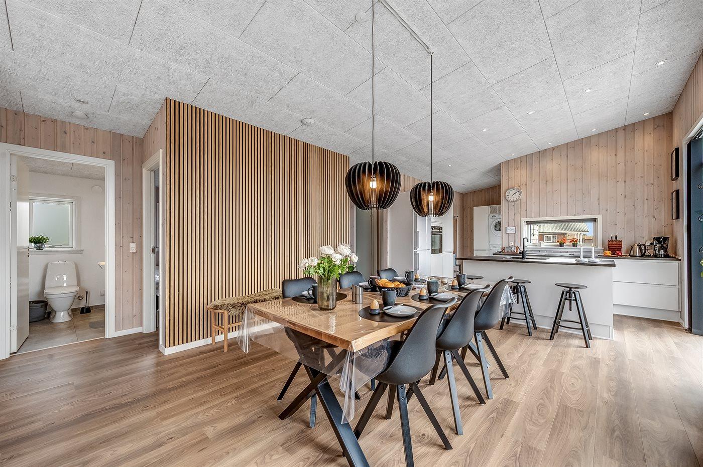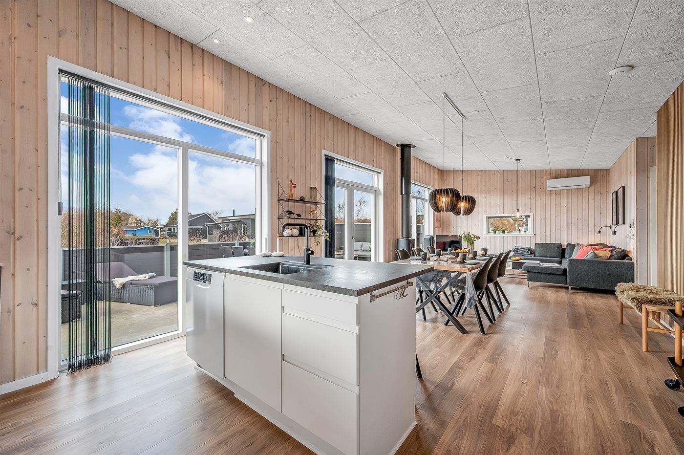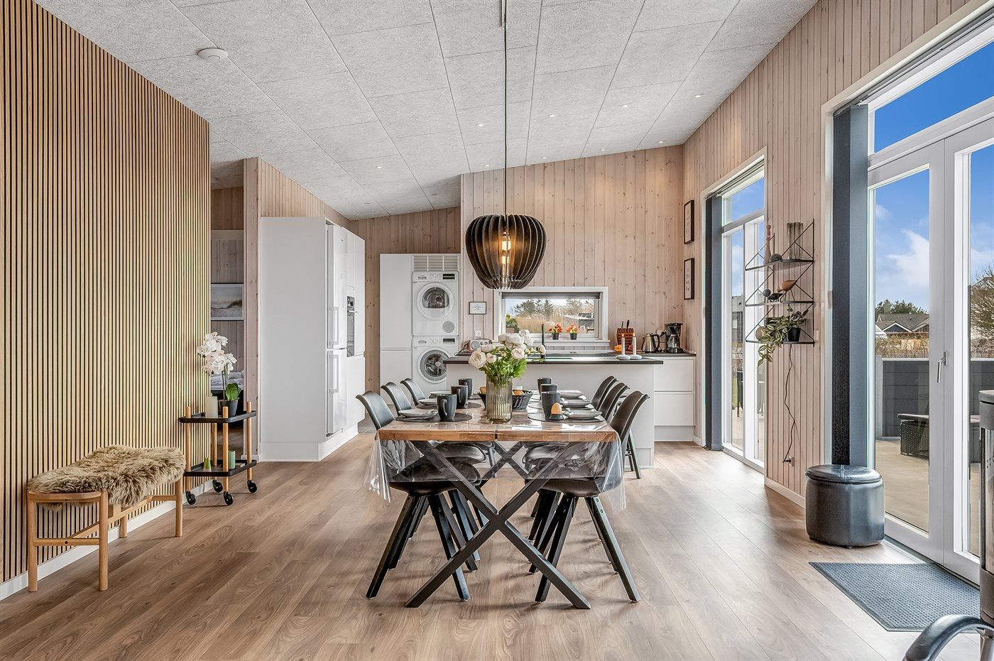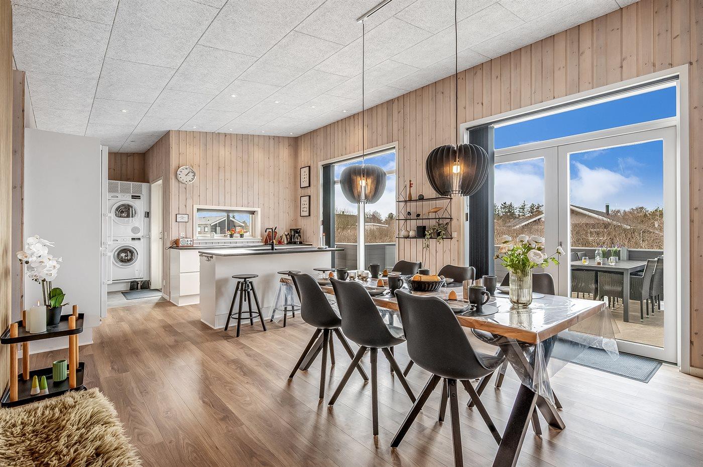Køkkenet er udstyret med 1 køleskab. Der er 4 induktionskogeplader, varmluftovn, mikrobølgeovn samt opvaskemaskine.