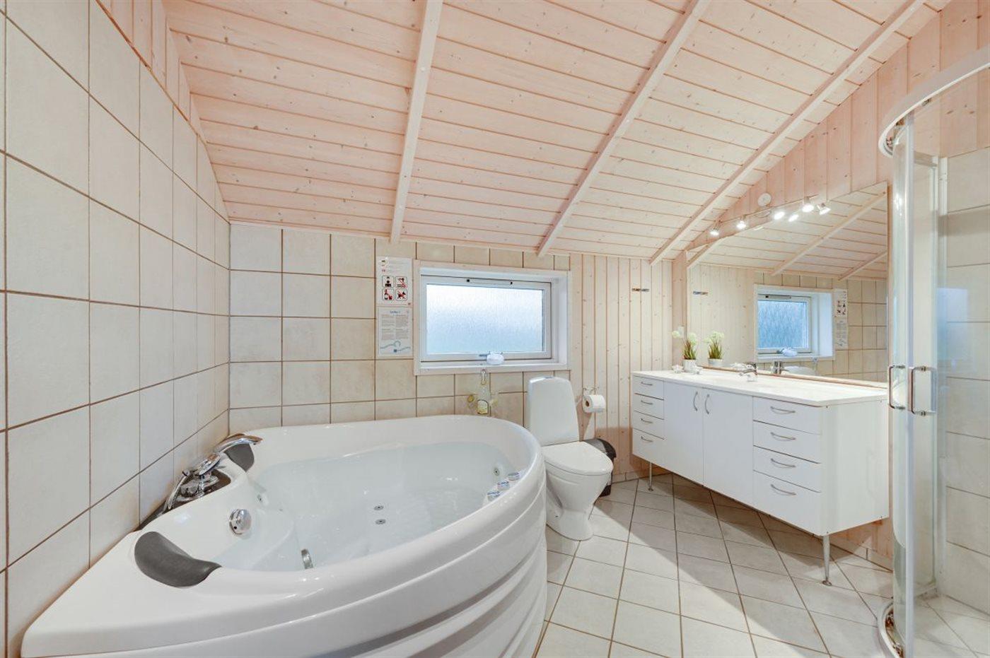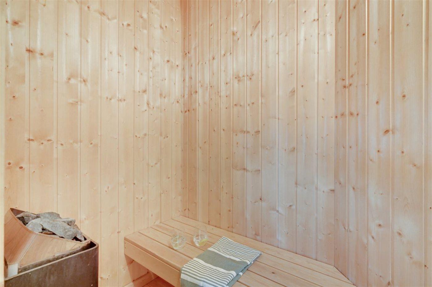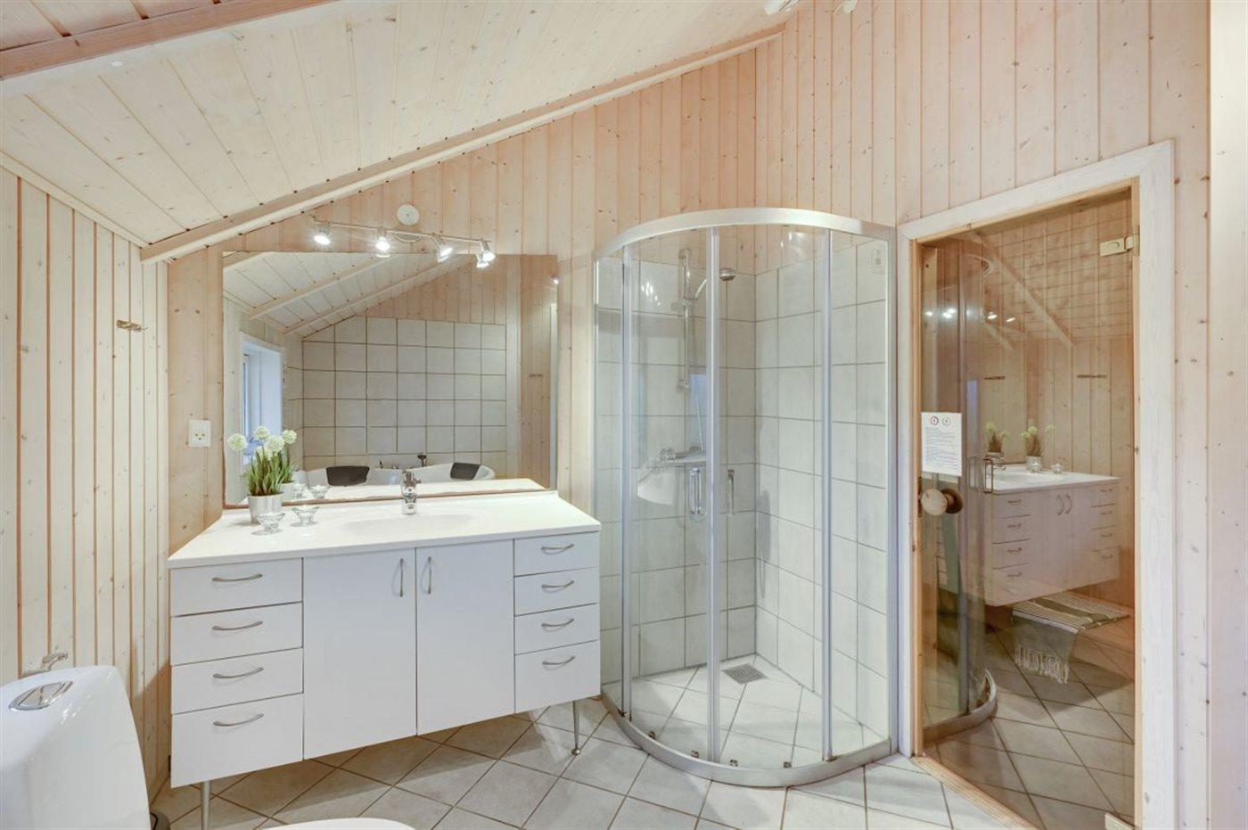 Der er 2 badeværelser med bruseniche og 2 toiletter. Der er gulvvarme på 2 badeværelser. I saunaen er der mulighed for afslapning.
