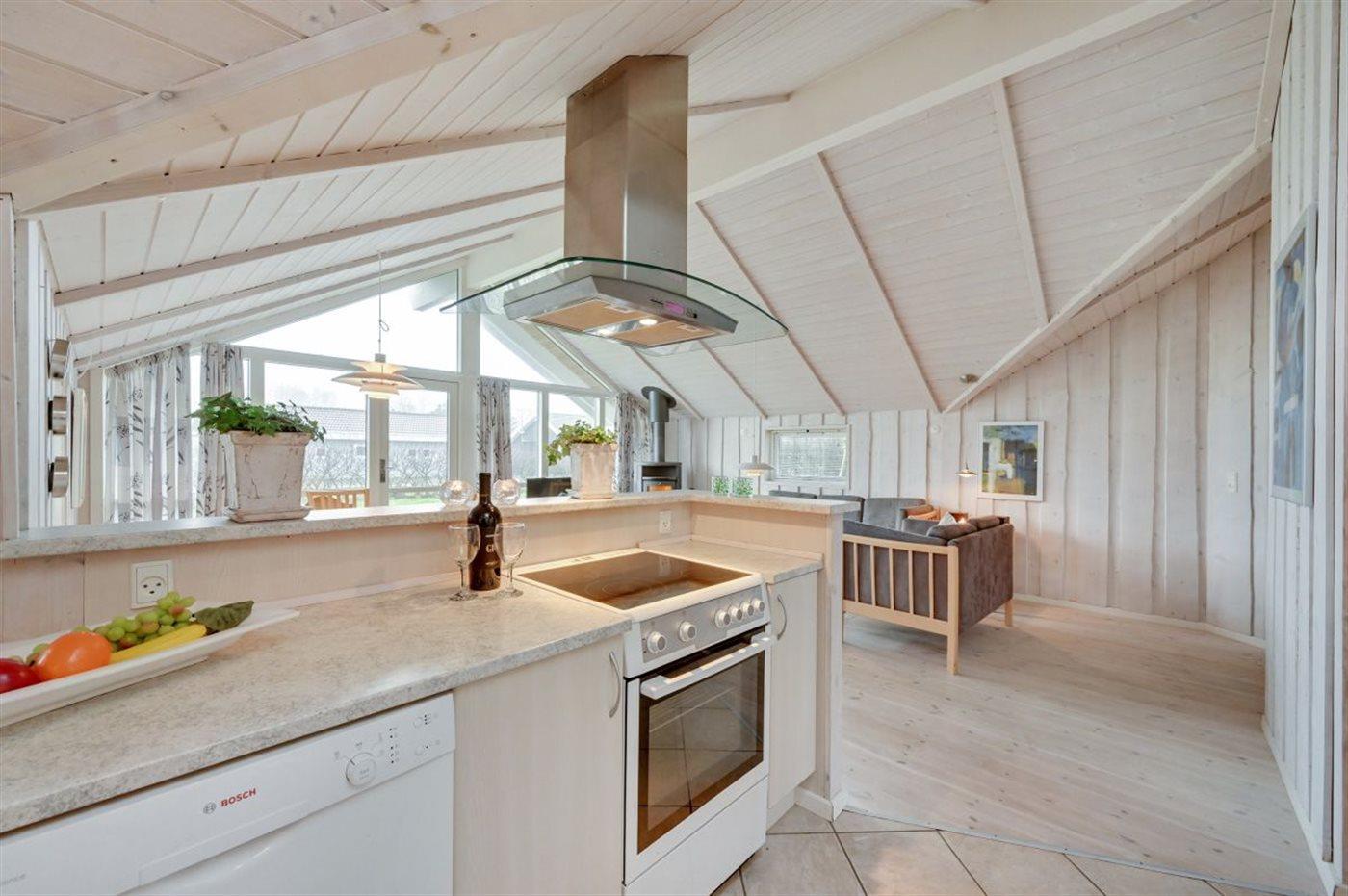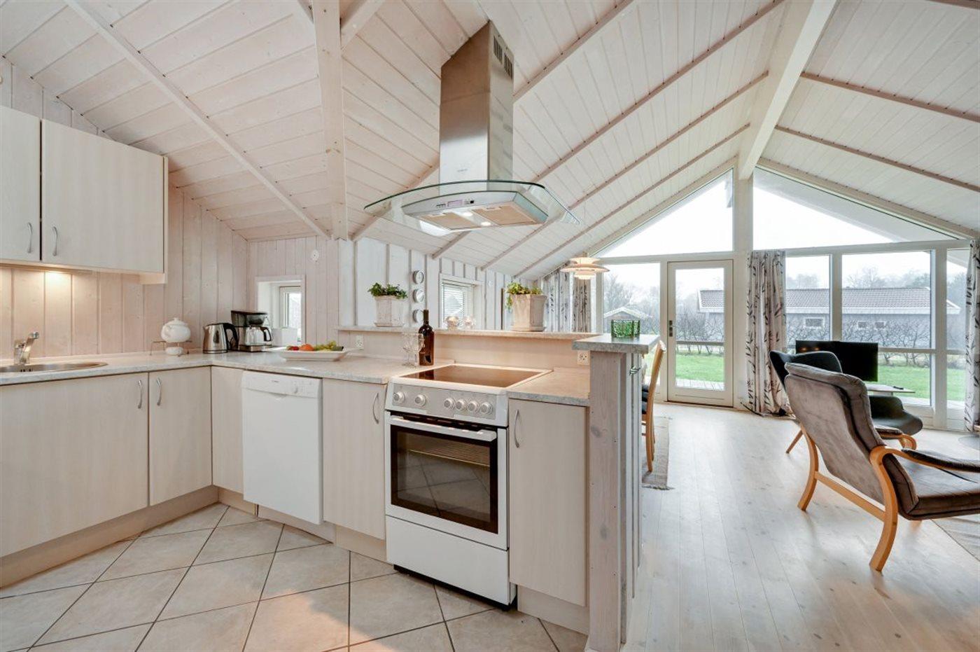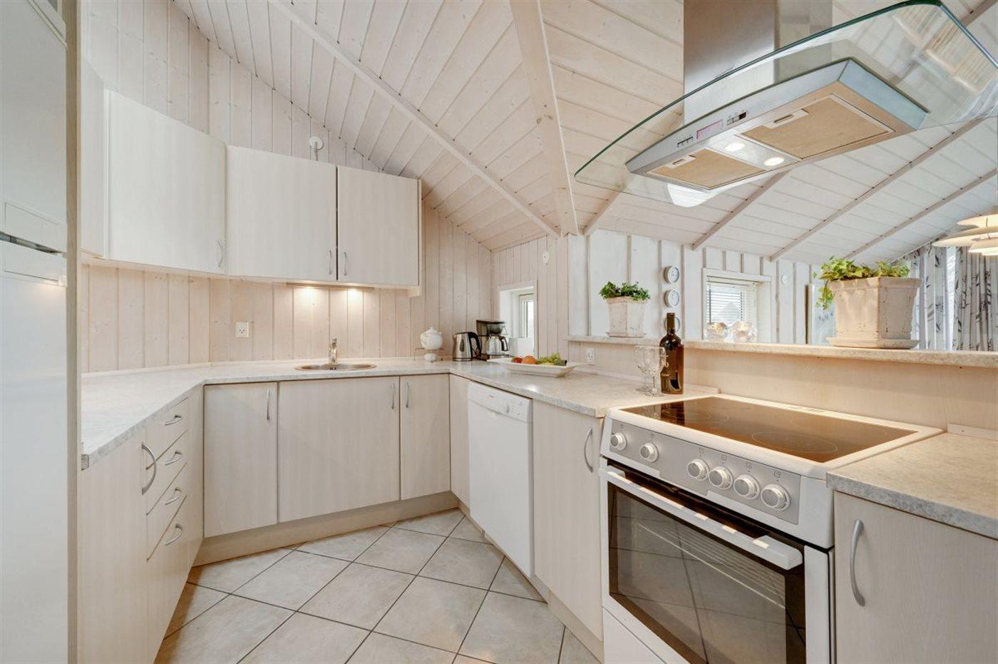 Køkkenet er udstyret med 1 køleskab. Der er 4 keramiske kogeplader, varmluftovn, mikrobølgeovn samt opvaskemaskine.