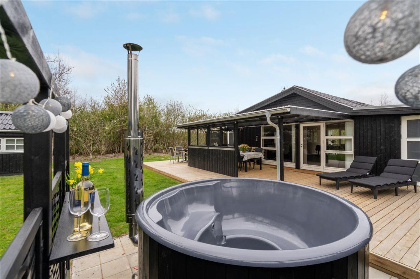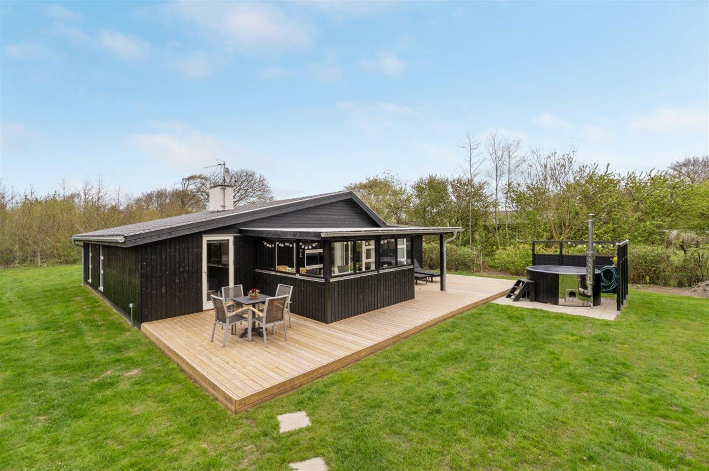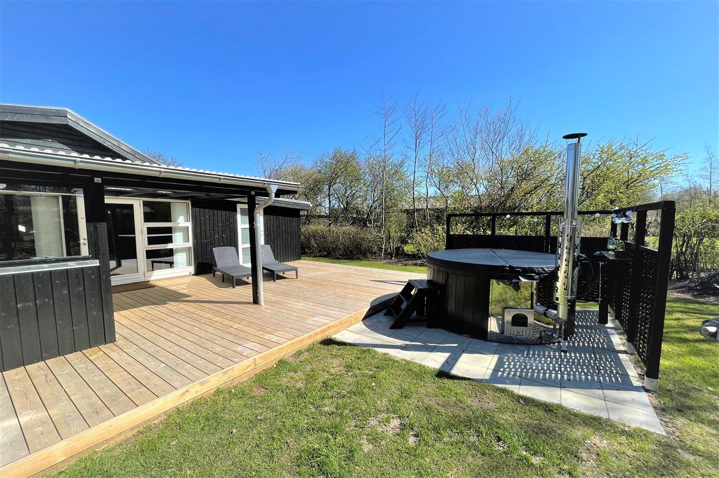 Nær Bork Havn ligger dette flotte og i 2022 totalrenoverede sommerhus. På husets til dels overdækkede terrasse finder I bl.a. et skønt vildmarksbad til 6-personer, som kan benyttes hele året.