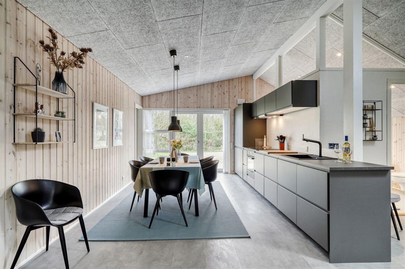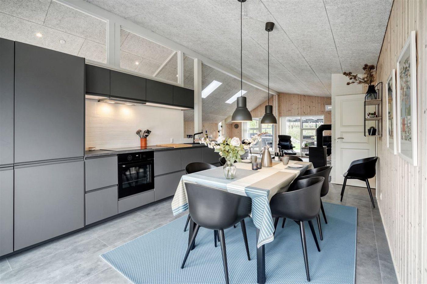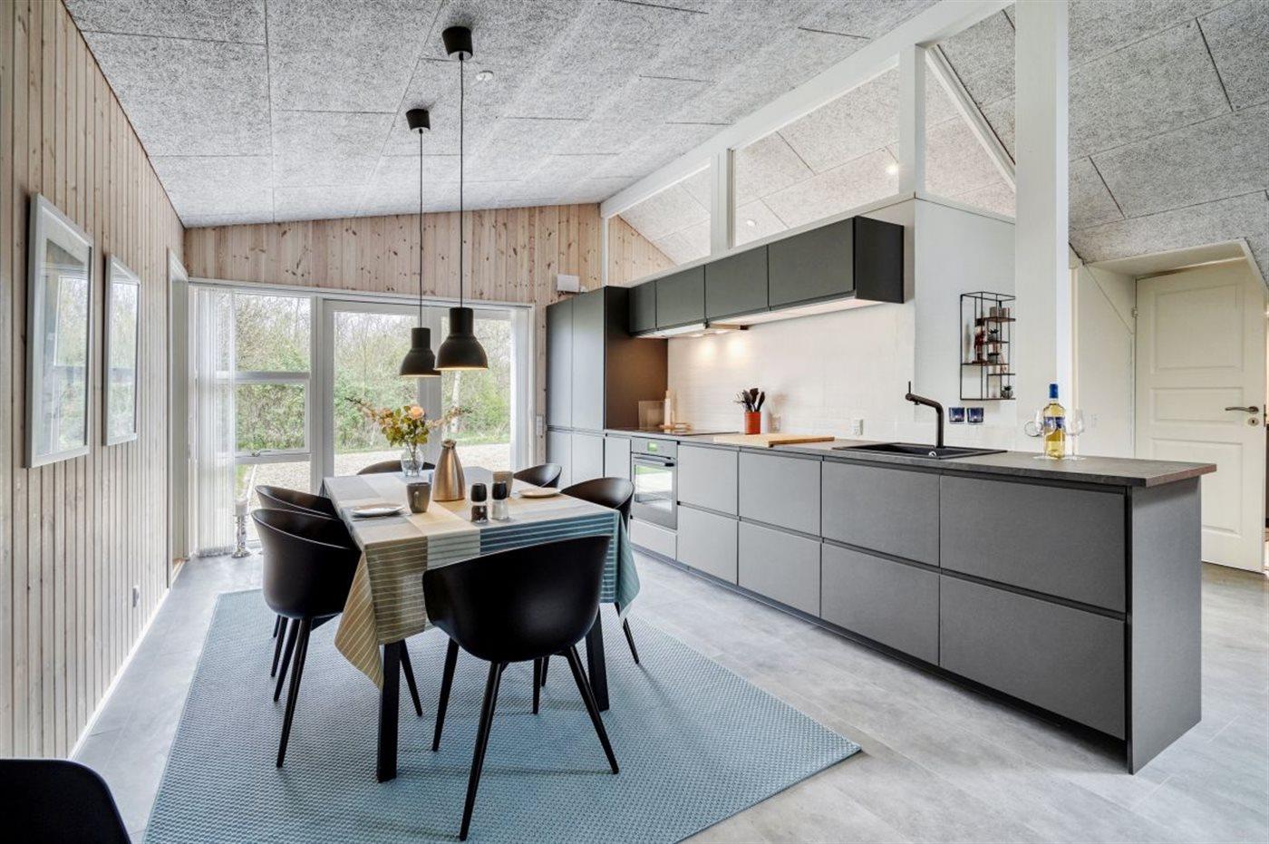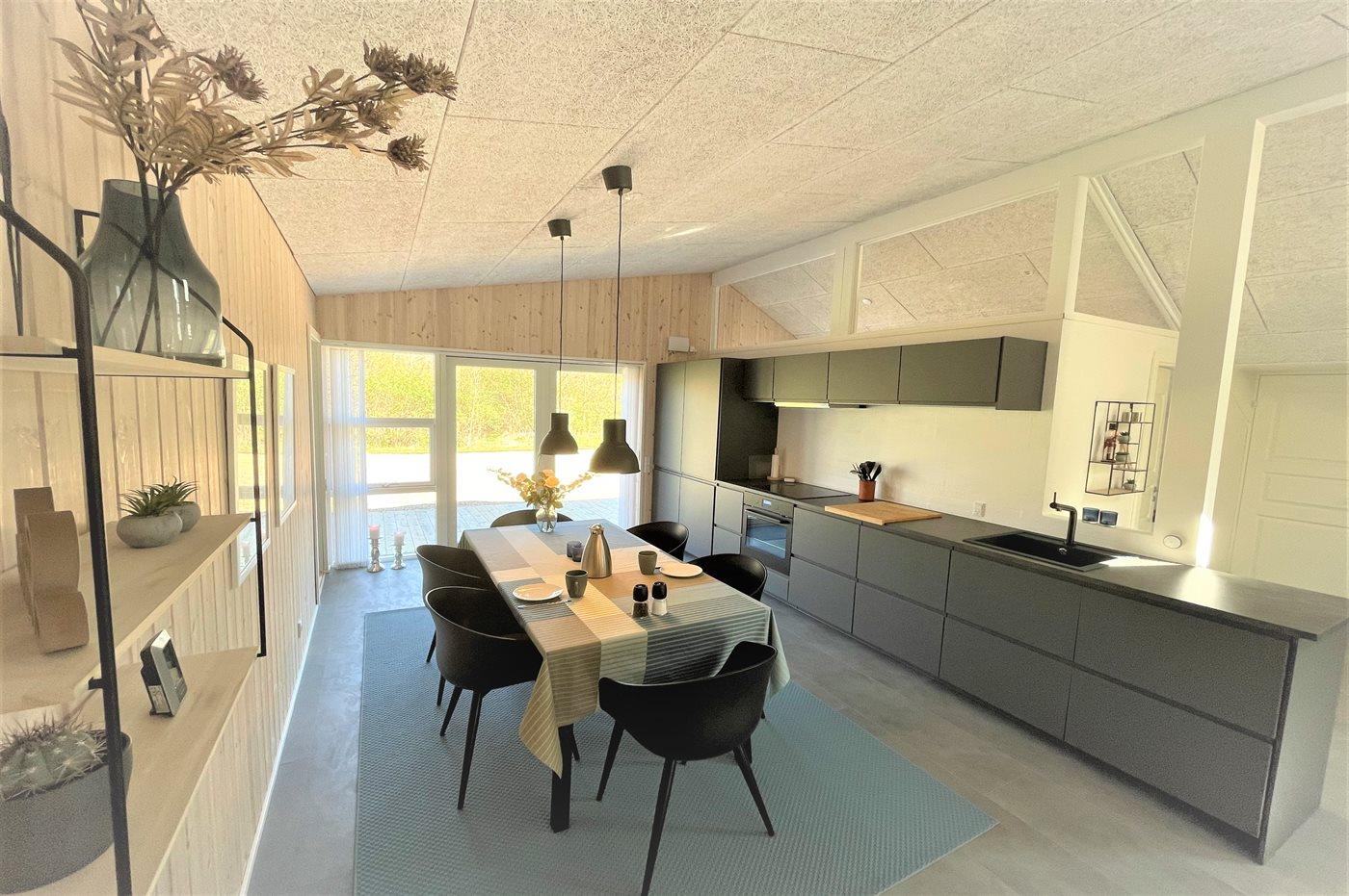 Køkkenet er udstyret med 1 køleskab. Der er 4 keramiske kogeplader, varmluftovn, mikrobølgeovn samt opvaskemaskine.