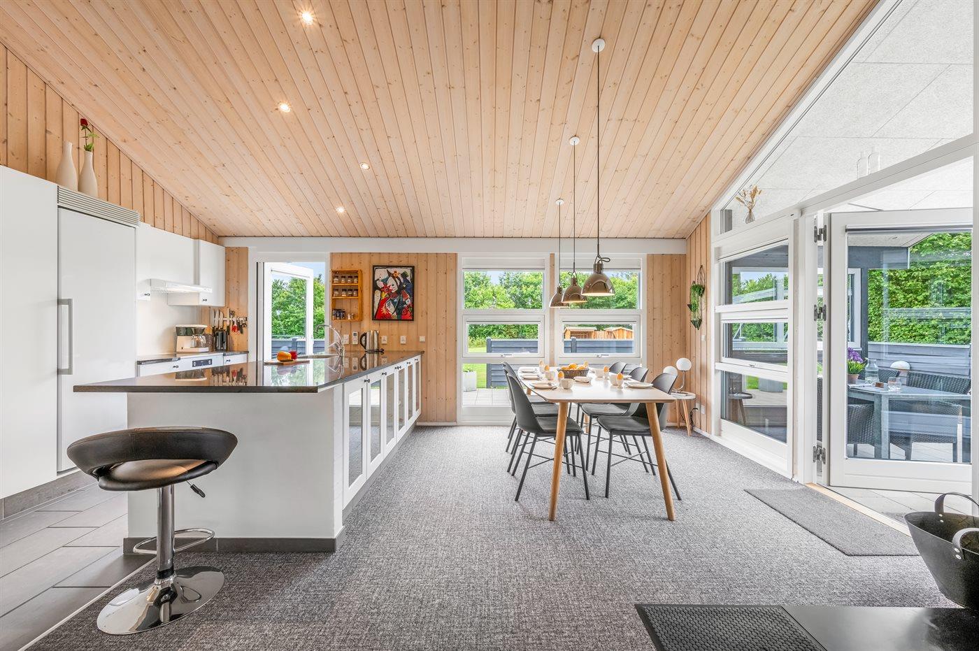Køkkenet er udstyret med 1 køleskab. Der er 4 induktionskogeplader, varmluftovn, mikrobølgeovn samt opvaskemaskine.