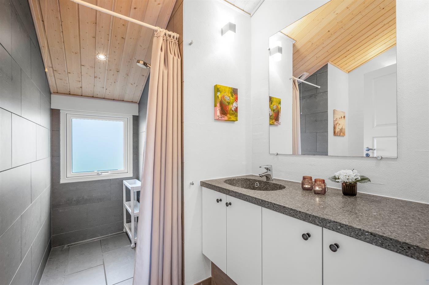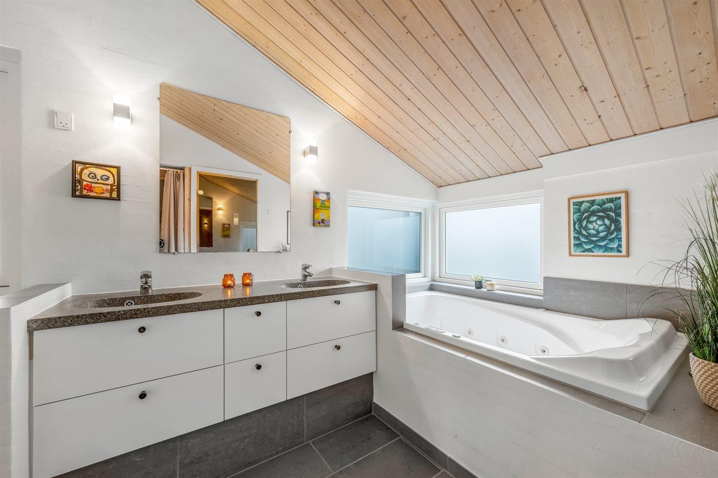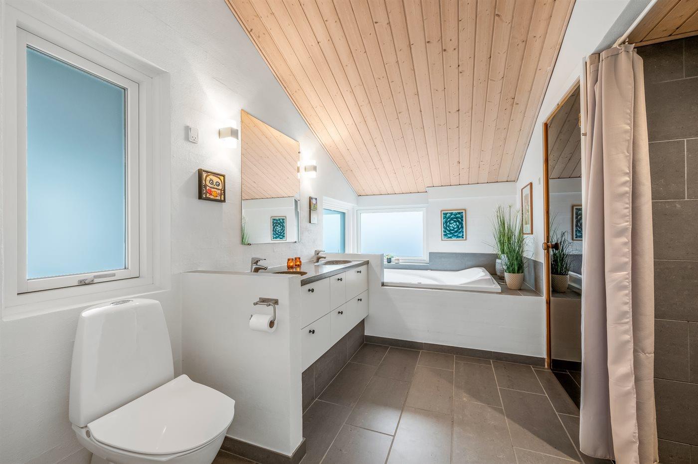 Der er 2 badeværelser med bruseniche og 2 toiletter. Der er gulvvarme på 2 badeværelser. I saunaen er der mulighed for afslapning.