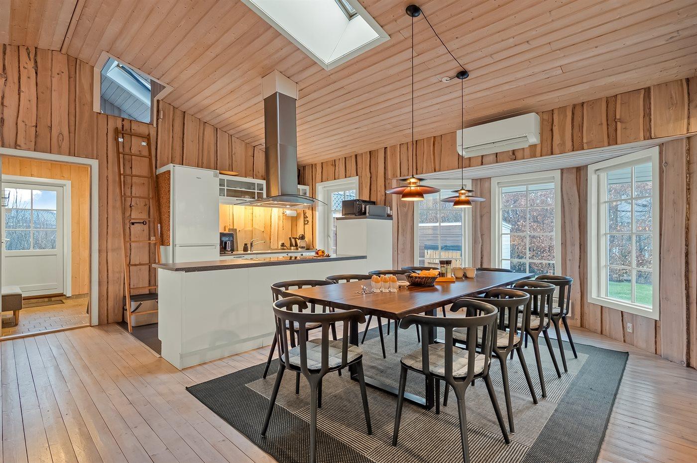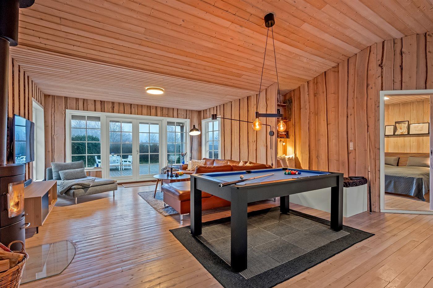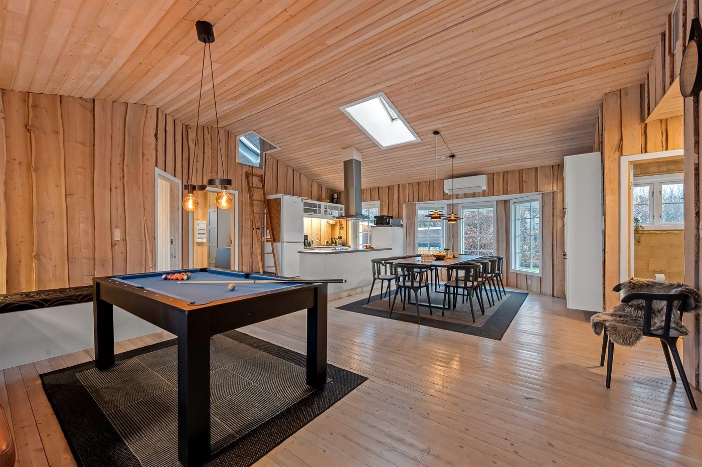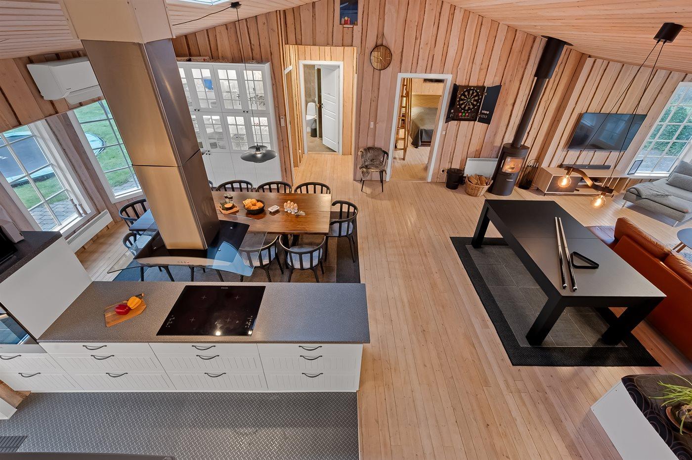 Det lyse køkken-alrum med de store vinduespartier inviterer til hygge og samvær, hvor man kan samles omkring brændeovnen til et brætspil, eller man kan samles i en dyst omkring pool-bordet. Fra køkken-alrummet er der direkte adgang til den dejlige terrasse, hvor du kan nyde skønne timer i det fri med en god bog eller en kryds & tværs.