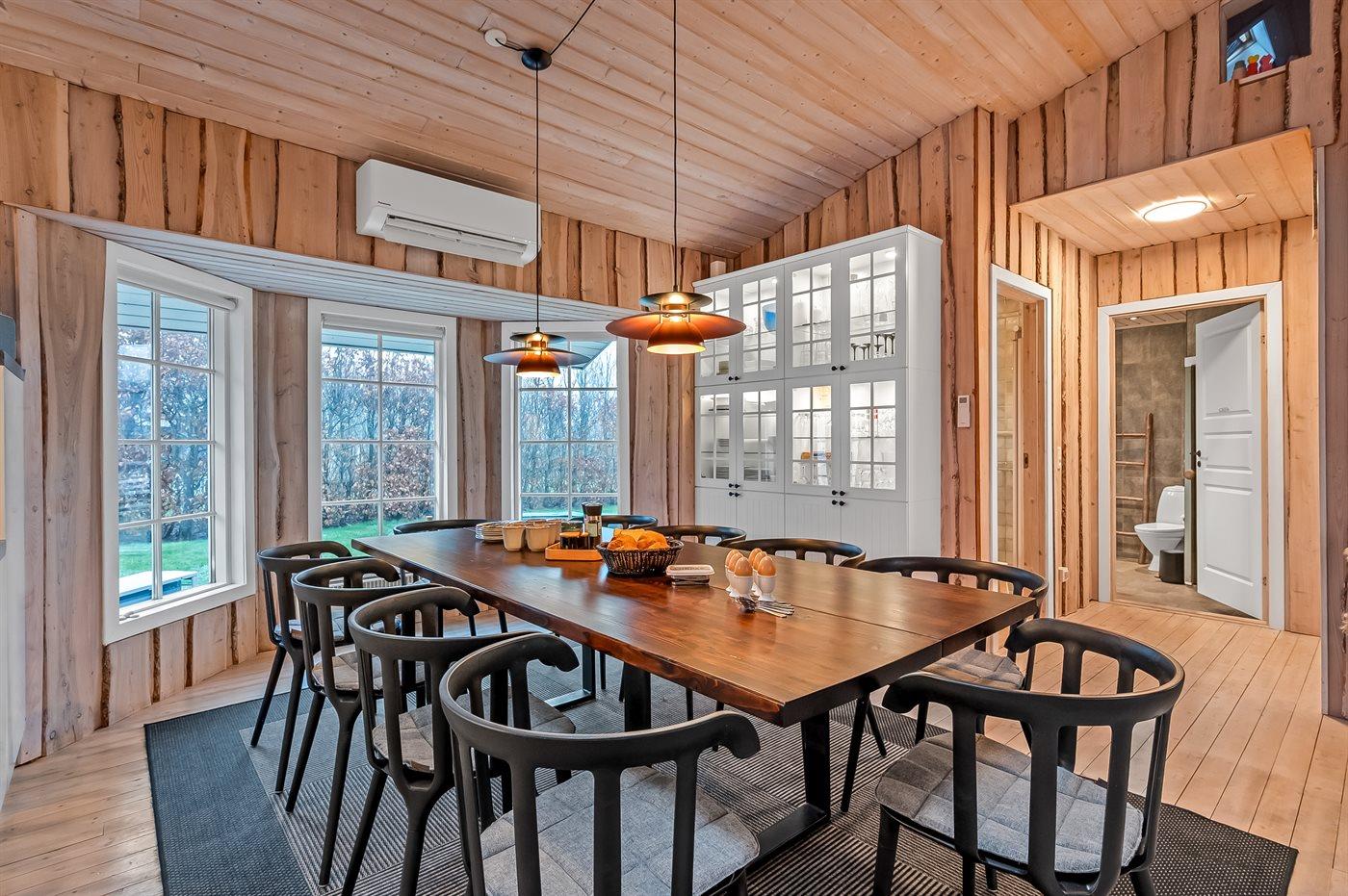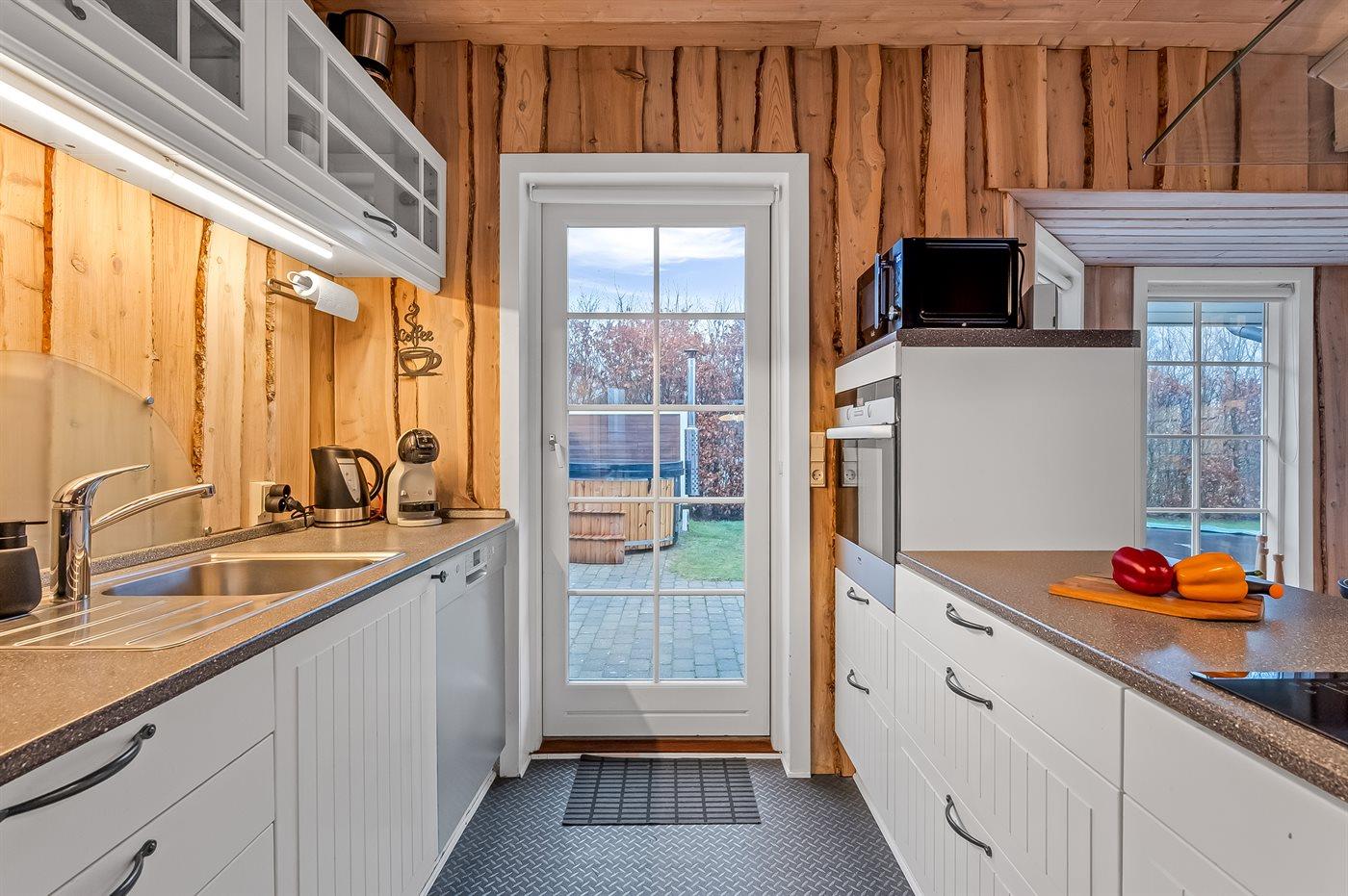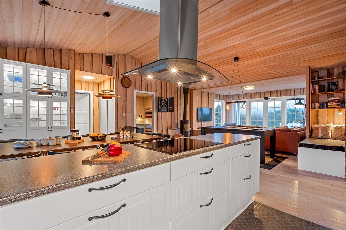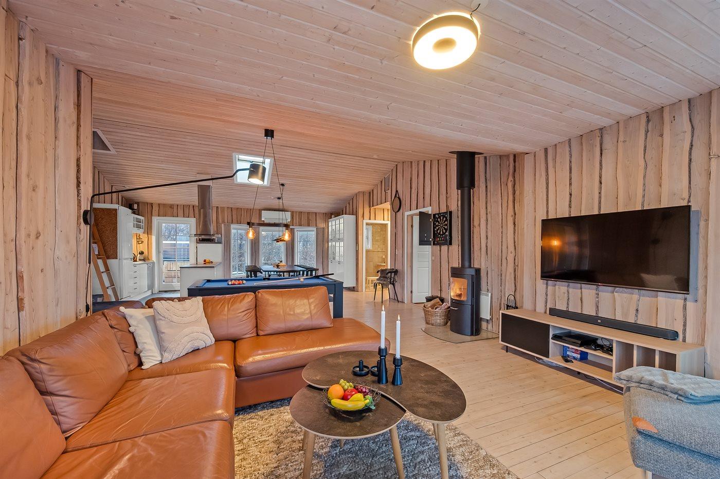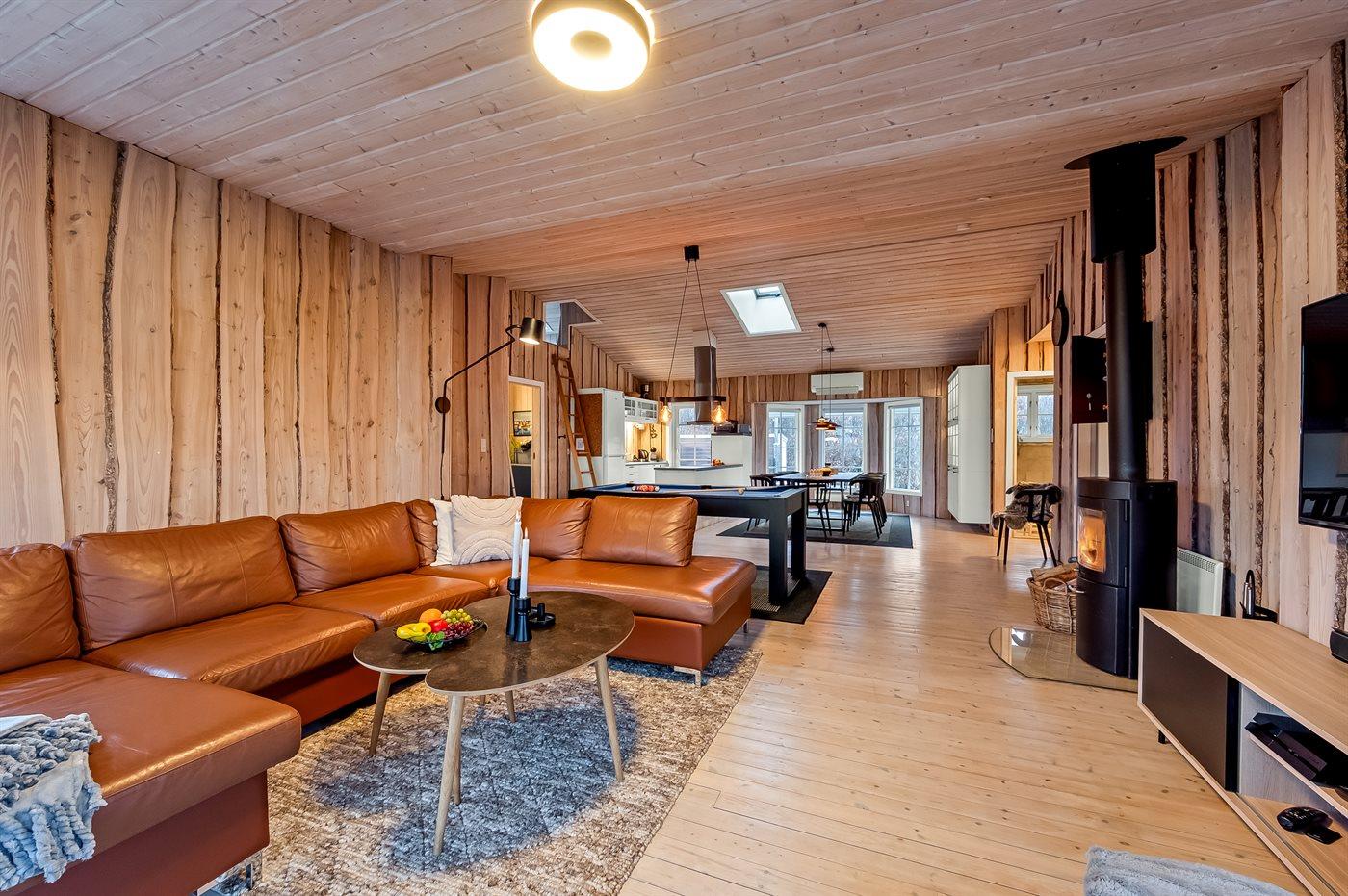 Det lyse køkken-alrum med de store vinduespartier inviterer til hygge og samvær, hvor man kan samles omkring brændeovnen til et brætspil, eller man kan samles i en dyst omkring pool-bordet. Fra køkken-alrummet er der direkte adgang til den dejlige terrasse, hvor du kan nyde skønne timer i det fri med en god bog eller en kryds & tværs.