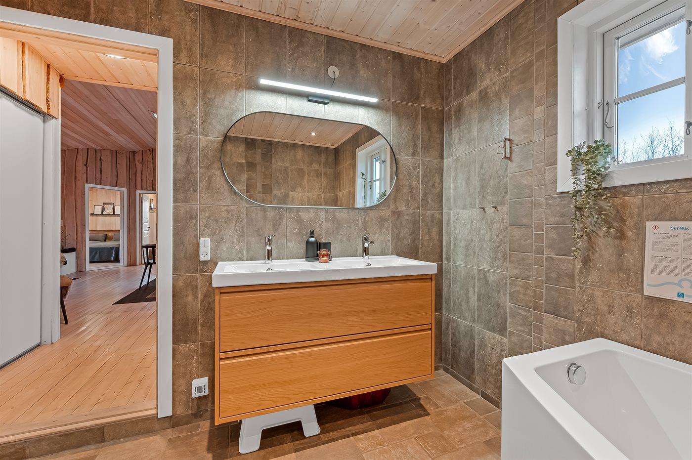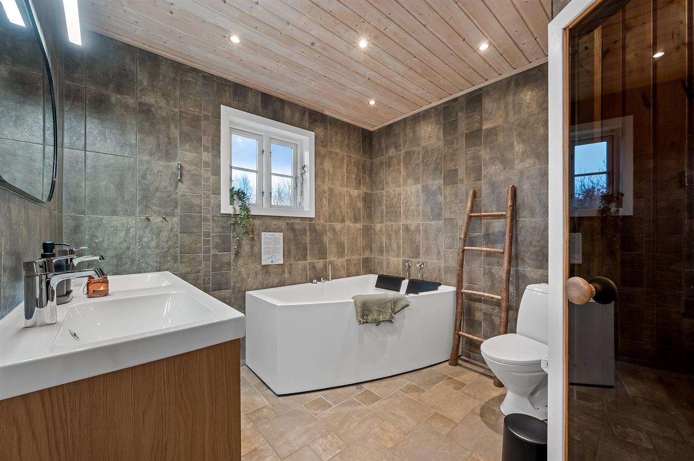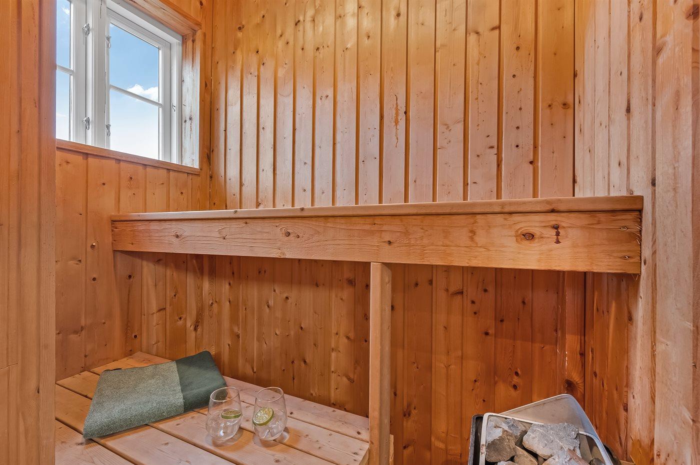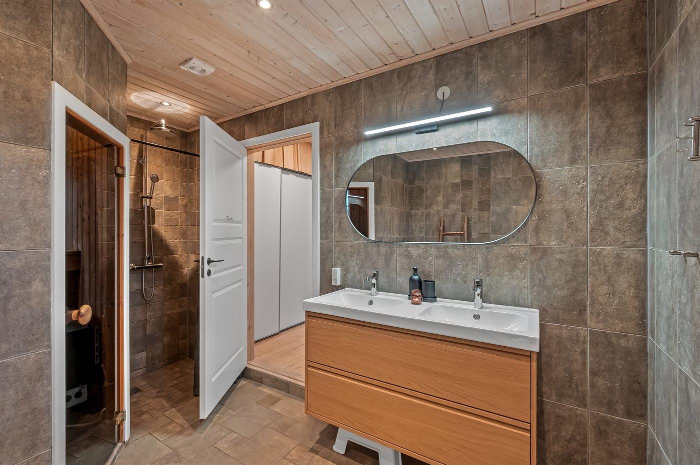 Der er 2 badeværelser med bruseniche og 2 toiletter. Der er gulvvarme på 2 badeværelser. I saunaen er der mulighed for afslapning.