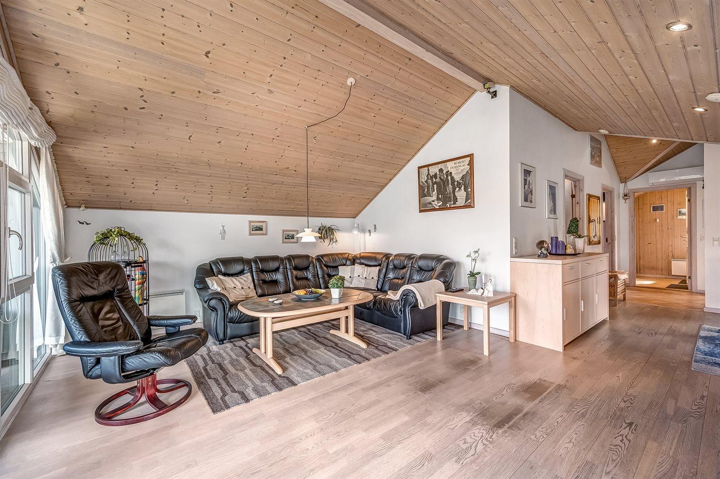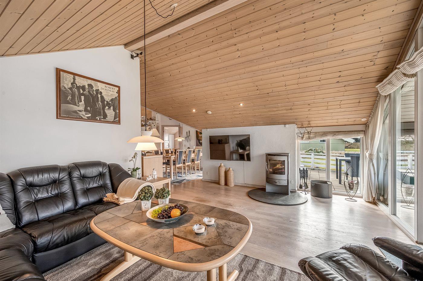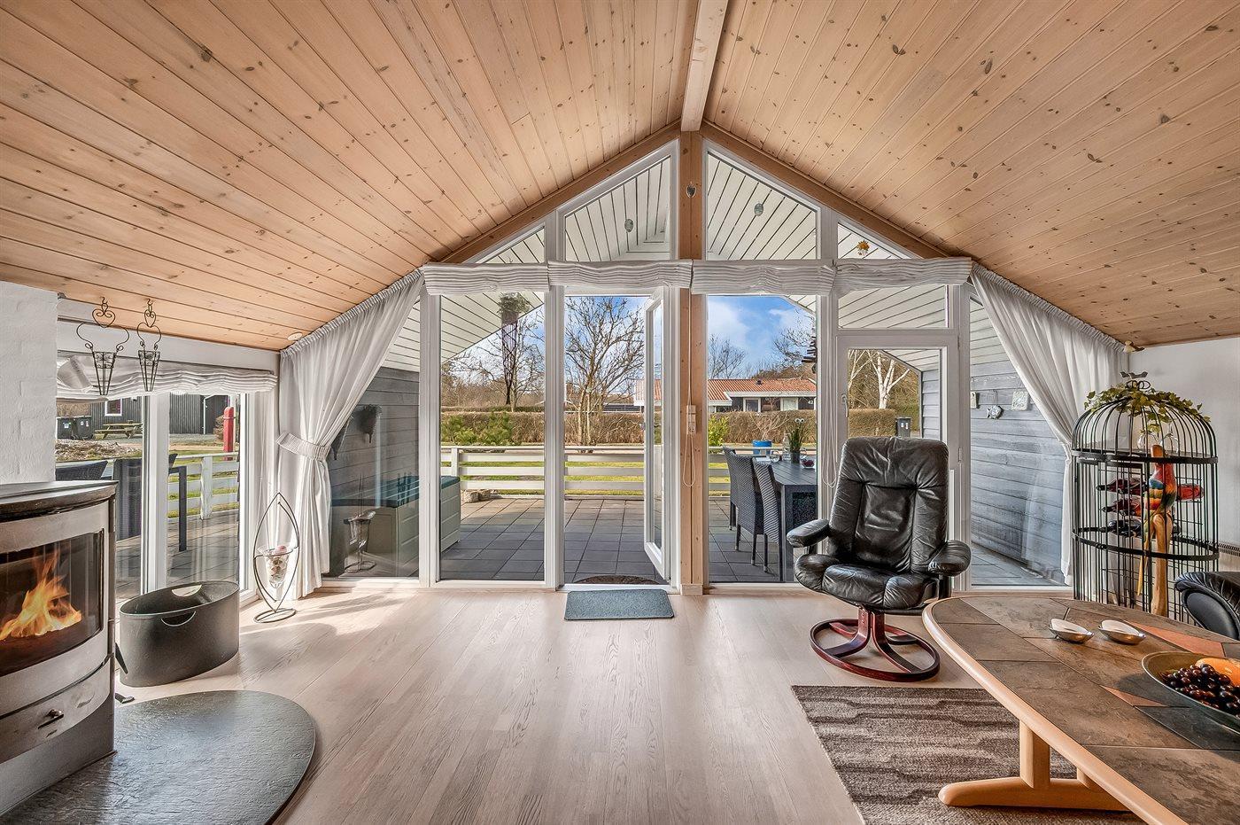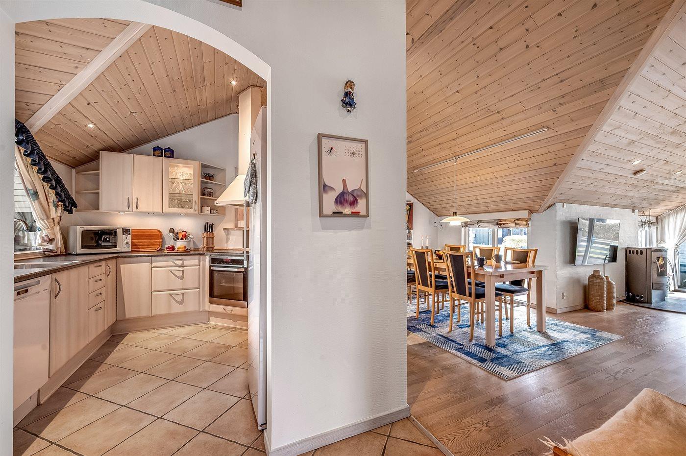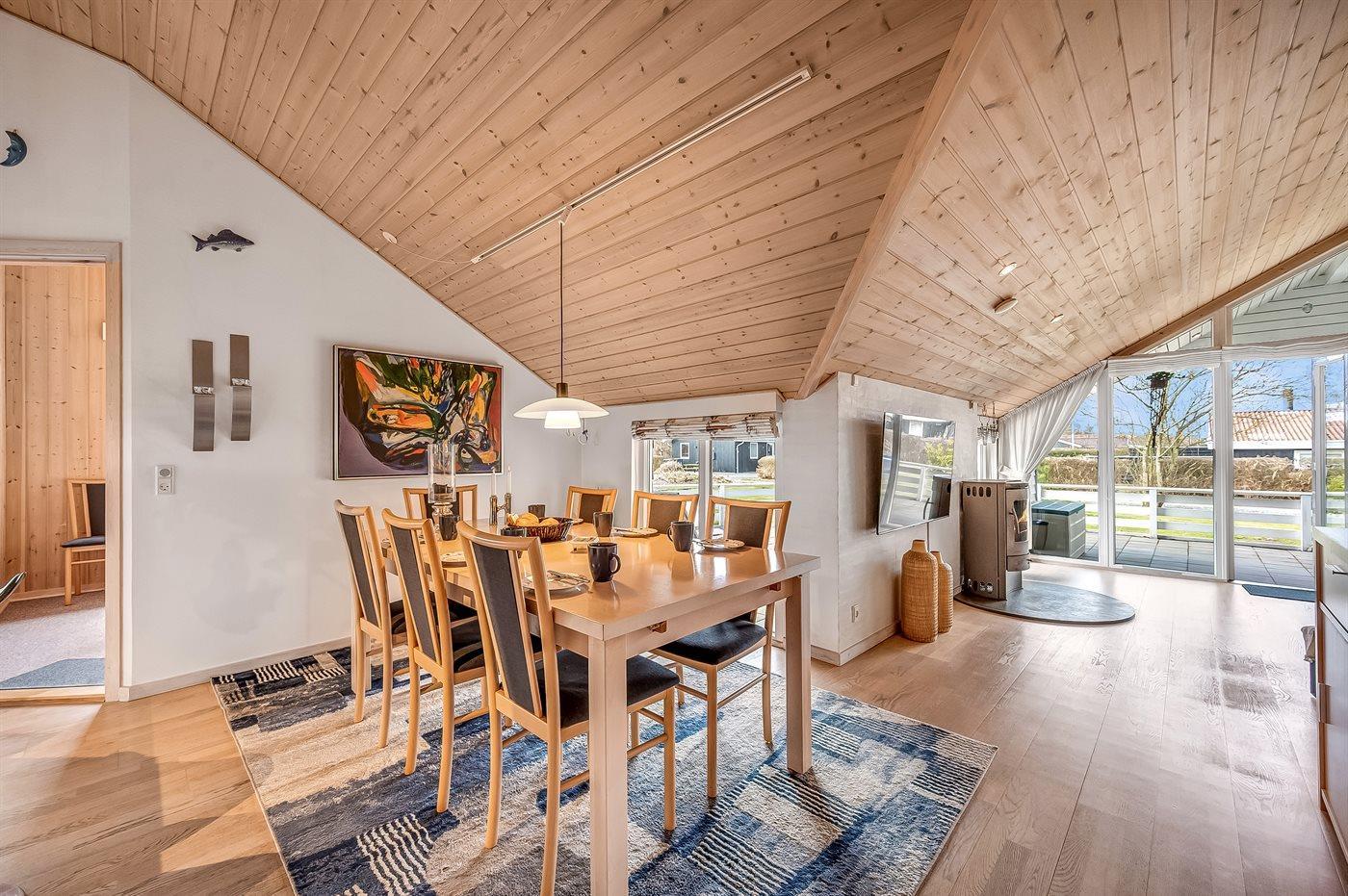 Fra det hyggelige køkken-alrum med den knitrende brændeovn er der direkte adgang til en dejlig overdækket og indhegnet terrasse. Udenfor venter flere skønne terrasser og lækroge, der indbyder til udeliv med morgenkaffe, eftermiddagshygge i solen eller en stille aften med stjernerne som baggrundstæppe.