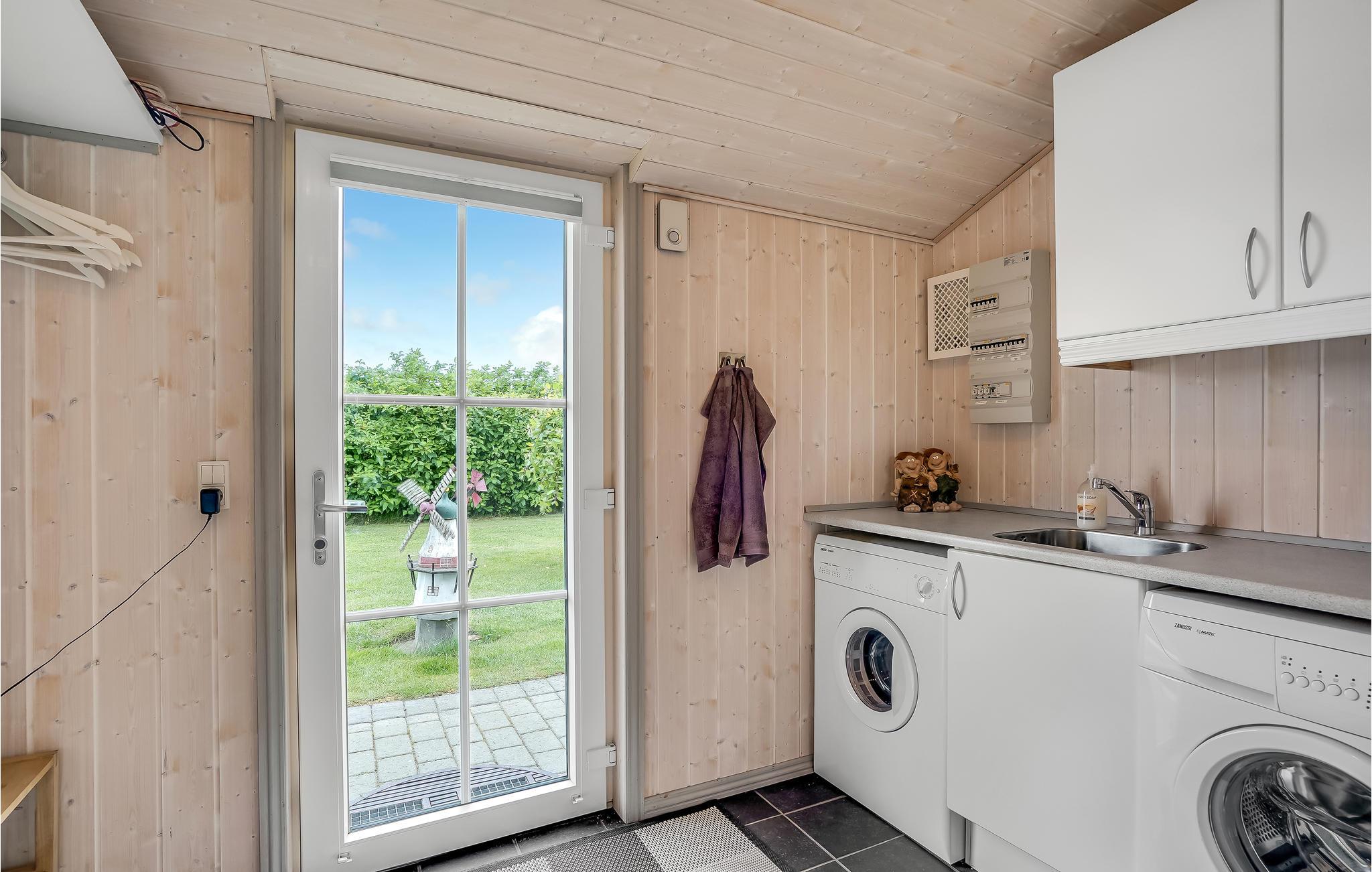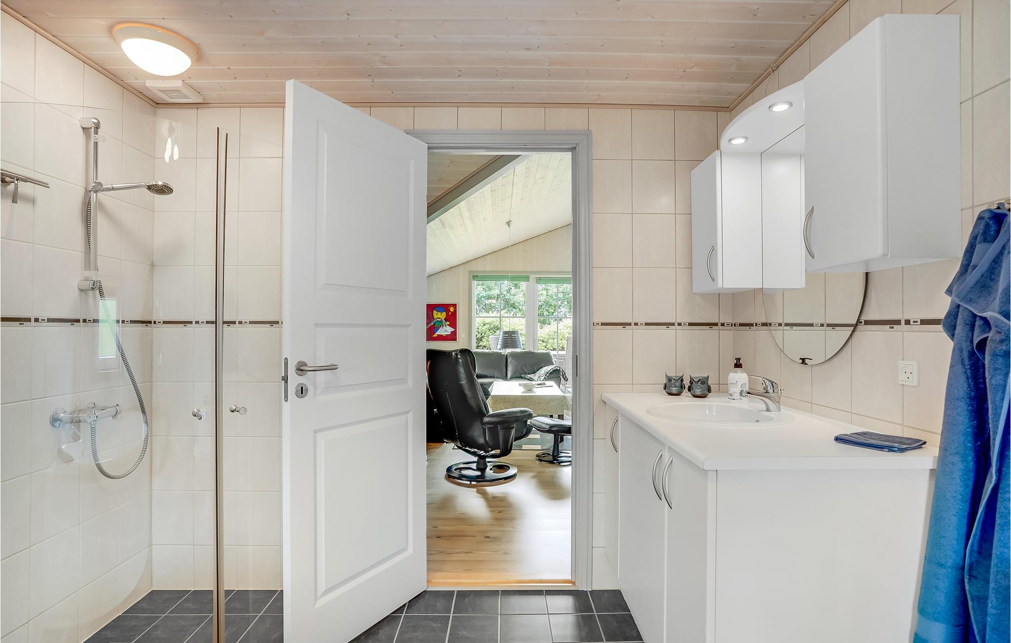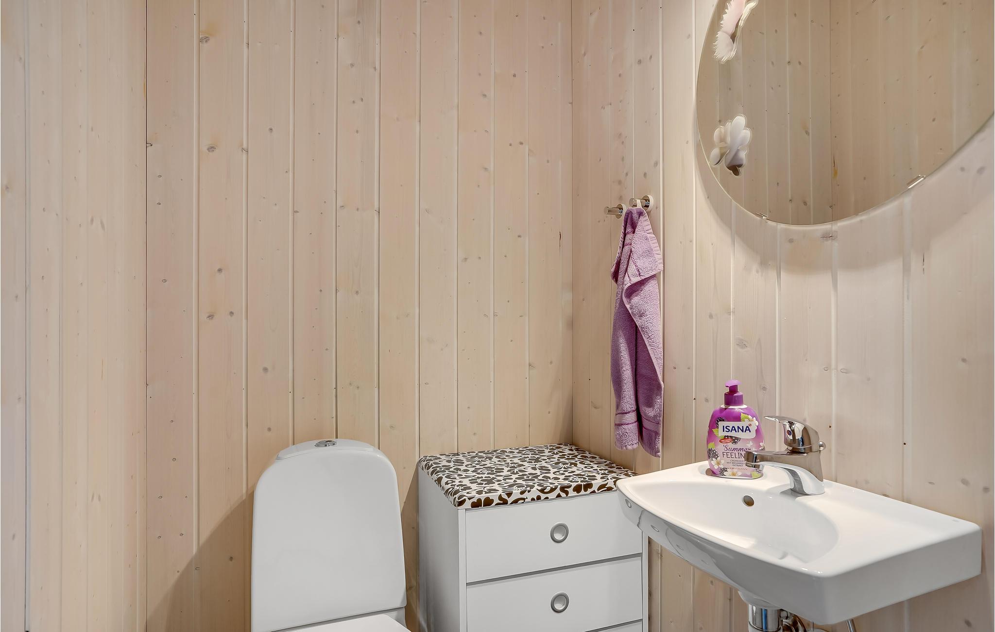 Dette hus er meget lyst og rummeligt. Her finder I dejligt badeværelse med karbad og bidet samt et ekstra toilet. Der er også et rummeligt bryggers med håndvask og bordplade. I stuen spreder brændeovnen dejlig varme og skaber en hyggelig stemning.