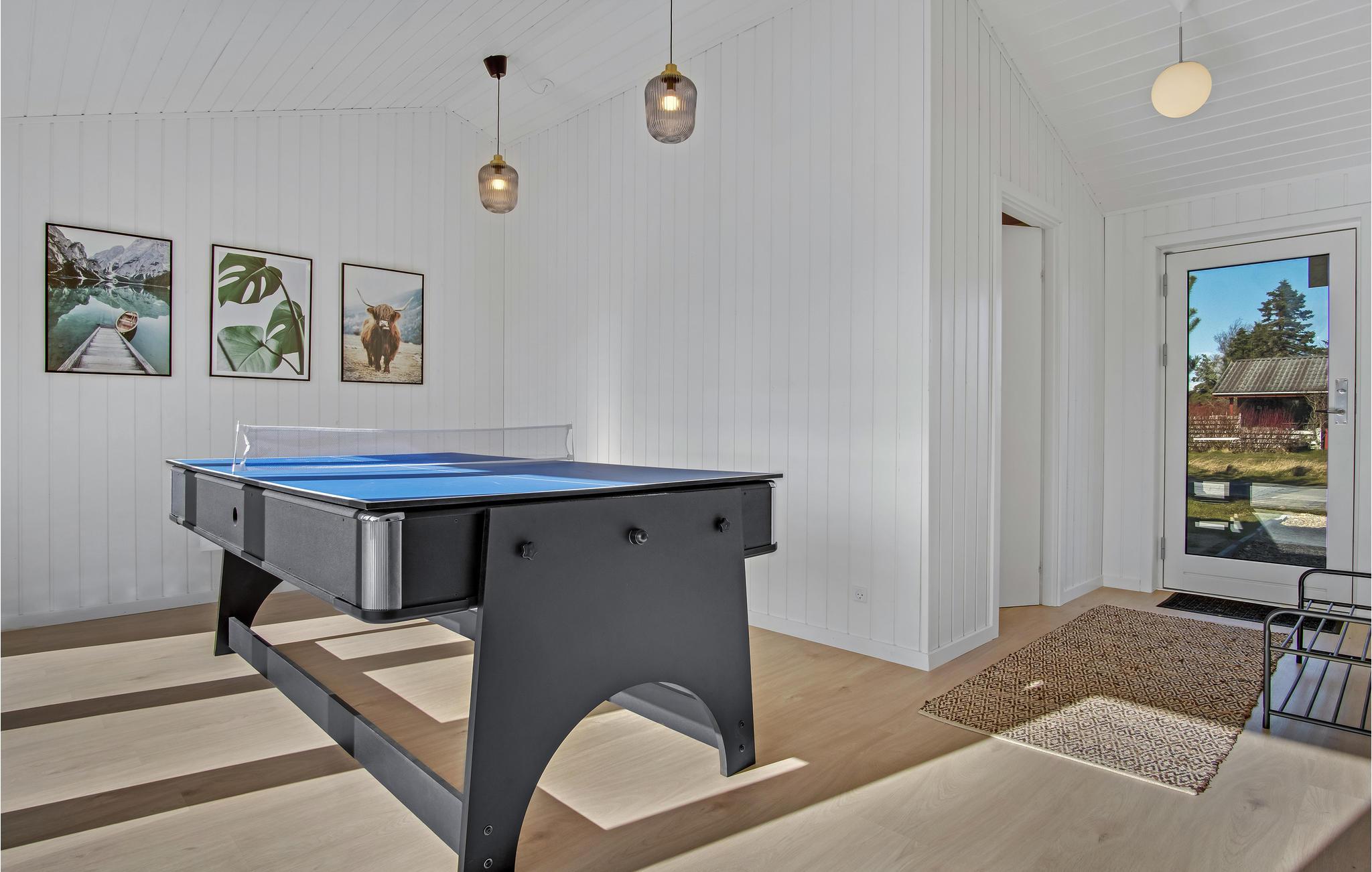 Velkommen til en skøn familieferie. Her kan I slå dørene op til et dejligt hus, hvor I kan slappe af mellem alle feriens spændende oplevelser. Der er gode rammer til at samles i den hyggelige stue, men I kan også have det sjovt i aktivitetsområdet, hvor der er bordtennis og billard. Når sommeren kommer, kan I sætte jer ud i solen, grille og finde jer til rette i vildmarksbadet under åben himmel. Børnene kan løbe og lege på græsplænen eller svinge sig højt i gyngerne, mens I læner jer tilbage og nyder en rolig stund.
