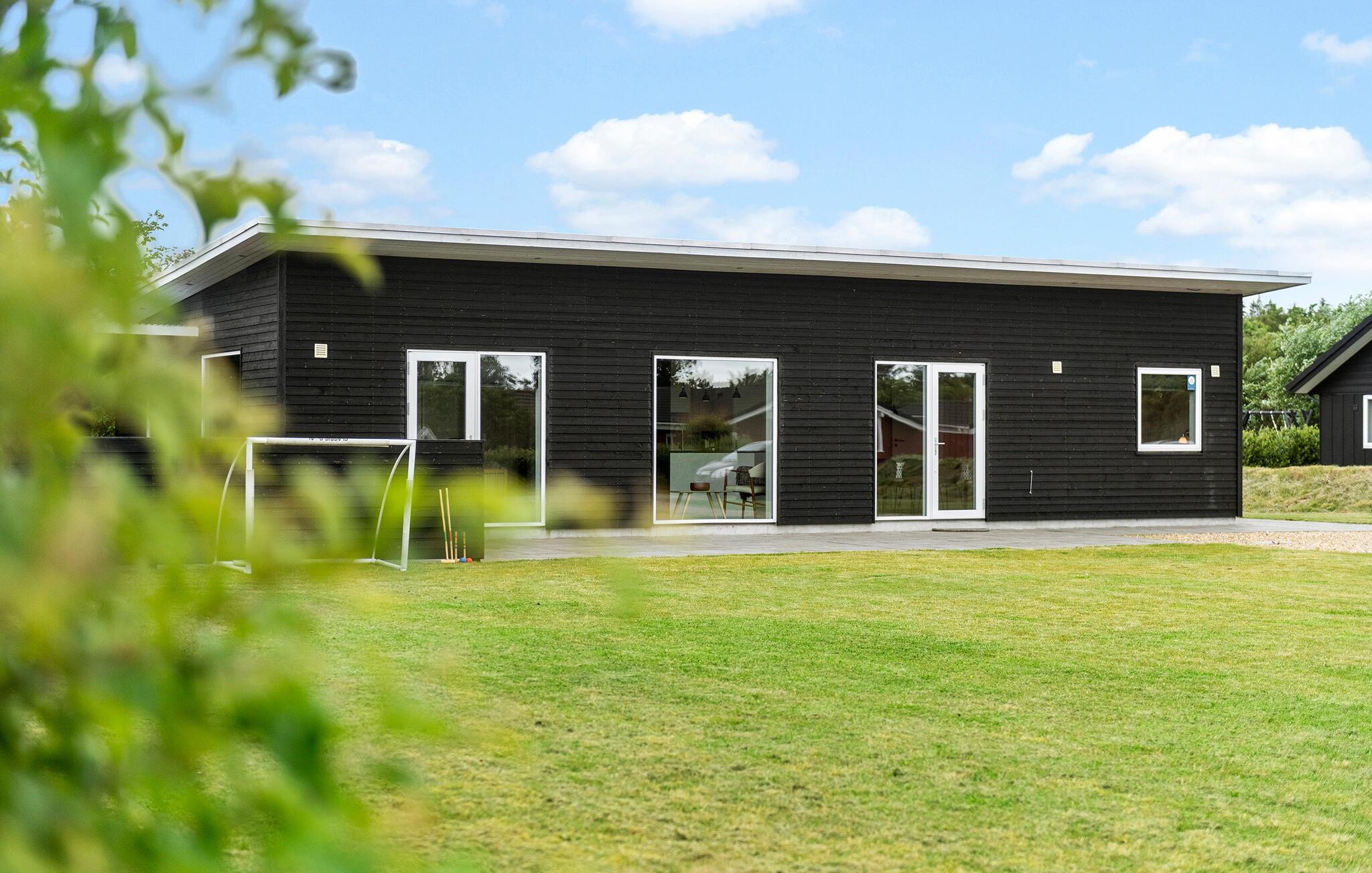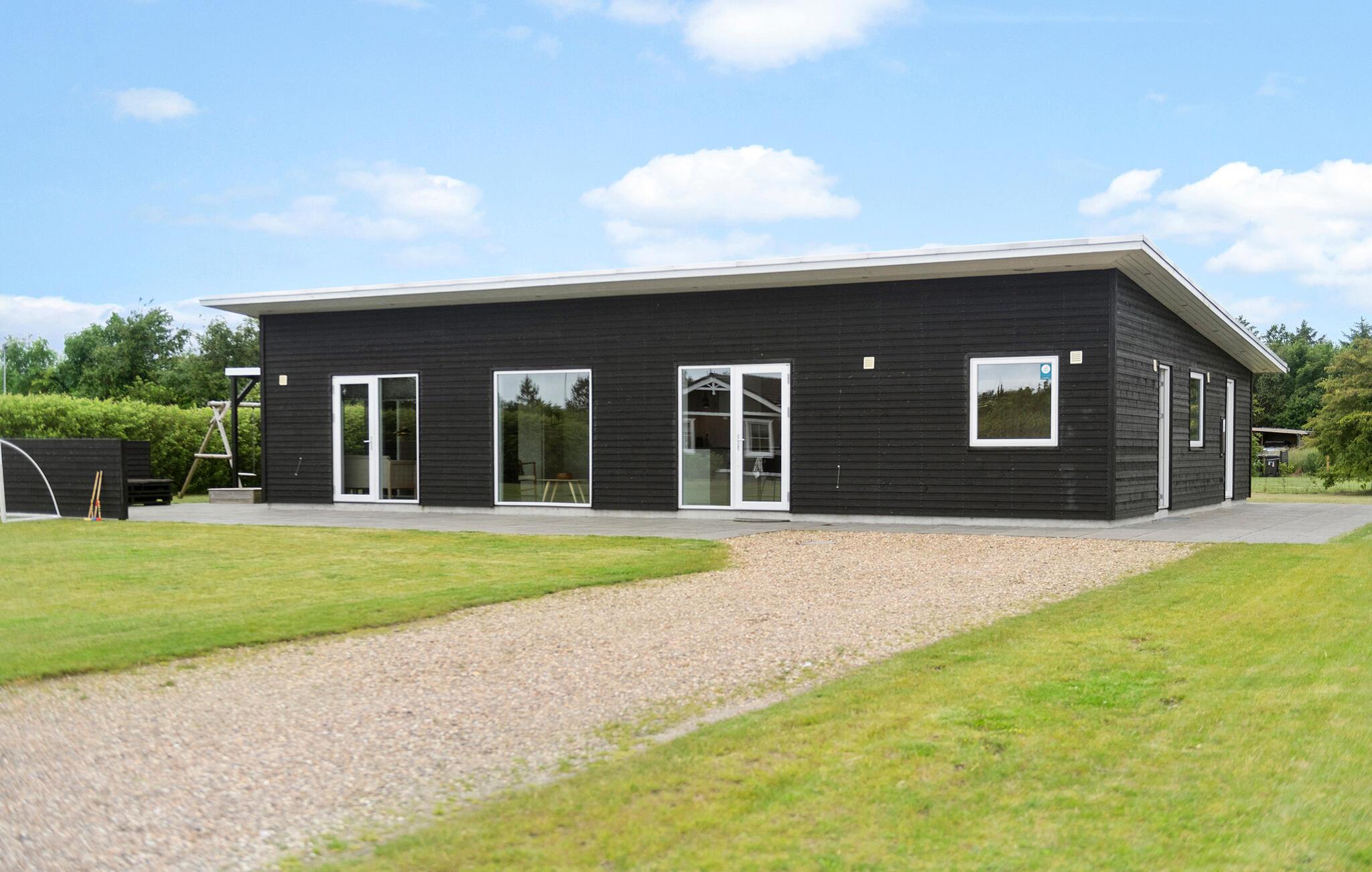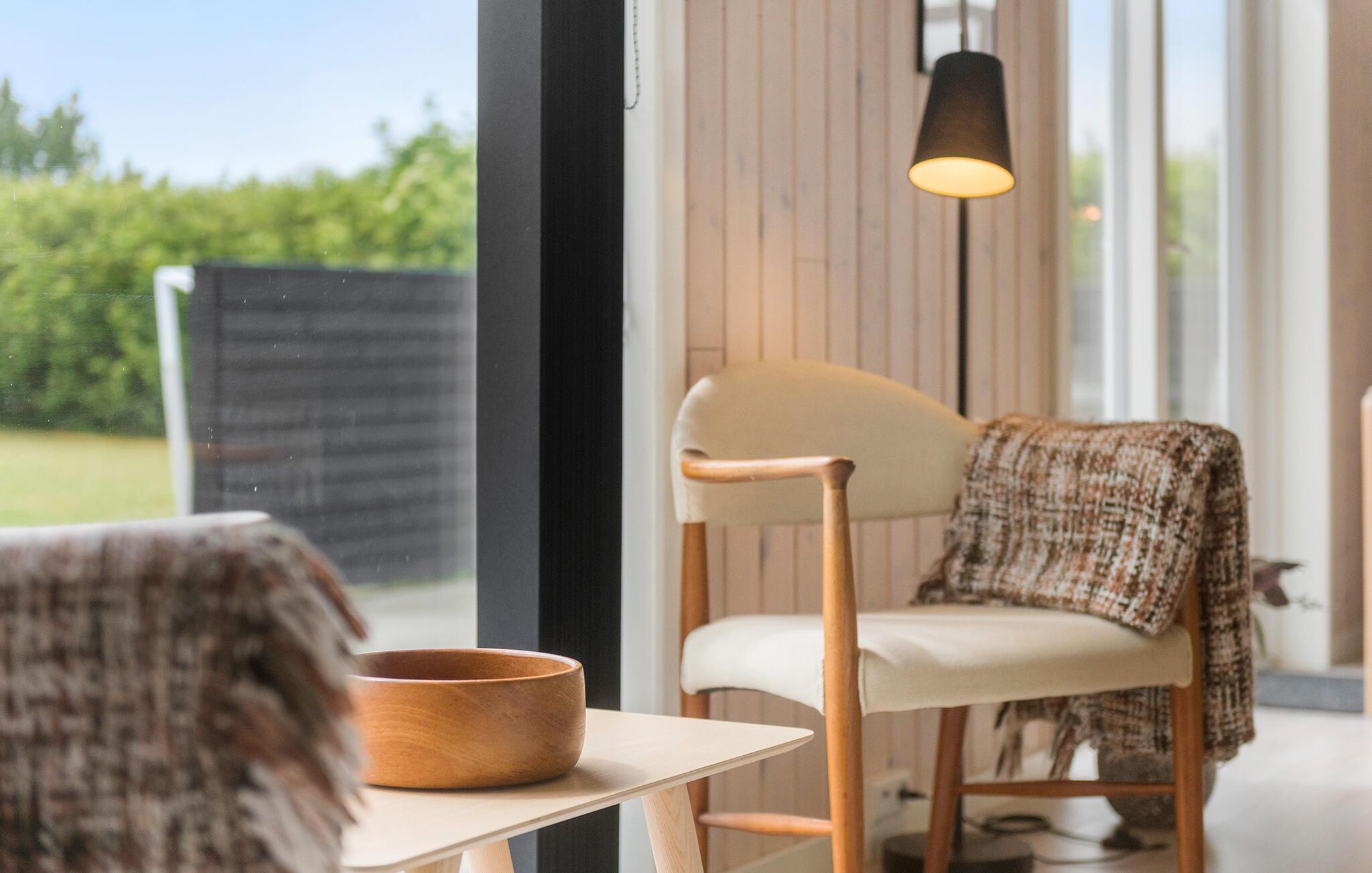 Feriehus nær Ringkøbing Fjord med moderne charme, spabad og smuk udsigt gennem store vinduer.