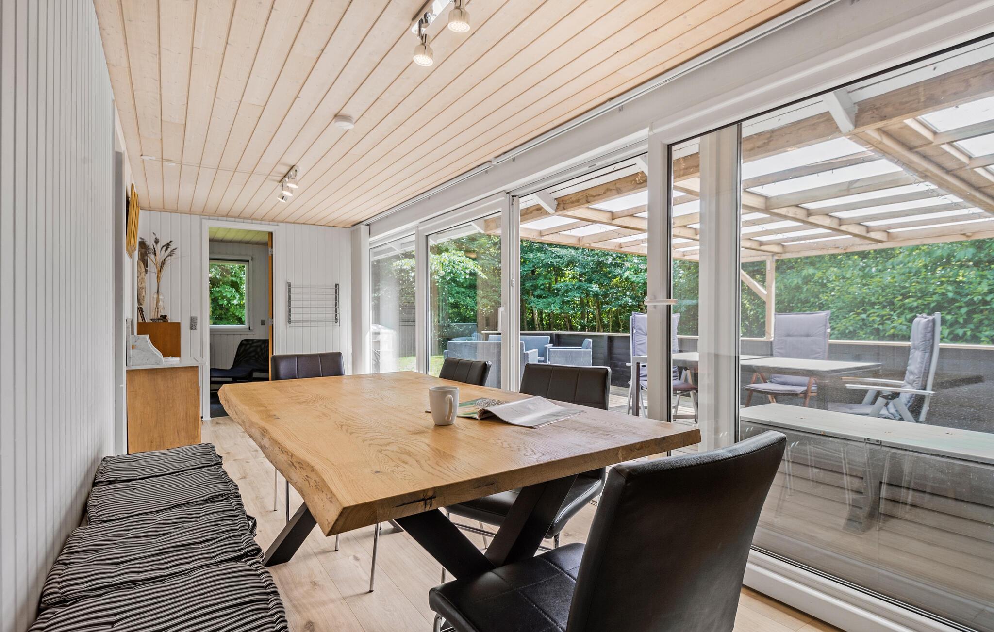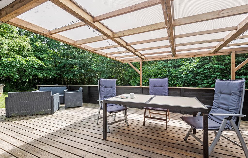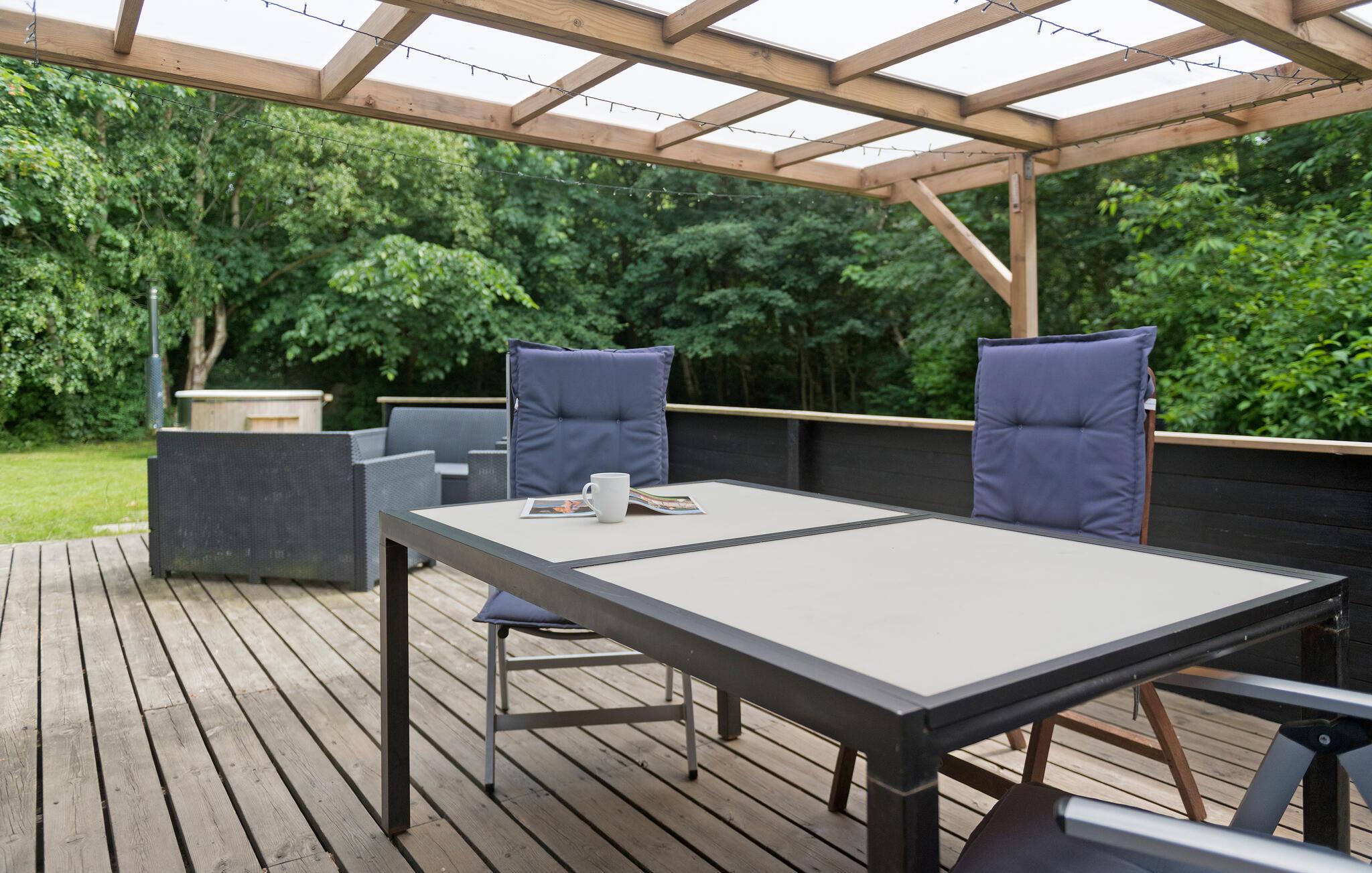 Slap af sammen med familien i dette praktiske og behagelige feriehus, der byder på alt, hvad I behøver for en ubekymret ferie. Her vil I føle jer hjemme. Hyg jer ved brændeovnen, og nyd nogle skønne feriedage med god mad og spil ved spisebordet. Herfra kan I træde ud på den store og overdækkede terrasse. Nyd roen i den smukke, lukkede have, og slap af under åben himmel i vildmarksbadet.