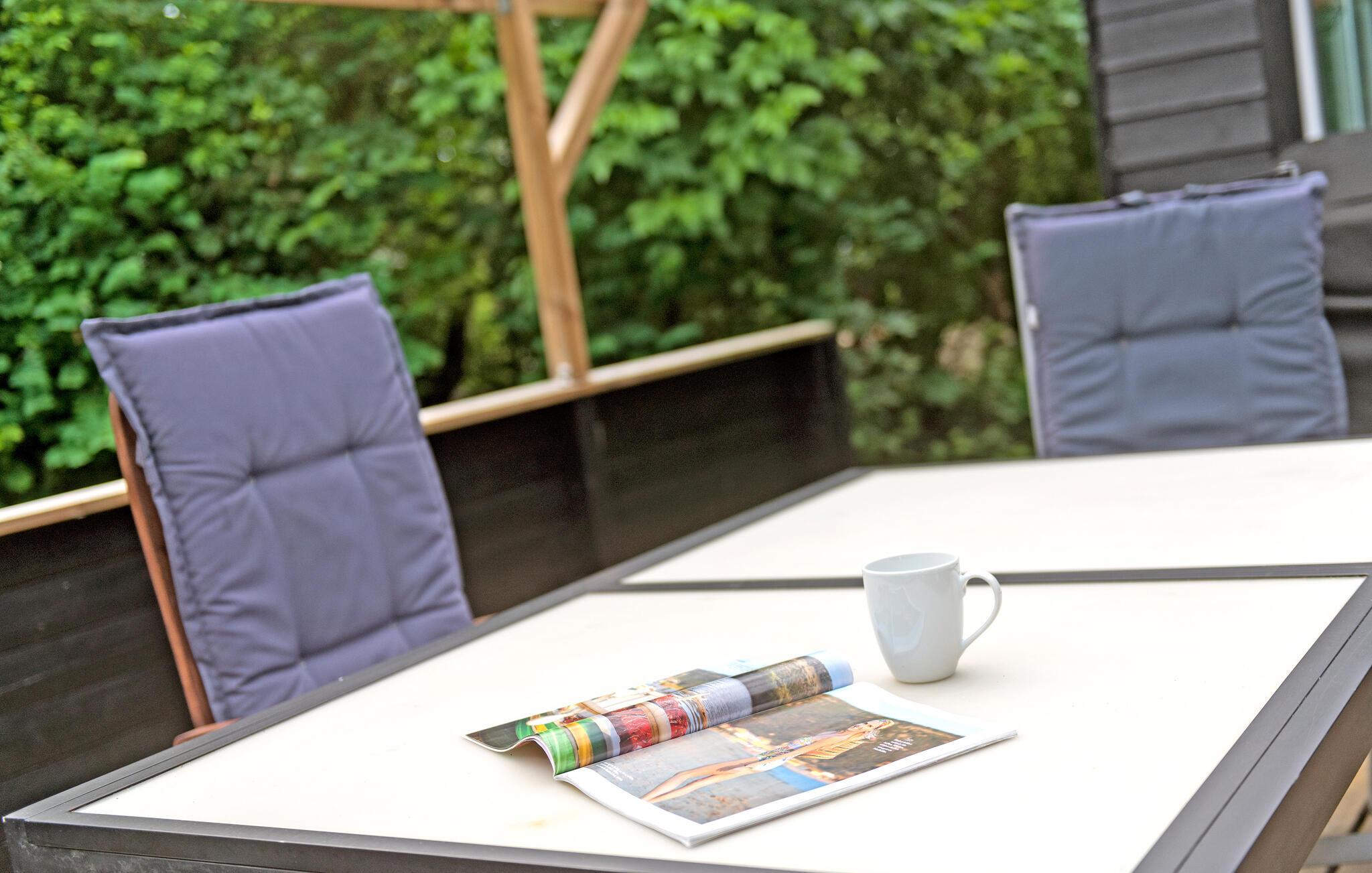 Hyggeligt feriehus i Bork Havn med vildmarksbad og stor overdækket terrasse i roligt kvarter.