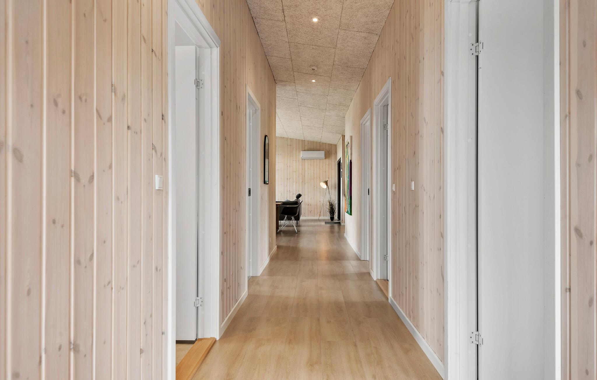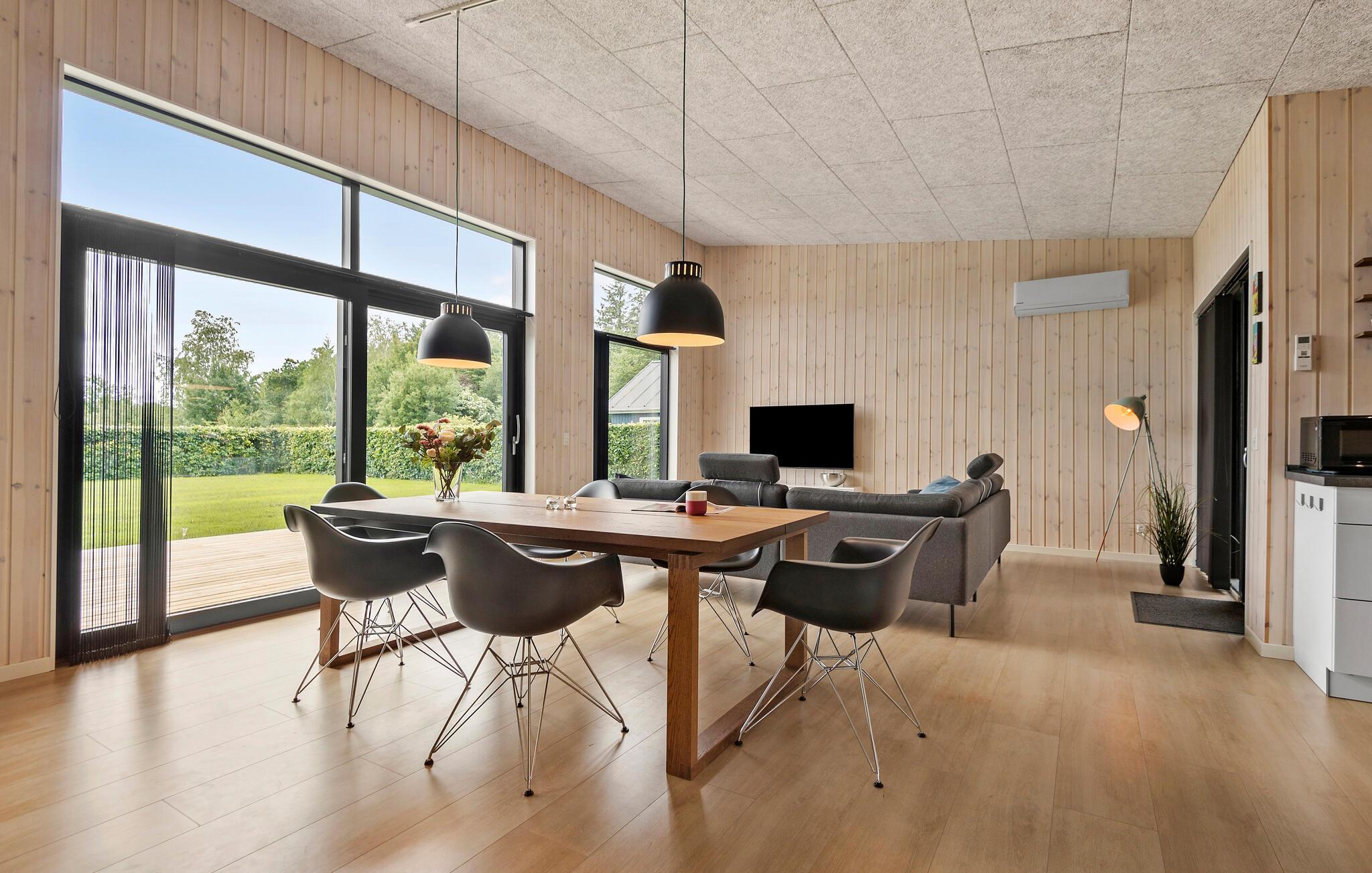 Træd ind dette smukke sommerhus, som er beklædt i lyst træ på væggene og troldtekt i loftet, som sikrer en hyggelig og rustik stemning med god akustik i det store køkken-alrum. I det moderne veludstyrede køkken kan I lave lækkert mad, som I kan nyde om spisebordet eller ude på træterrassen. De store vinduespartiver giver både et skønt lysindfald i løbet af dagen og en flot udsigt til haven. Fra stuen kan I åbne op til terrassen, hvor I kan nyde solen og lade børnene lege i haven.