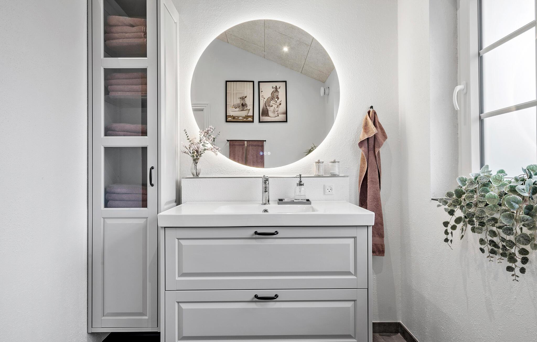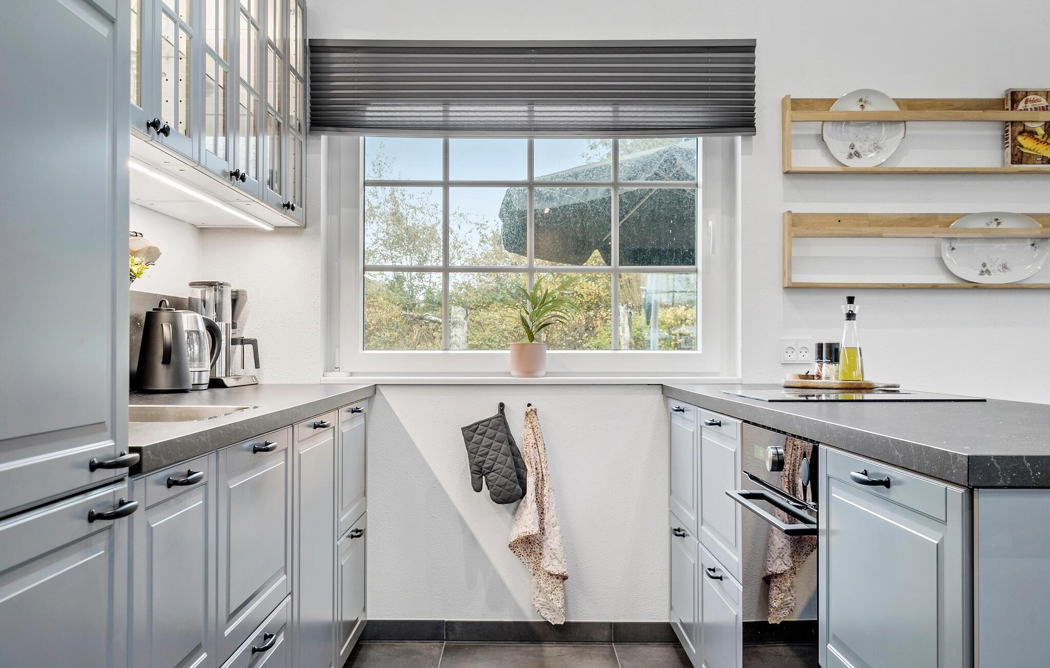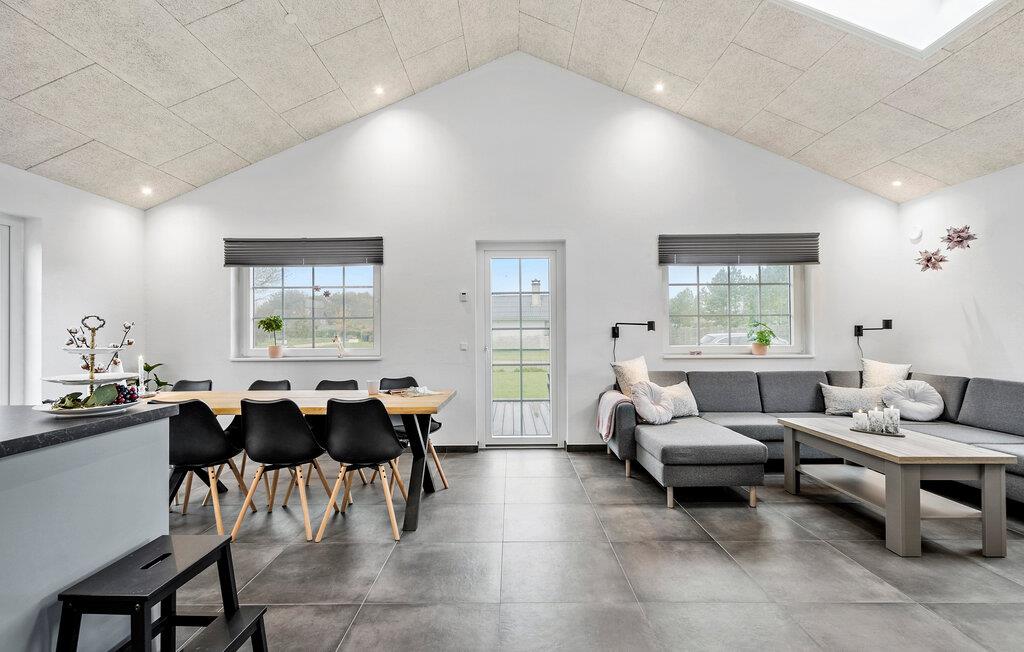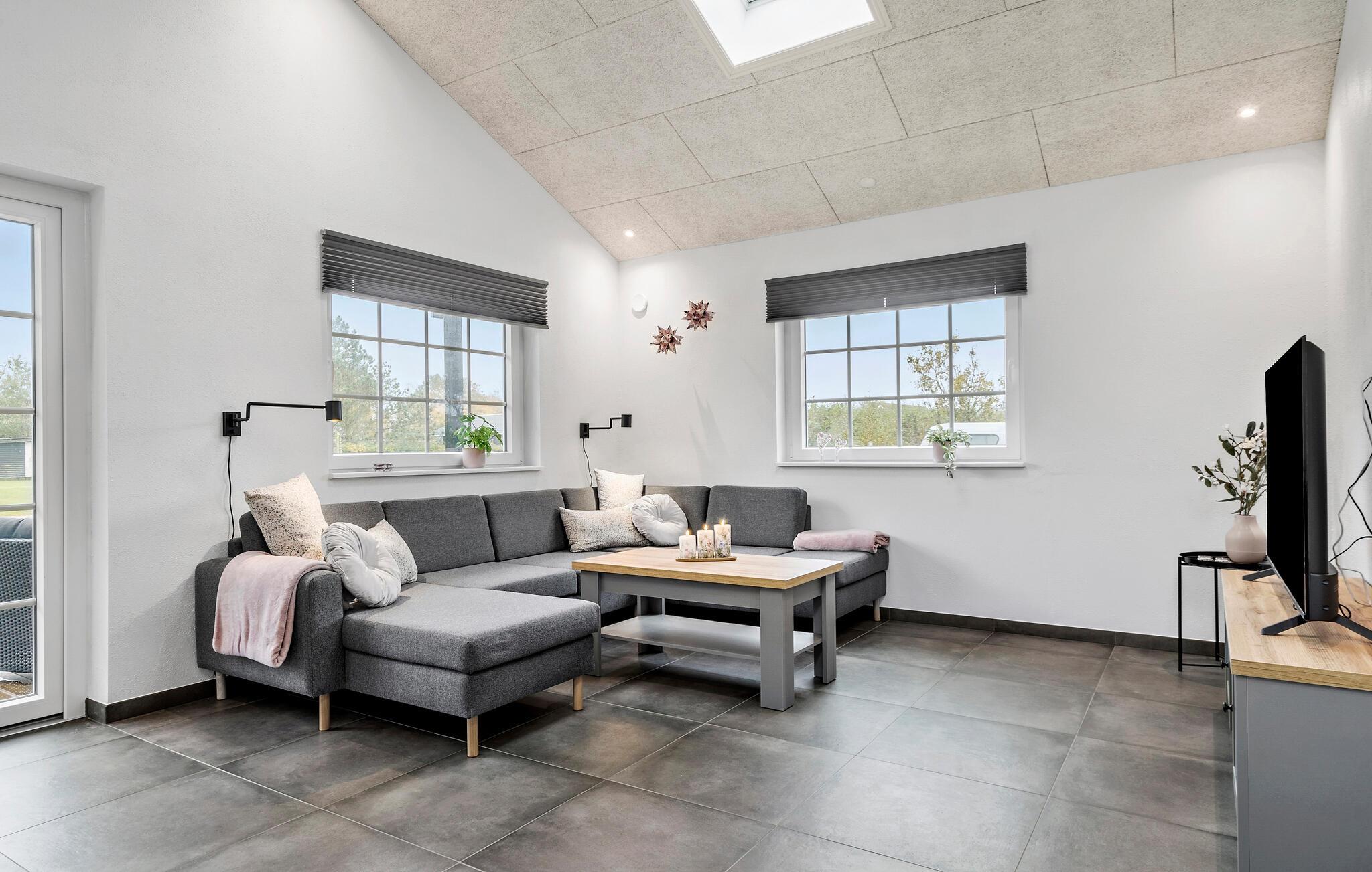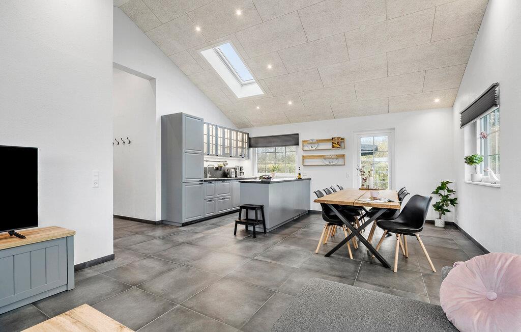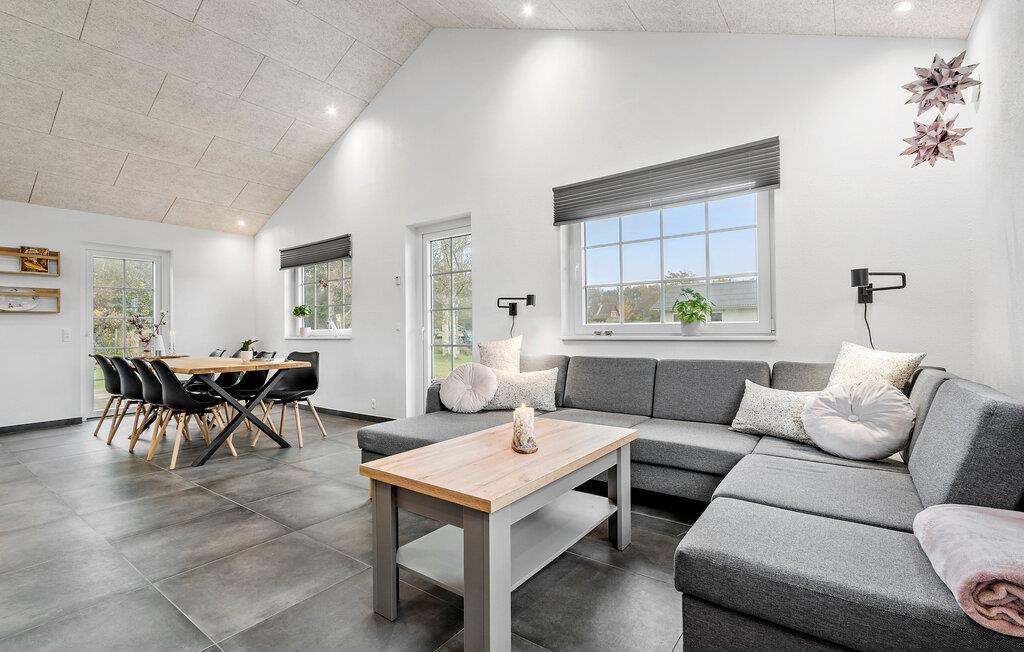 Den åbne stue med højt til loftet og store vinduer skaber en lys og venlig atmosfære. Slap af i det rummelige sofahjørne og nyd tiden sammen med familie eller venner. Det moderne, veludstyrede køkken med tilstødende spisebord giver plads til fælles måltider og hyggelige aftener.