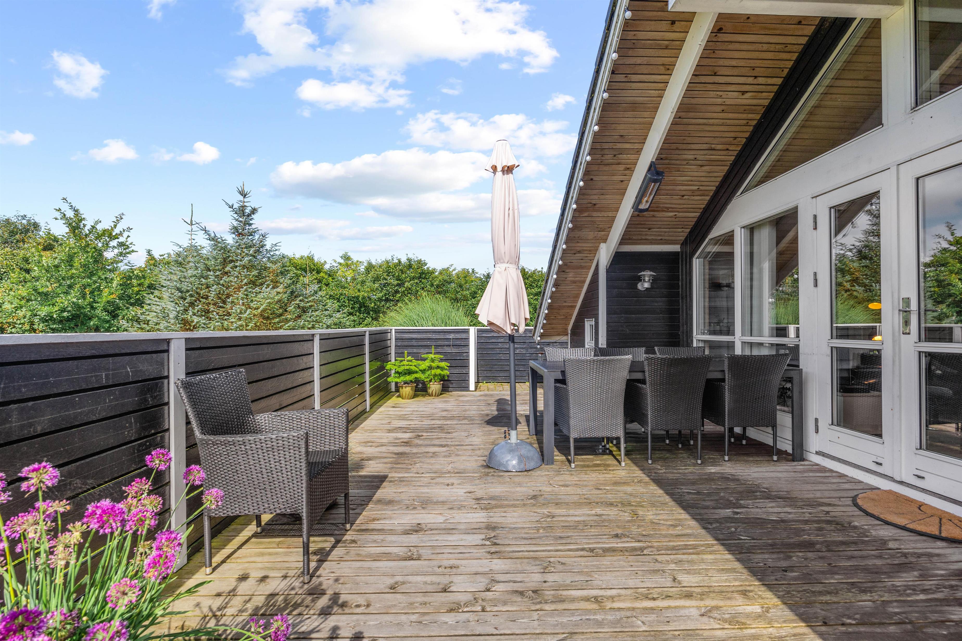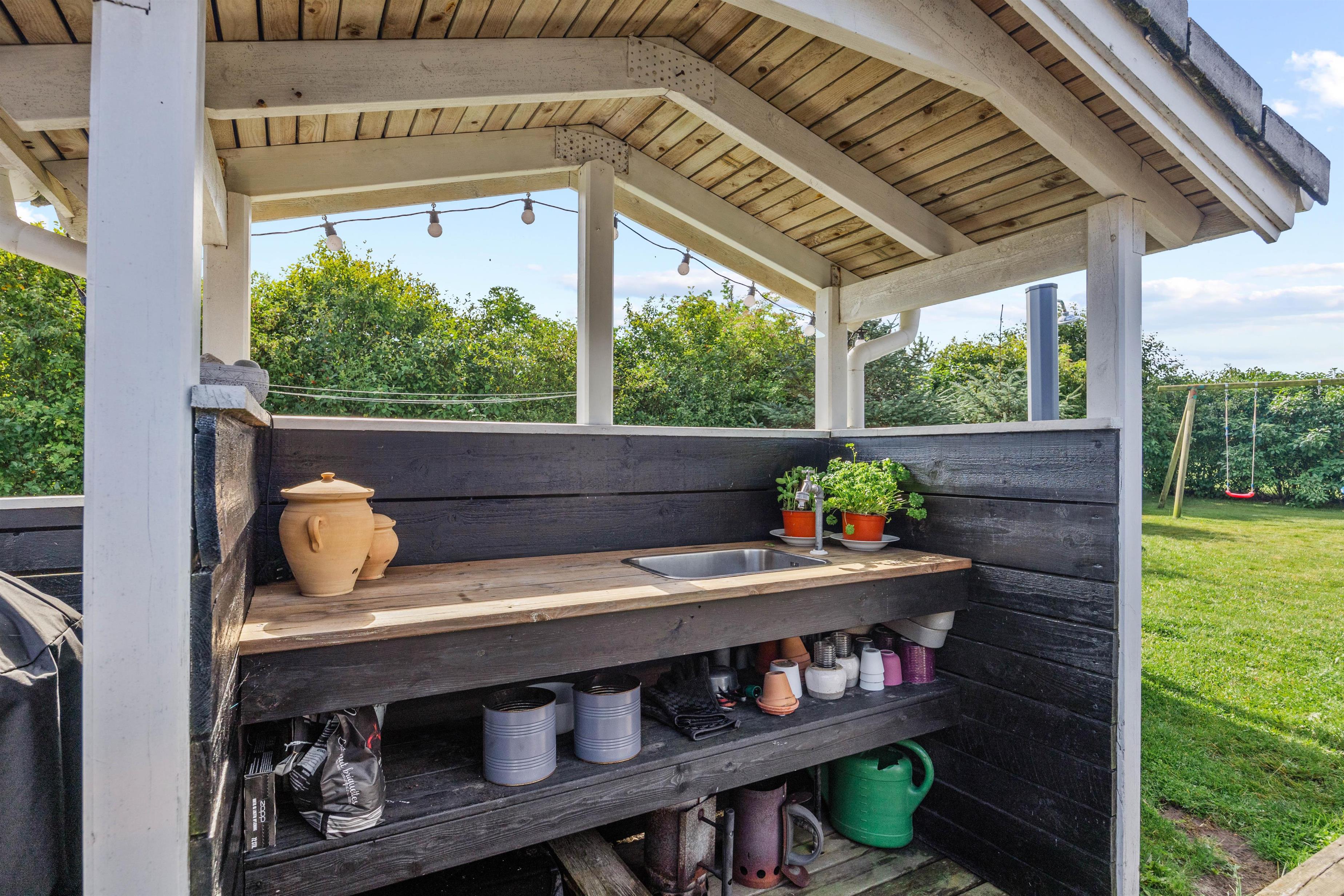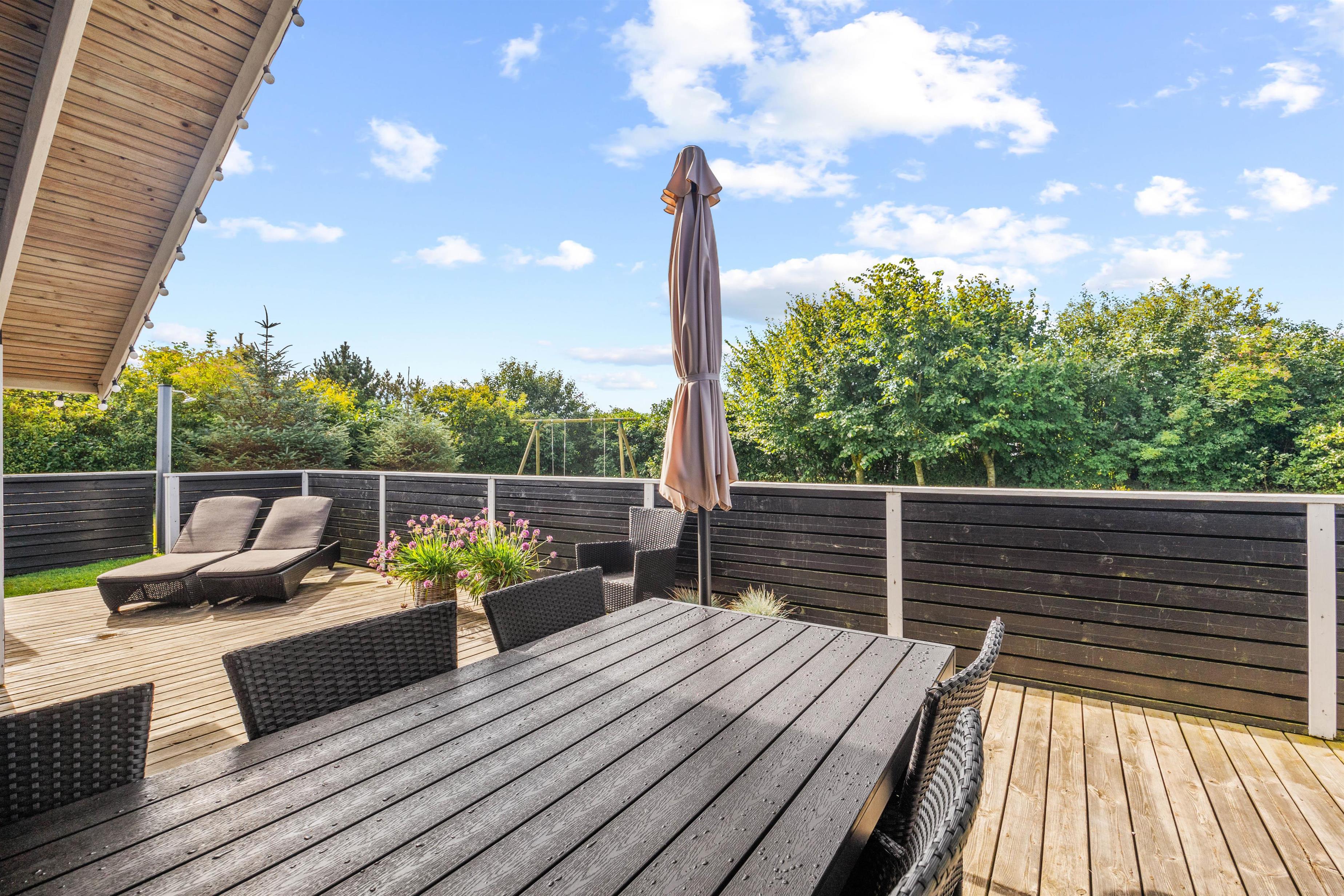 Med kun 1200 meter til Vesterhavet er det nemt at tage en rask gåtur til stranden, hvor I kan nyde friske dyp eller en afslappende dag med sand mellem tæerne. Den store, indhegnede grund på 1201m2 indbyder til masser af aktivitet og leg for både børn og voksne. En gynge, sandkasse og trampolin sørger for, at børnene kan lege trygt og have det sjovt i timevis. Grunden er indhegnet, så I skal ikke bekymre jer om at de mindste eller hunden pludselig er stukket alene på eventyr. Den overdækkede terrasse er ideel til grillmiddage, hvor I kan nyde de lange sommeraftener i godt selskab.
