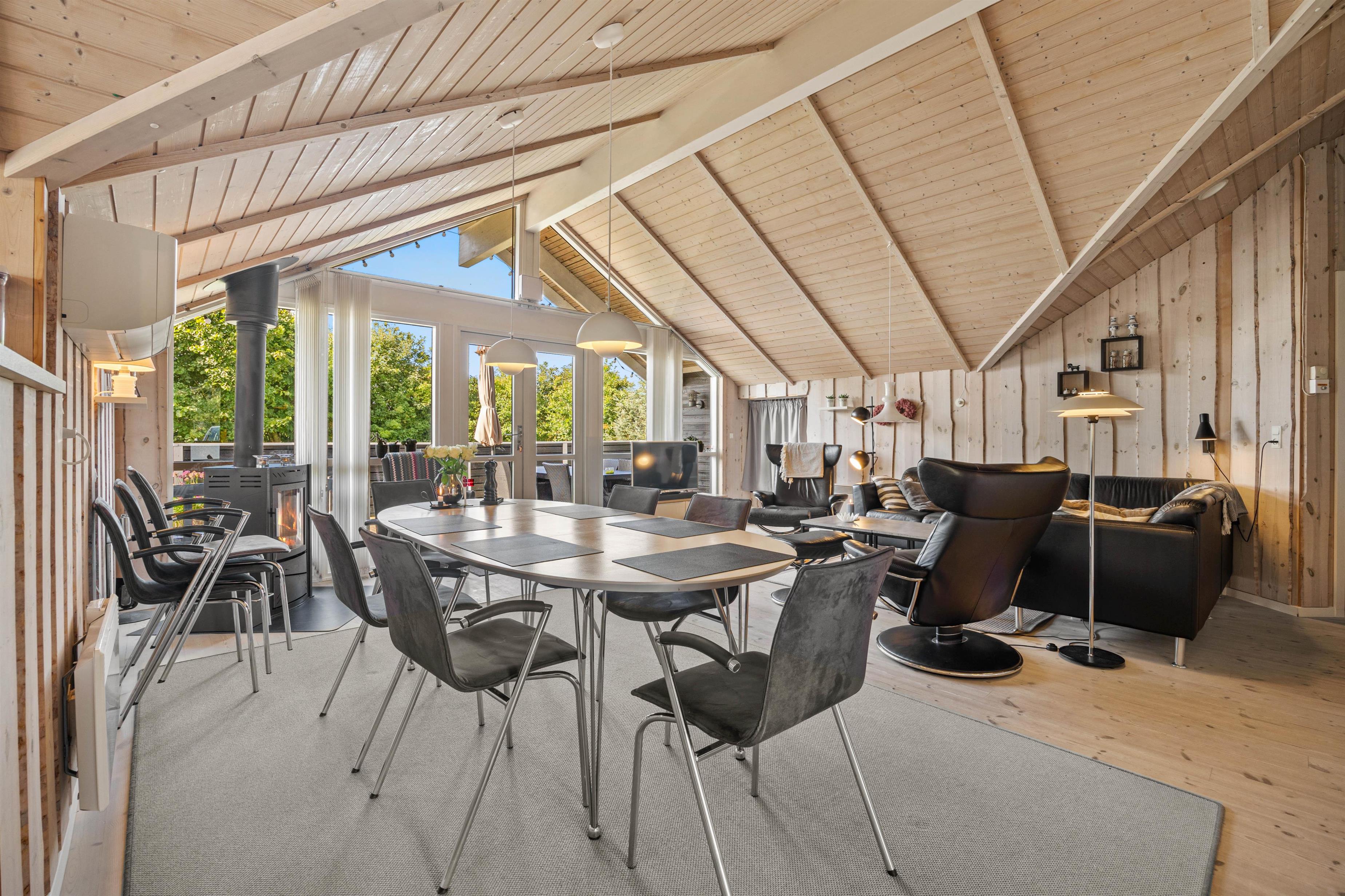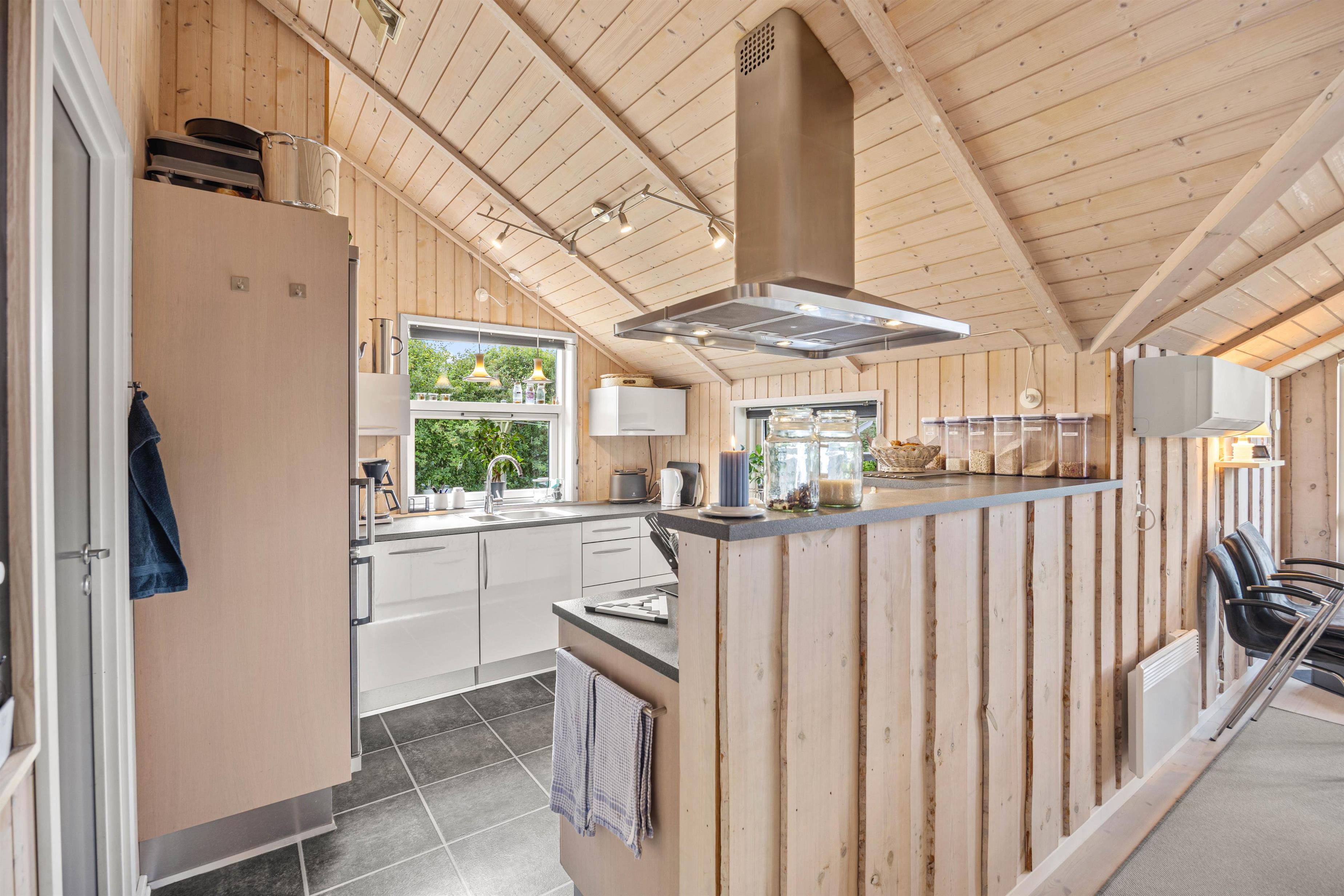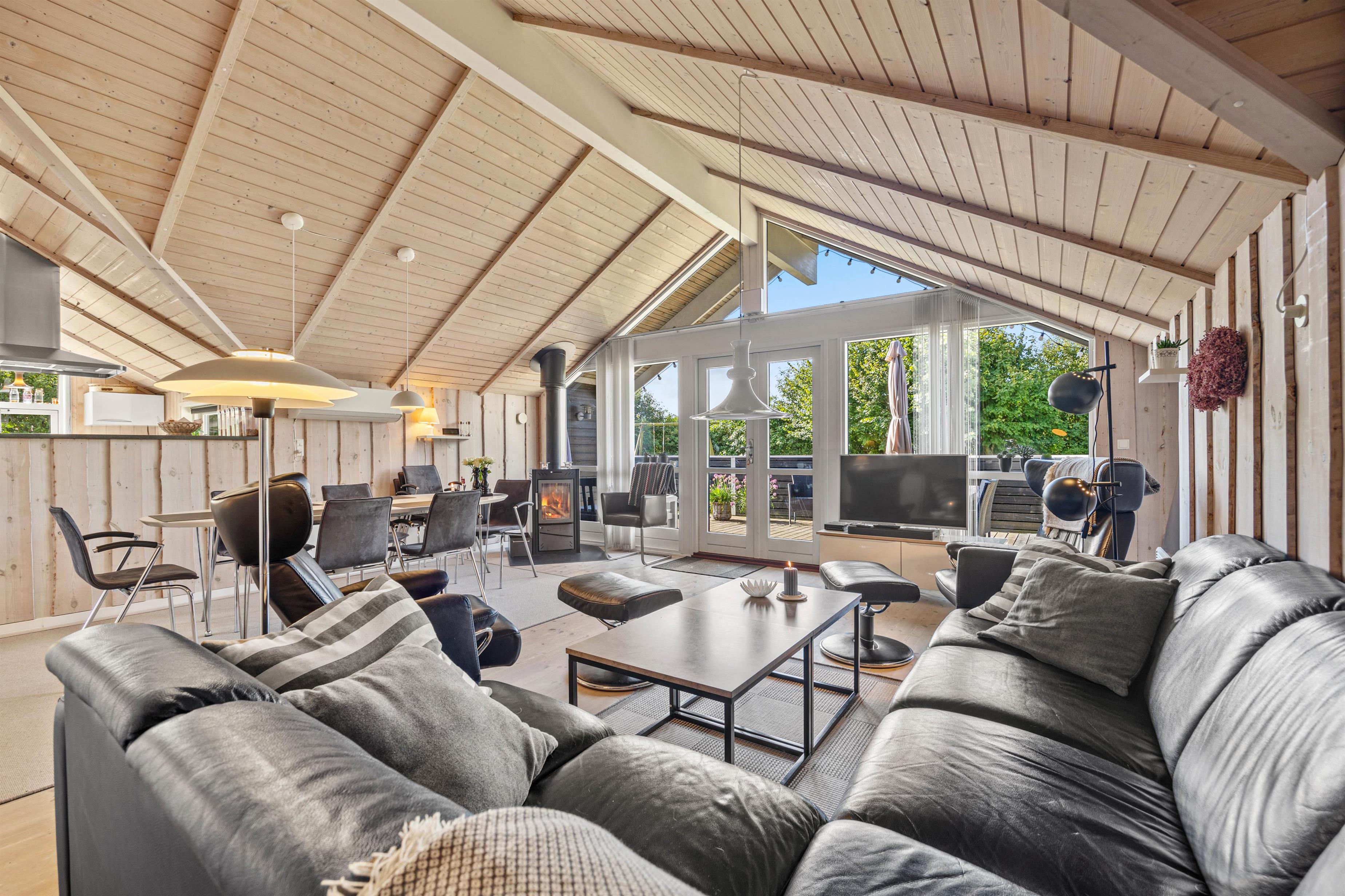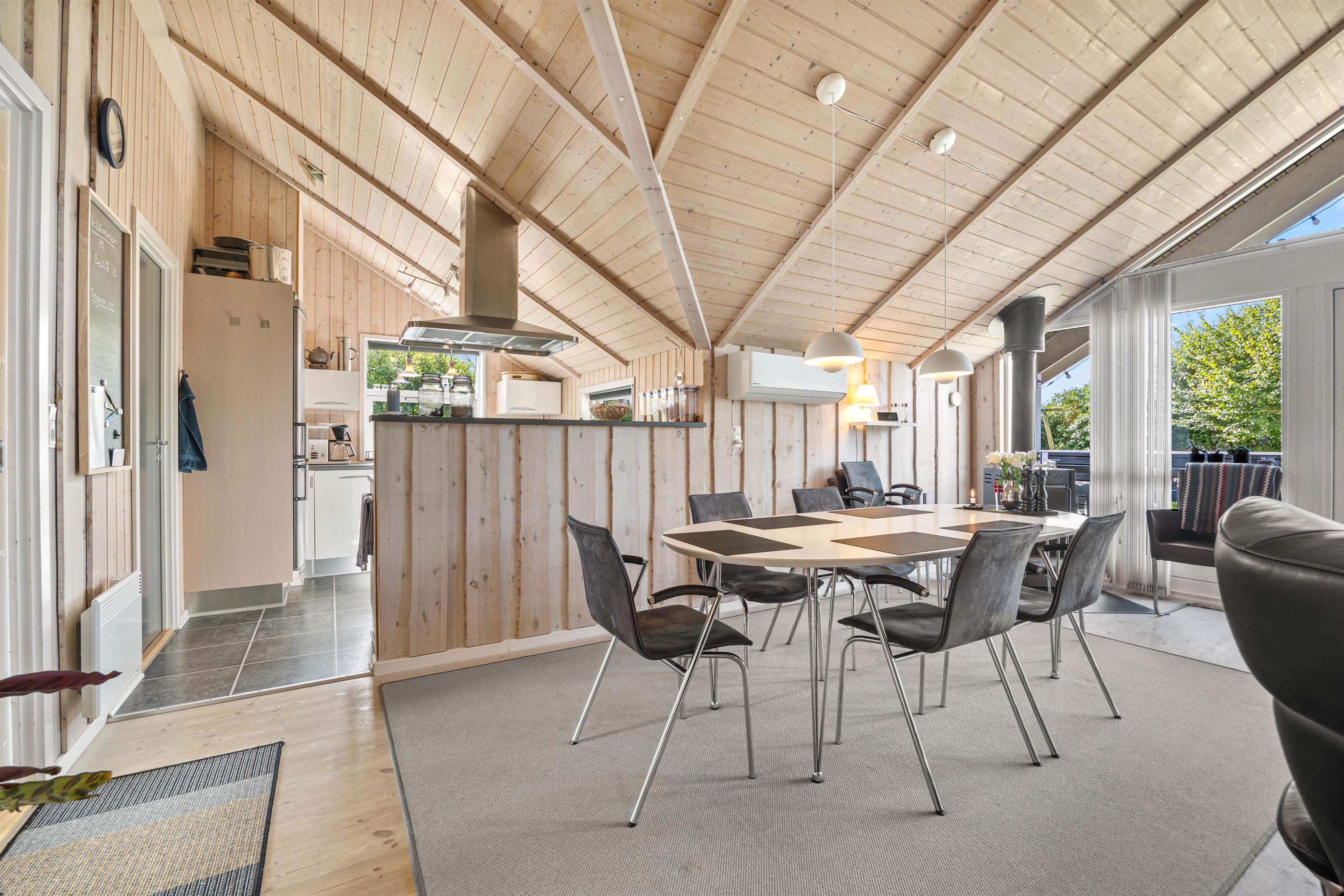 Indendørs byder sommerhuset på 3 rummelige og gode soveværelser, der alle er indrettet med henblik på at sikre jer den bedste komfort. I kan nyde hyggelige aftener foran den knitrende brændeovnen, hvor flammerne skaber en varm og afslappet sommerhus atmosfære. I kan streame jeres yndlingsindhold fra telefonen og direkte op på fjernsynet via Chromecasten og nyde mange dejlige stunder indendørs. Sommerhuset er også udstyret med en effektiv og energibesparende luft-til-luft varmepumpe, der sørger for et optimalt indeklima året rundt. Moderne faciliteter som opvaskemaskine, vaskemaskine og tørretumbler er til jeres rådighed, hvilket gør ferien lettere.