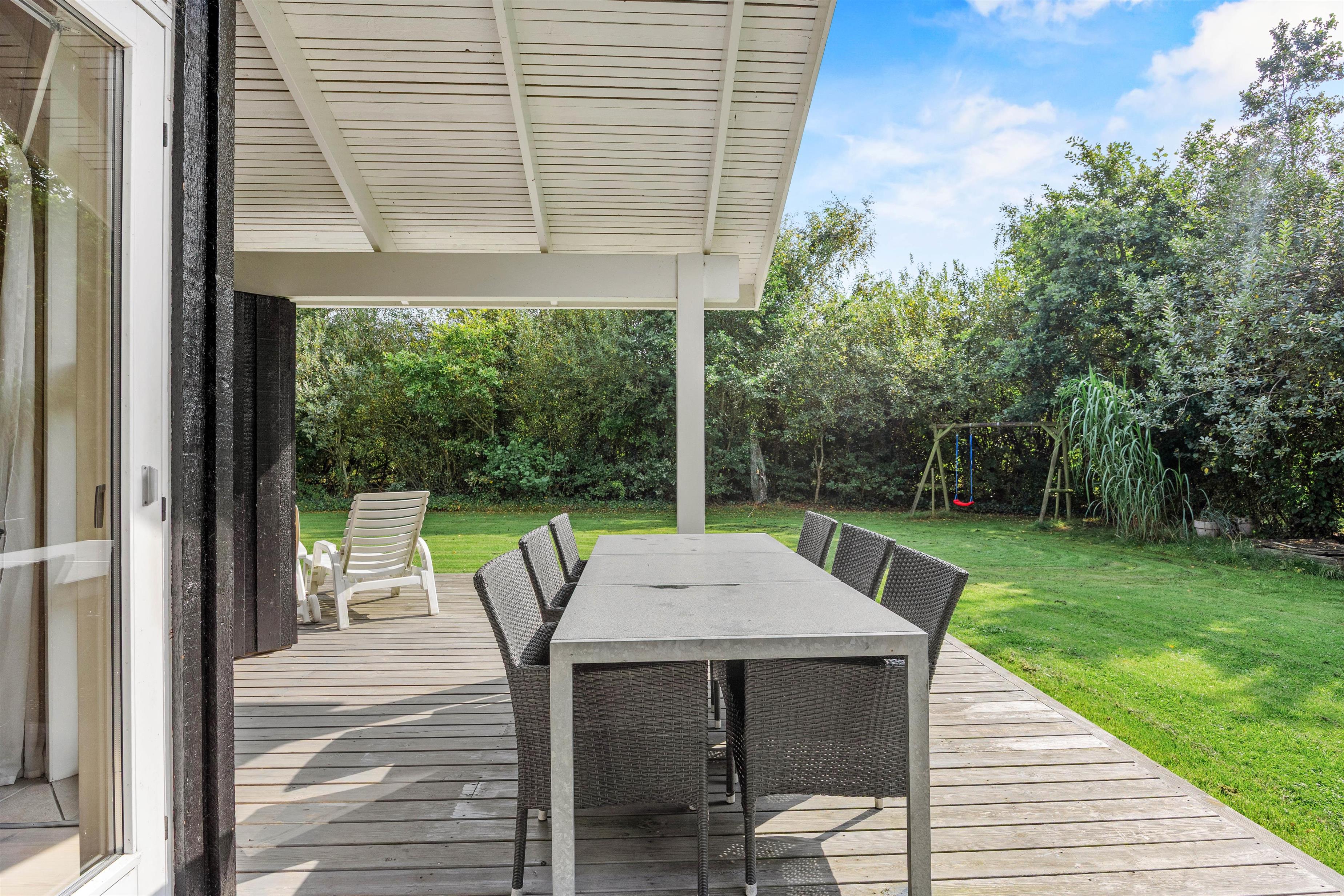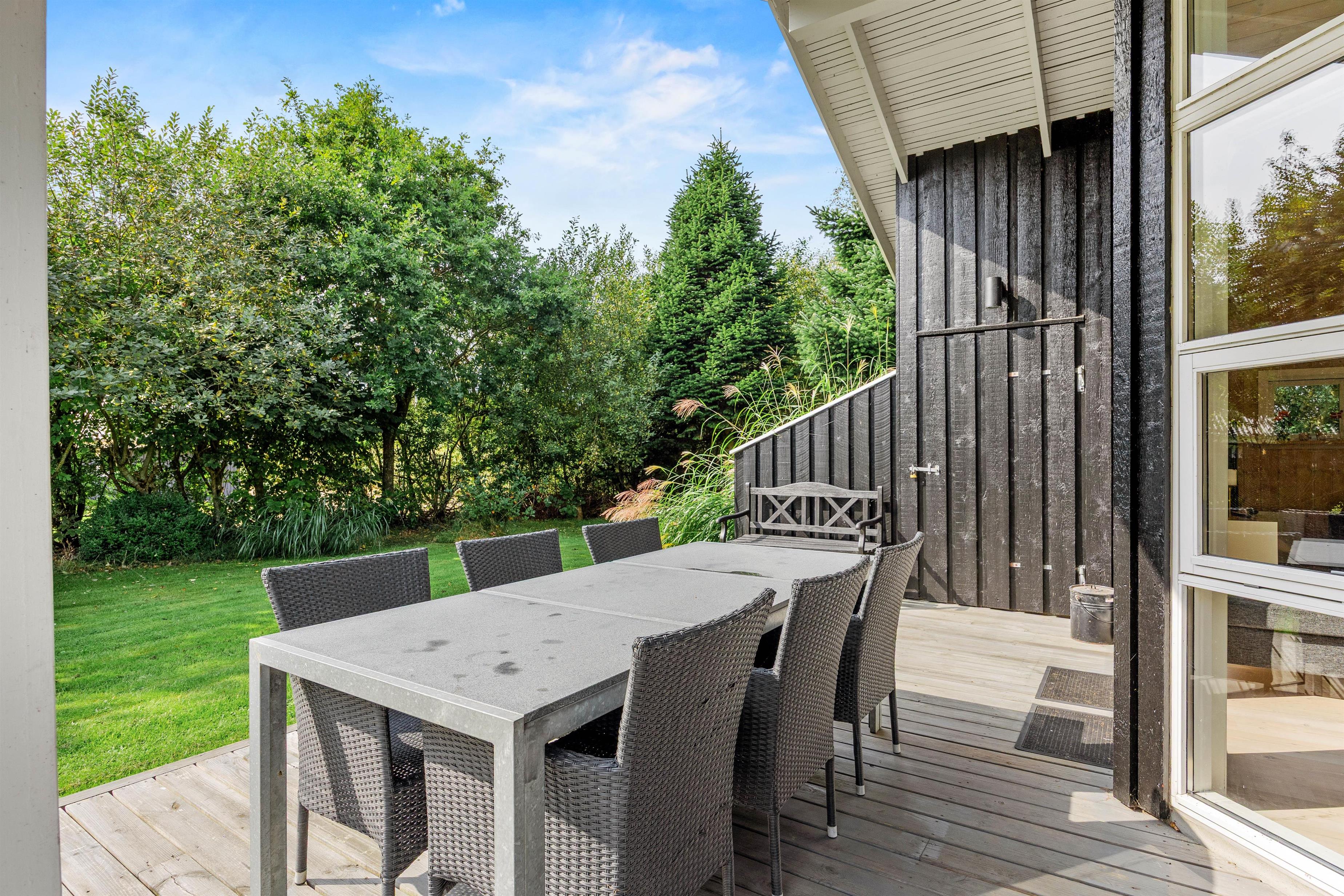 Den store grund på 1312 m² er omkranset af høje træer, der giver privatliv. Den delvist overdækkede og afskærmede terrasse indbyder til hyggelige grillaftener og nærvær i solen. Havemøbler, liggestole og grill står klar, og børnene kan more sig på gyngen i haven.