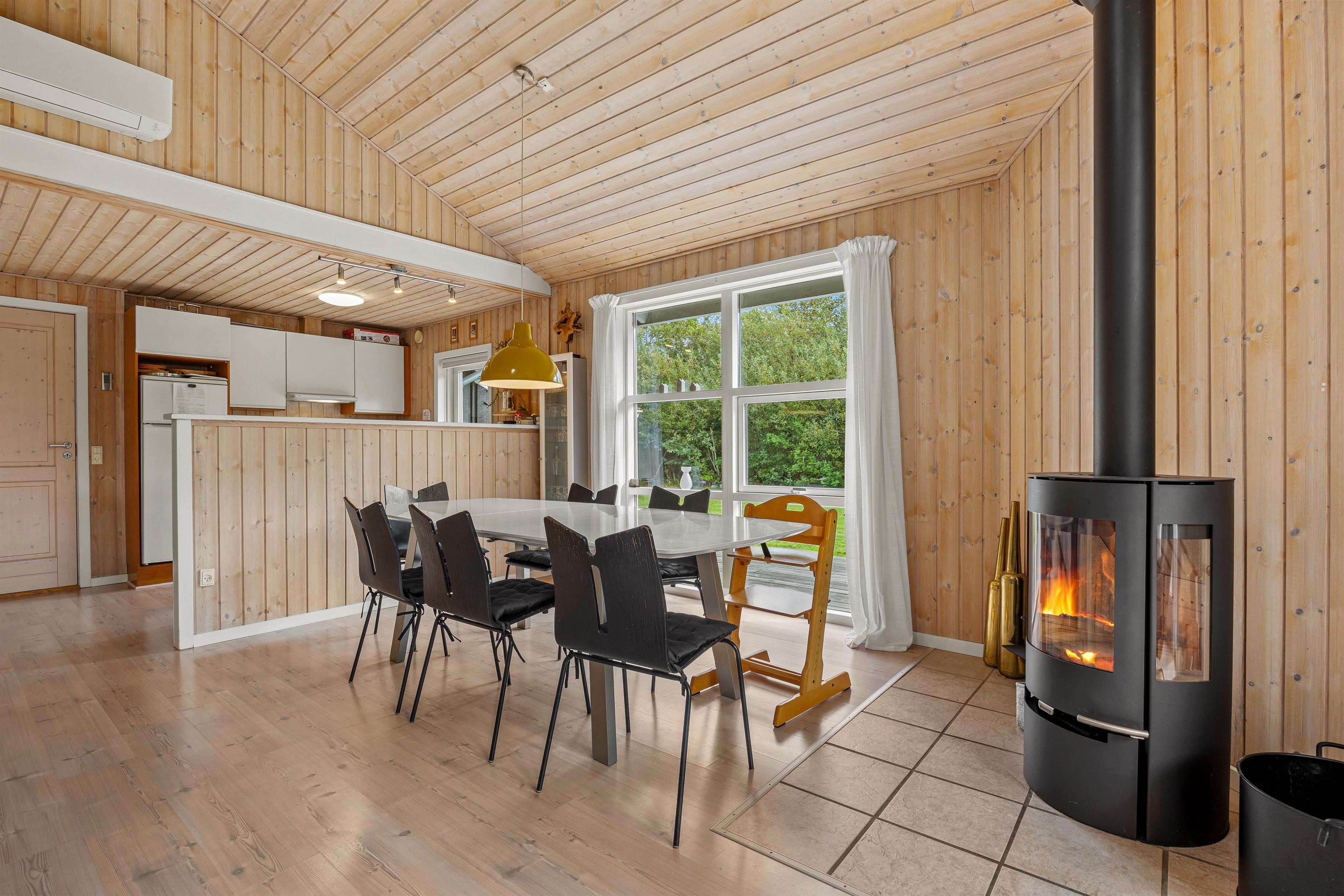 Sommerhuset byder på en rummelig stue med højt til loftet og store vinduespartier, der lader masser af dagslys strømme ind og fremhæver det lyse træ, som er gennemgående i feriehuset. De behagelige møbler indbyder til afslapning og hyggelige film- eller spilleaftener foran tv’et, via Chromecast eller DVD-afspilleren.