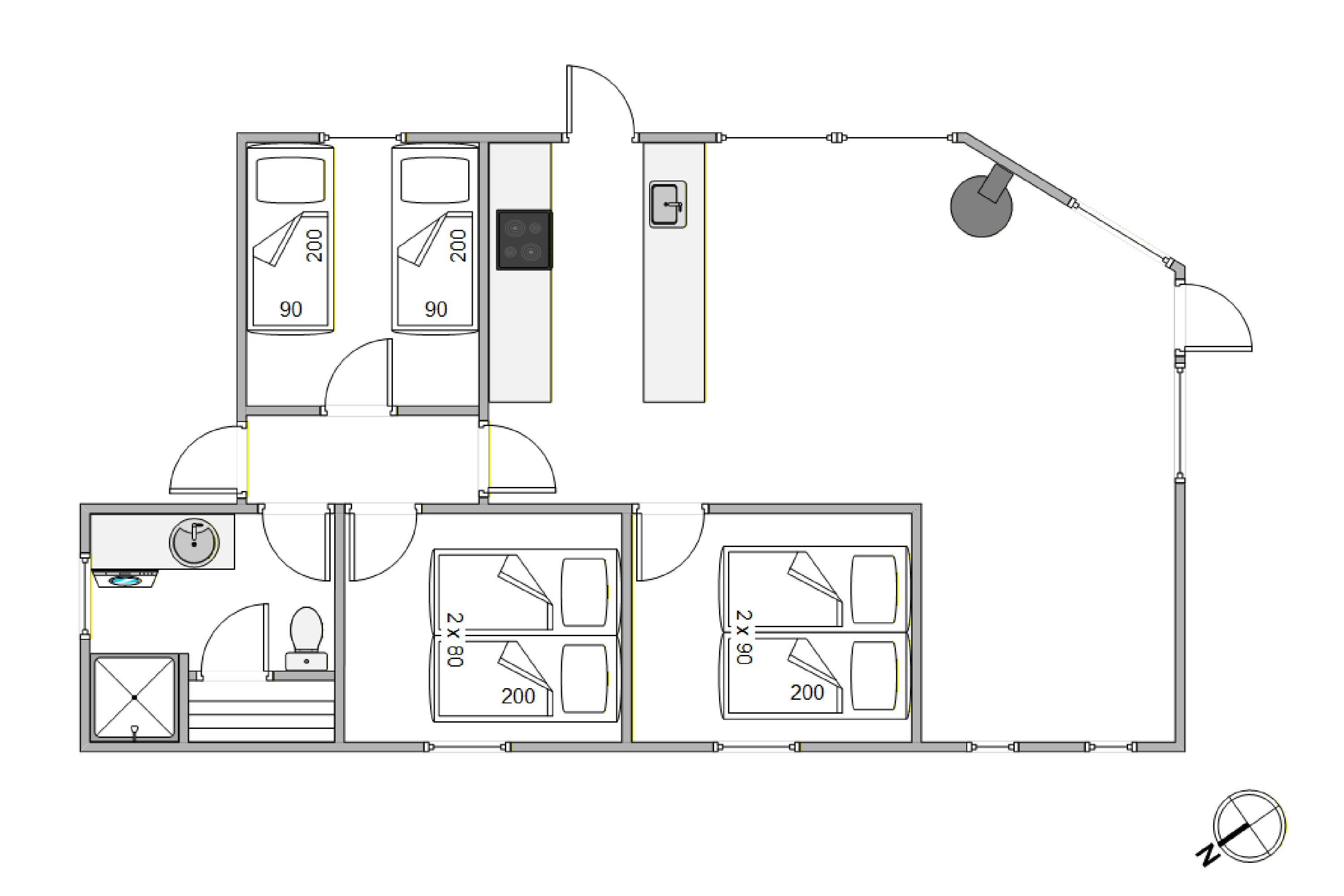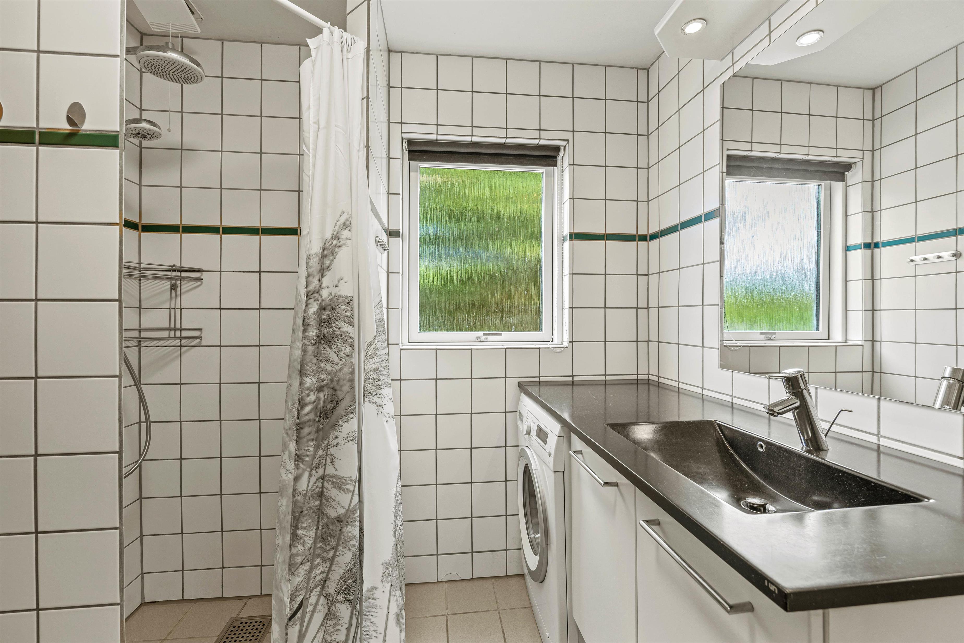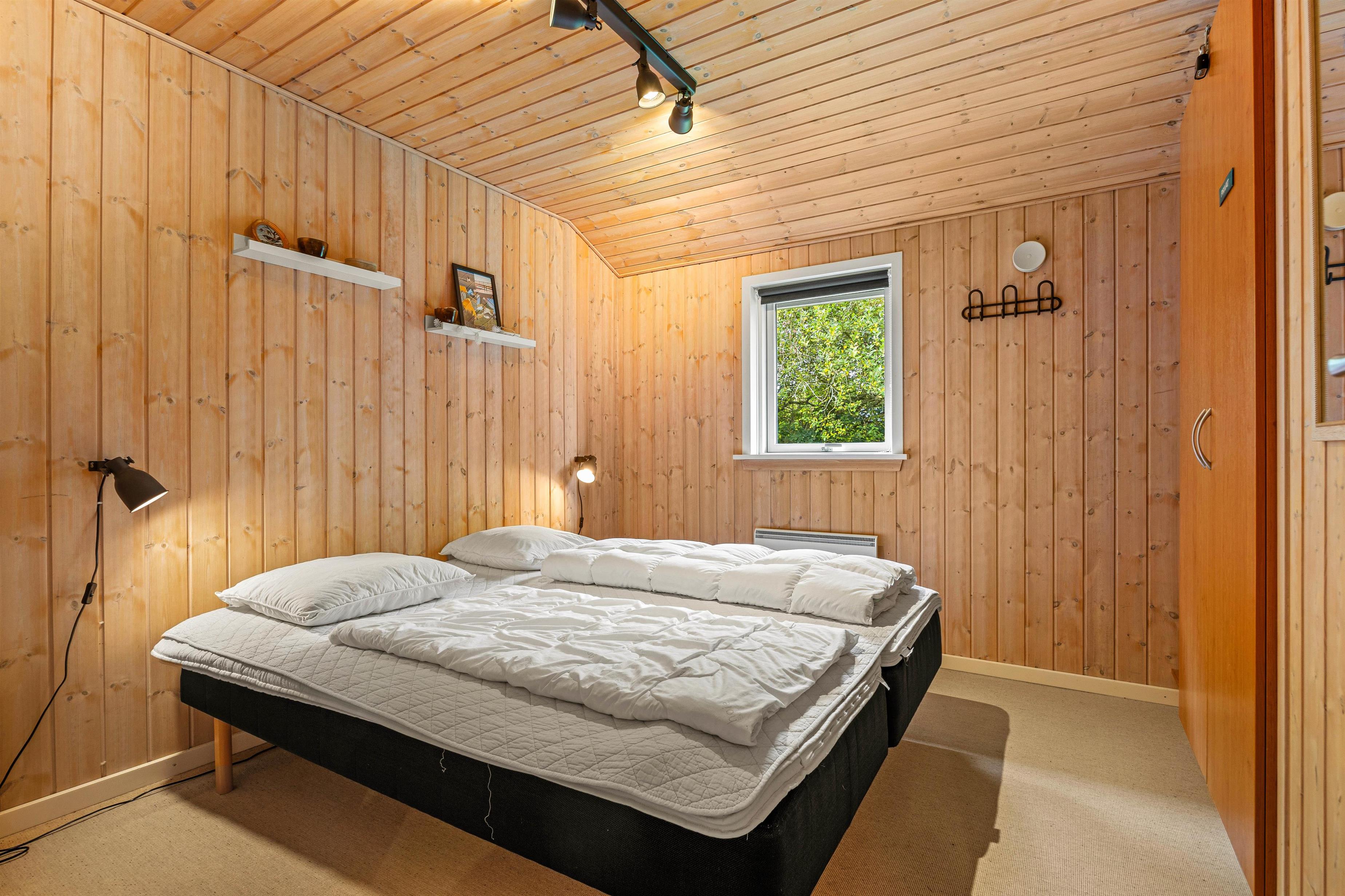 Badeværelset er lyst og her er gulvvarme, bruseniche og vaskemaskine. Her finder I også saunaen, hvor I kan nyde afslappende saunature. Sommerhuset har 2 soveværelser med dobbeltsenge, 1 værelse med 2 enkeltsenge samt en åben hems, som giver fleksibilitet og komfort til alle gæster.
