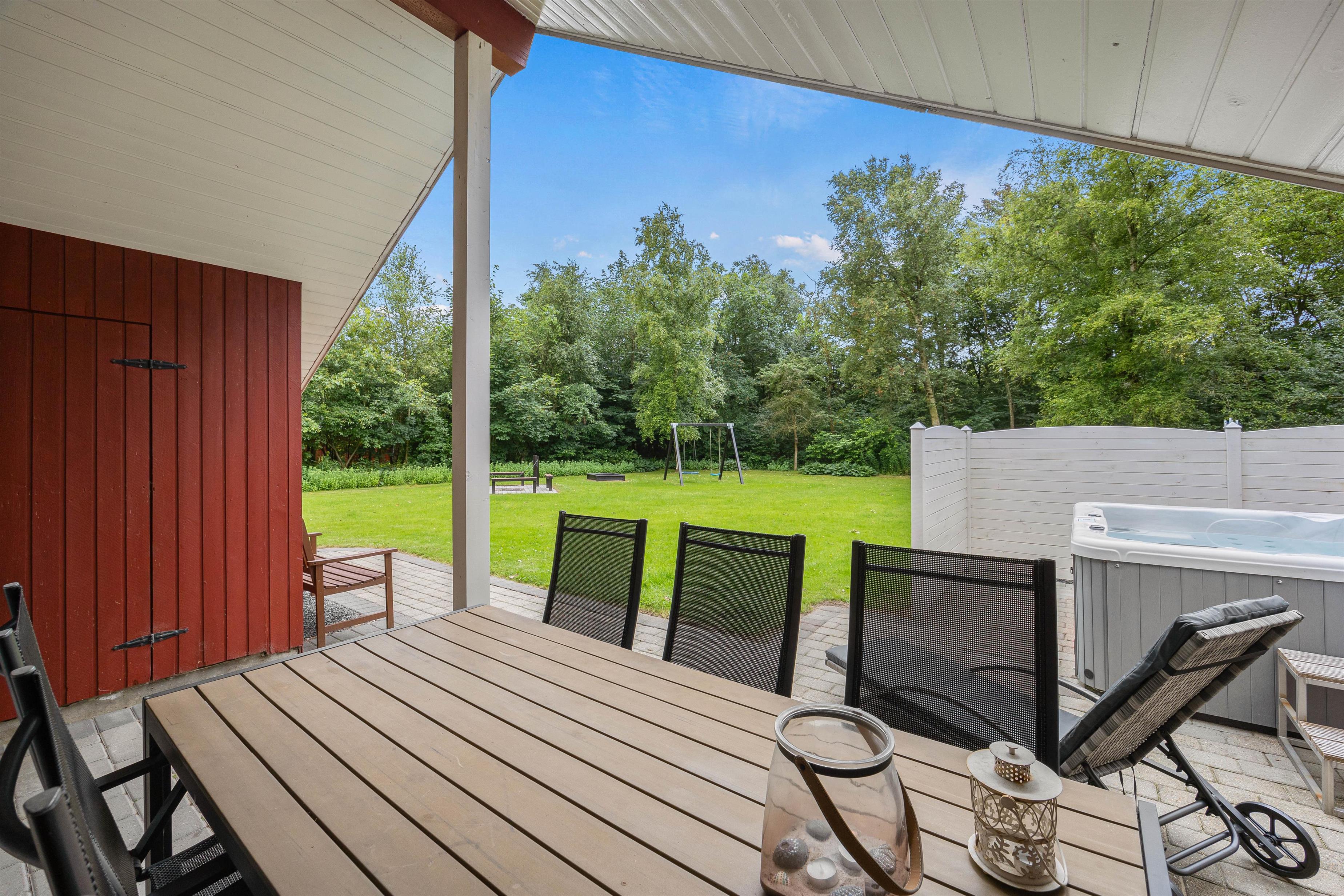 Omkring sommerhuset finder I flere hyggelige zoner, hvor I altid kan finde en plads i morgensolen og nyde jeres morgenkaffe. På terrassen er der alt, hvad I behøver for en aften med mad under åben himmel – her er både grill og havemøbler, samt solvogne til de solrige dage. Som et ekstra element af luksus og afslapning er der en udespa til 6 personer, hvor I kan slappe af og nyde varmen under åben himmel.