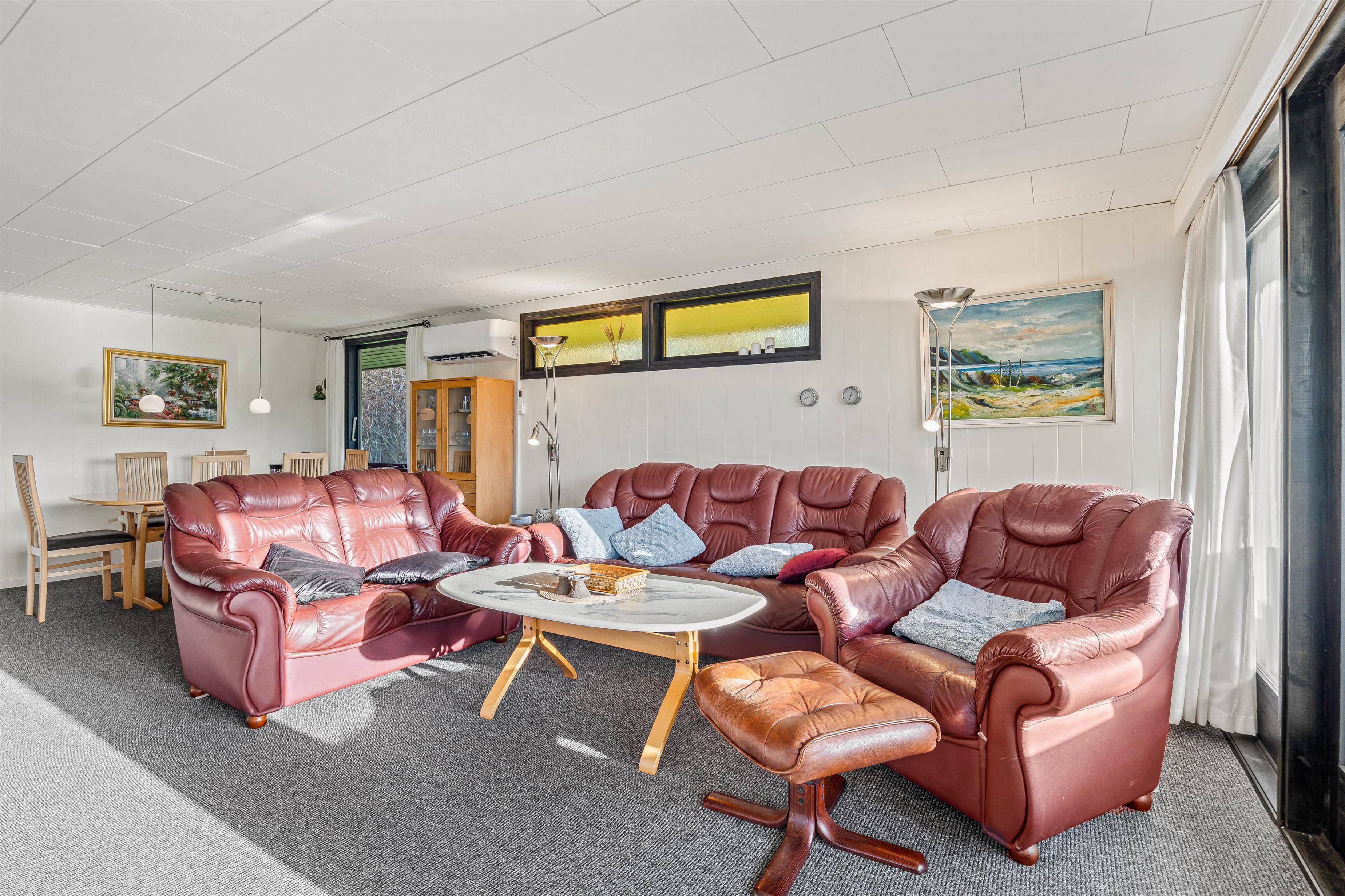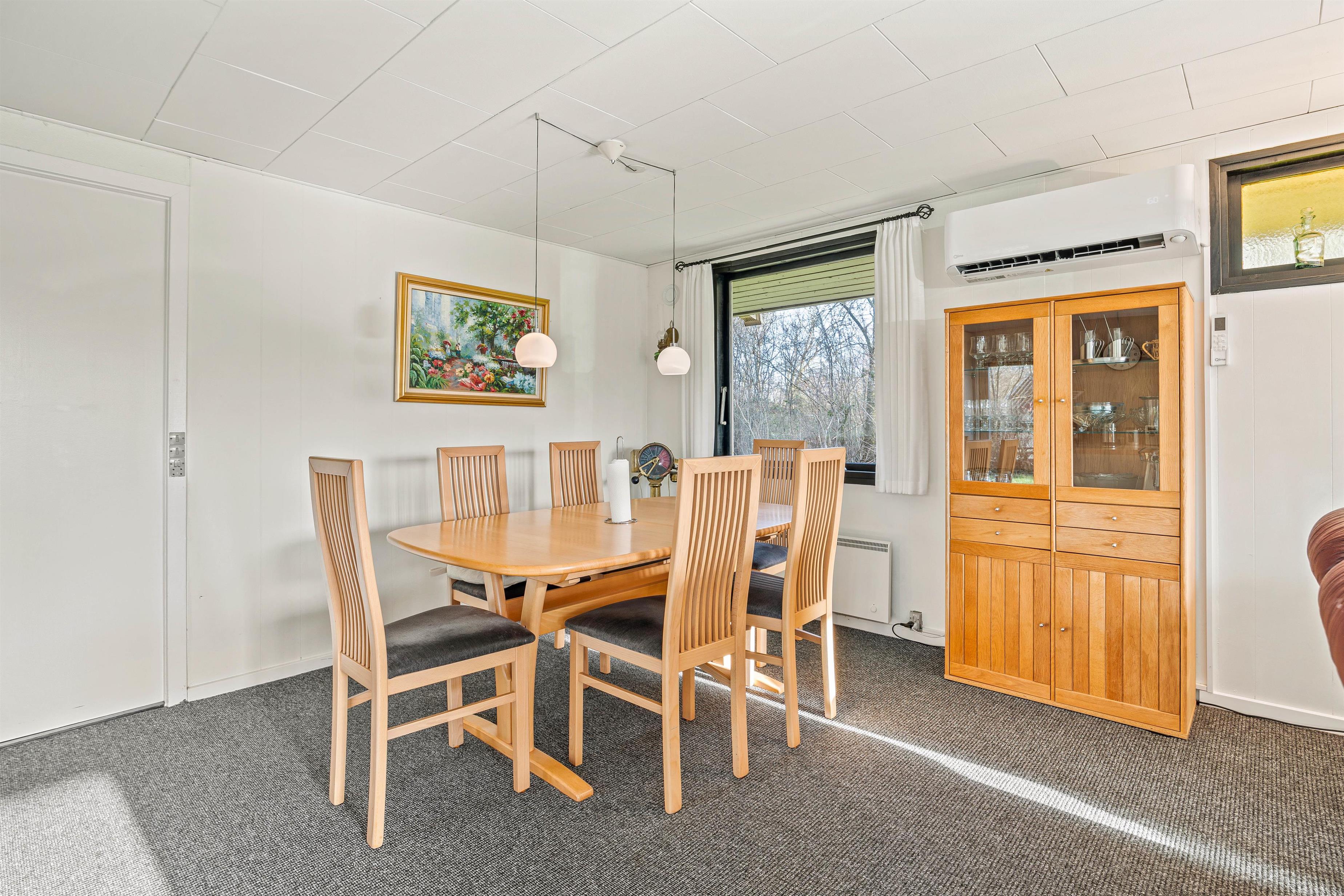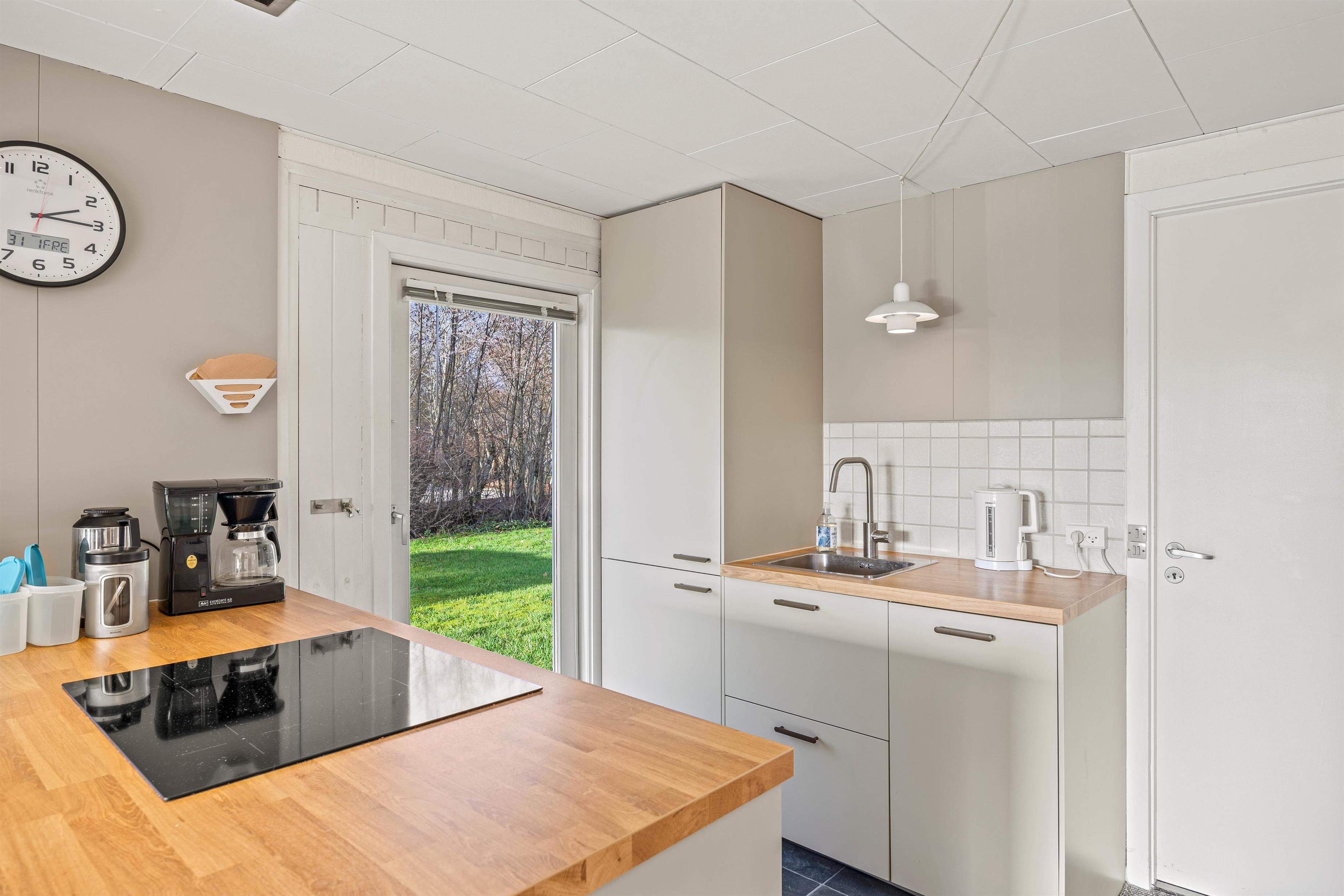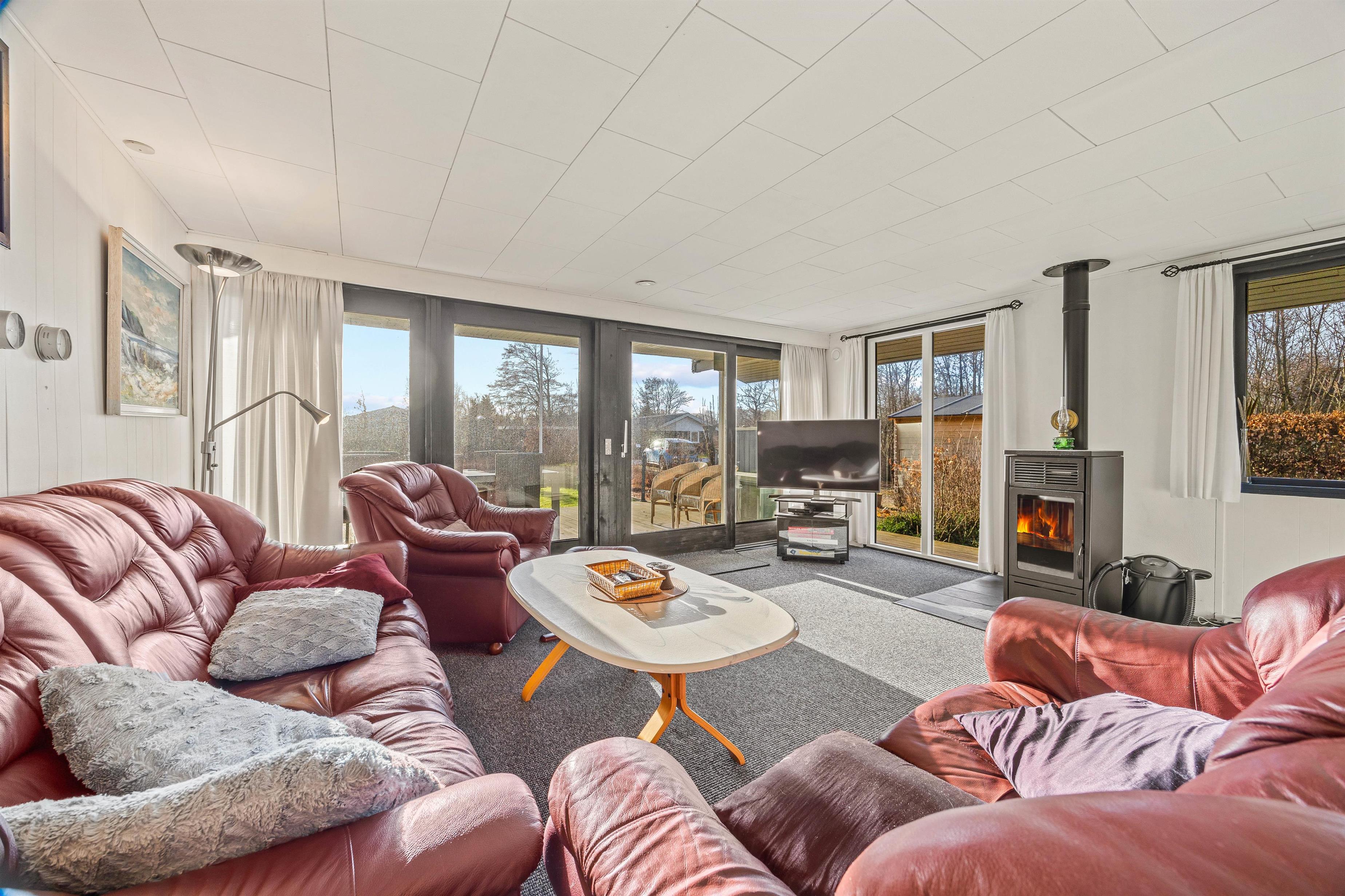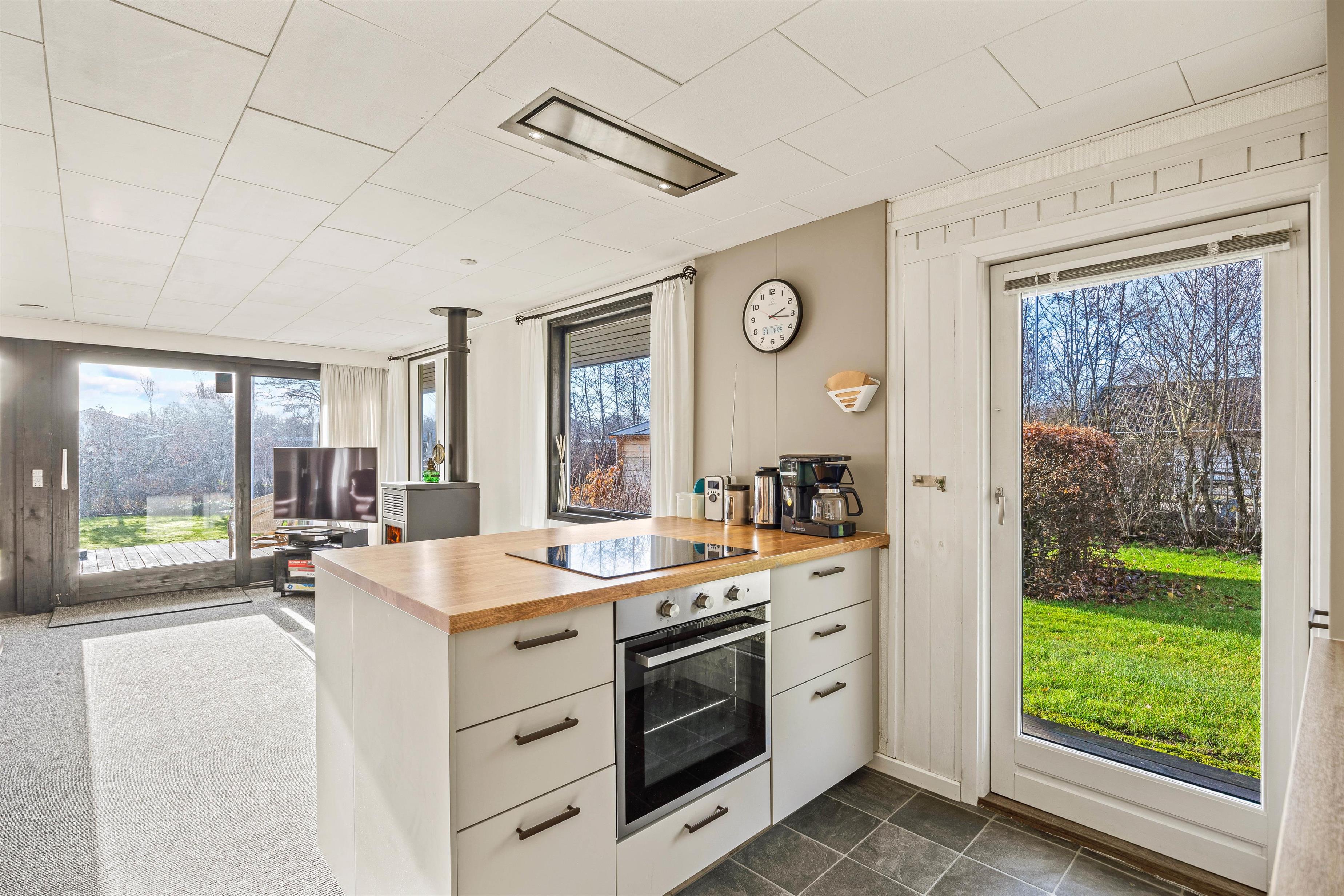 Går I længere ind kommer I til den store stue med integreret køkken, som er renoveret i 2023. Her vil hele flokken kunne tilbringe mange skønne timer sammen. I det nyere køkken fra 2023 kan I tilberede lækre retter med lokale råvarer, mens børnene tegner eller spiller spil omkring køkkenbordet. Senere på aftenen kan I rykke over i sofaen til filmhygge med snacks. På de koldere dage kan I tænde op i brændeovnen og drikke varm kakao med flødeskum. Udover brændeovnen kan I varme sommerhuset op med den energibesparende varmepumpe.