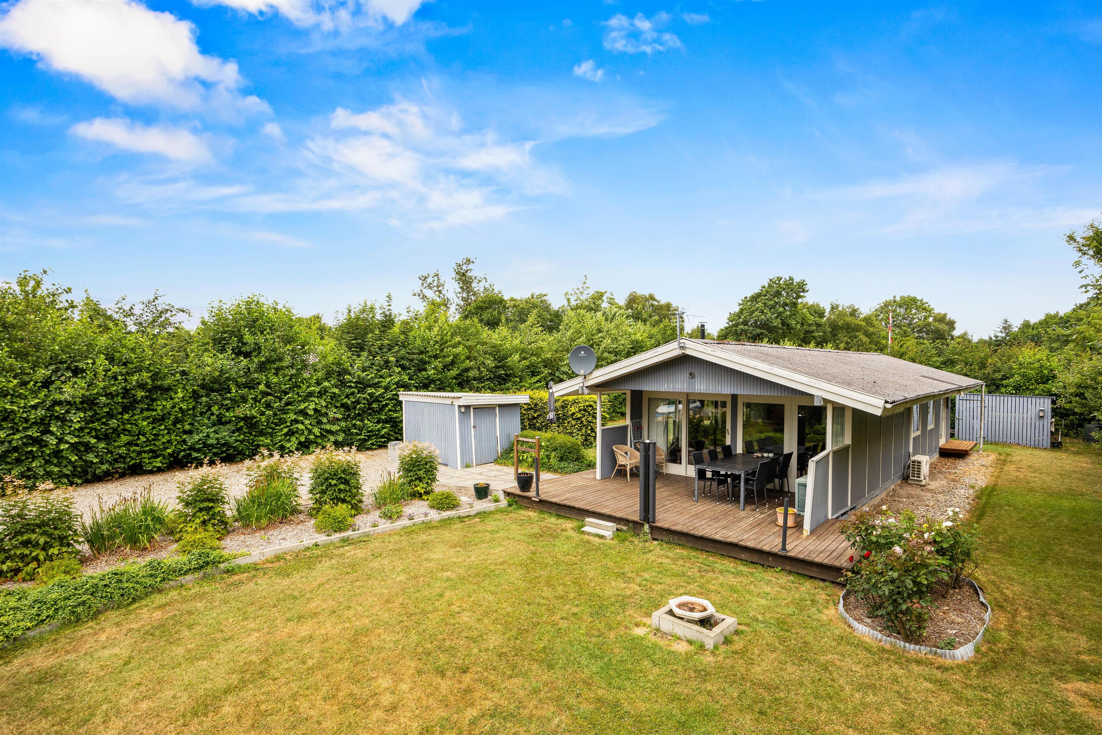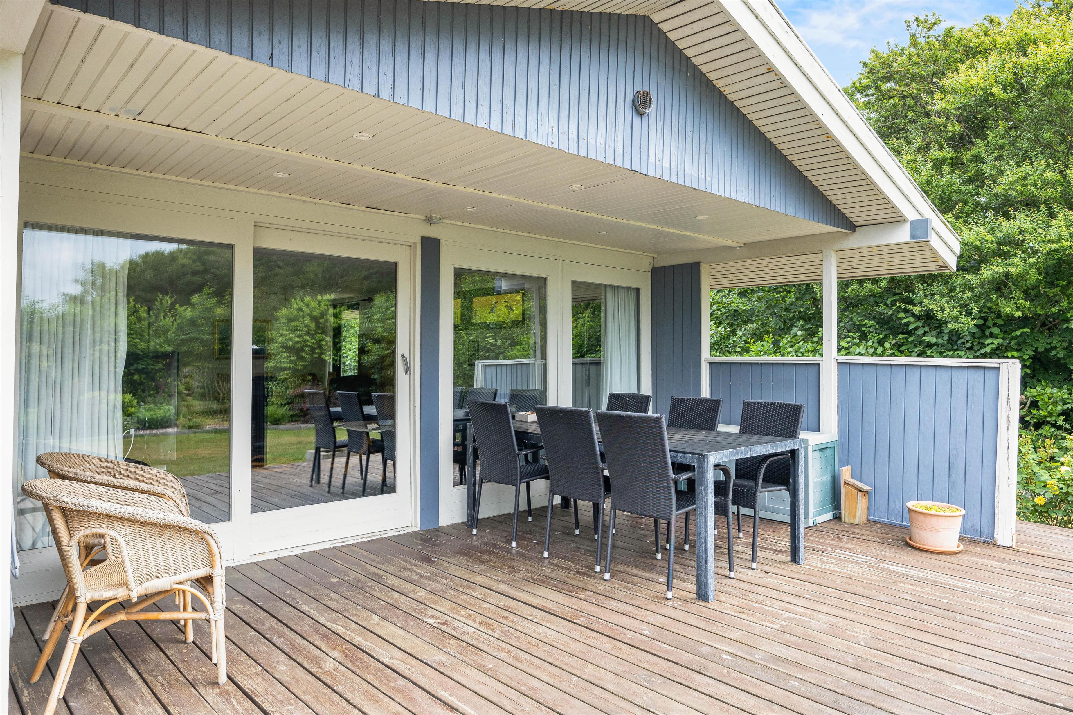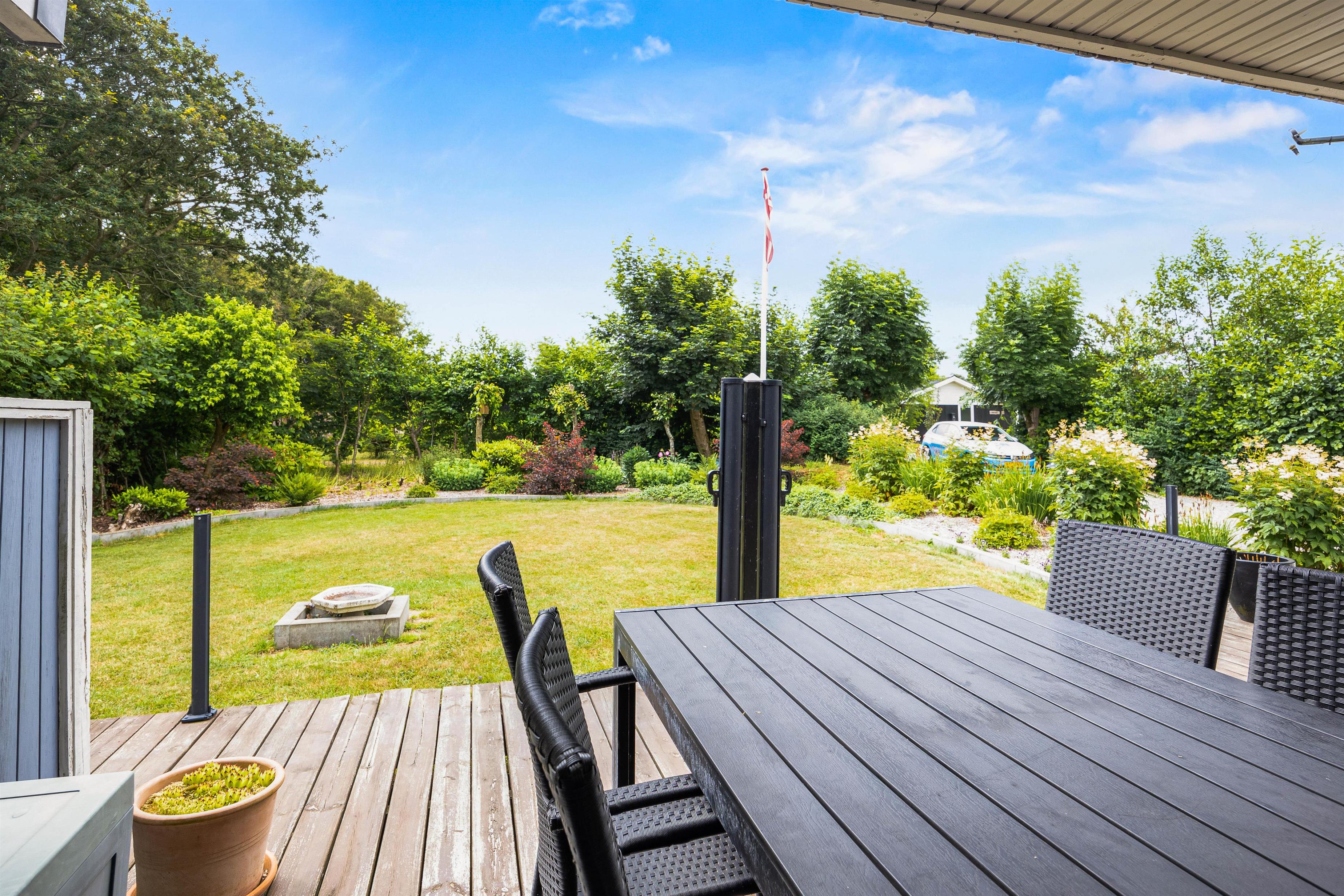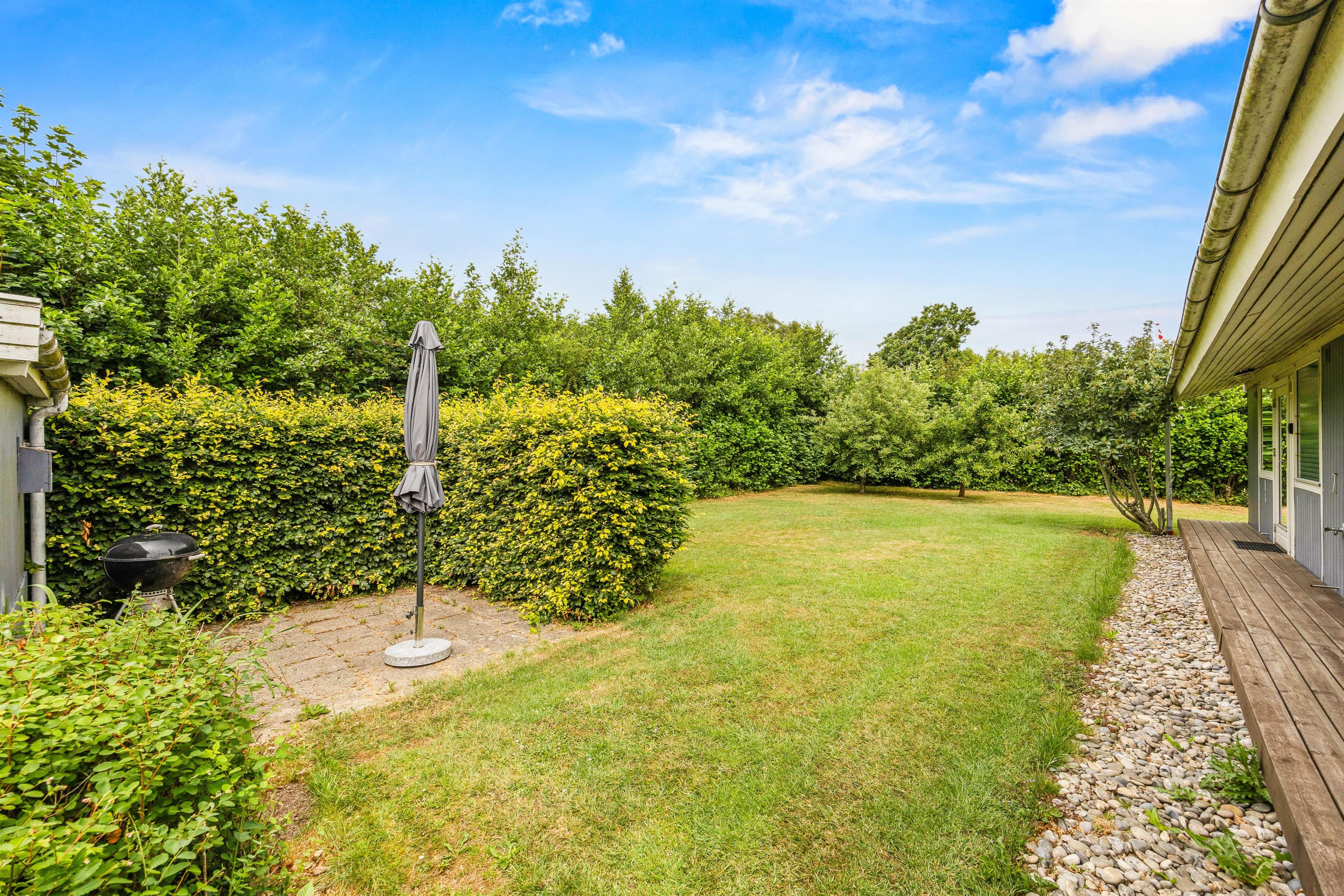 Når I går ud af terrassedøren i nord, står I på den skønne træterrasse, hvorfra der er blik udover den skønne have og fuglene kvidrer i baggrunden. På terrassen venter havemøbler og liggestole på jer, og her kan I nyde frokosten med grillede pølser fra grillen – her kan I også sidde i skygge og læ under halvtaget, mens programmet for dagen planlægges.