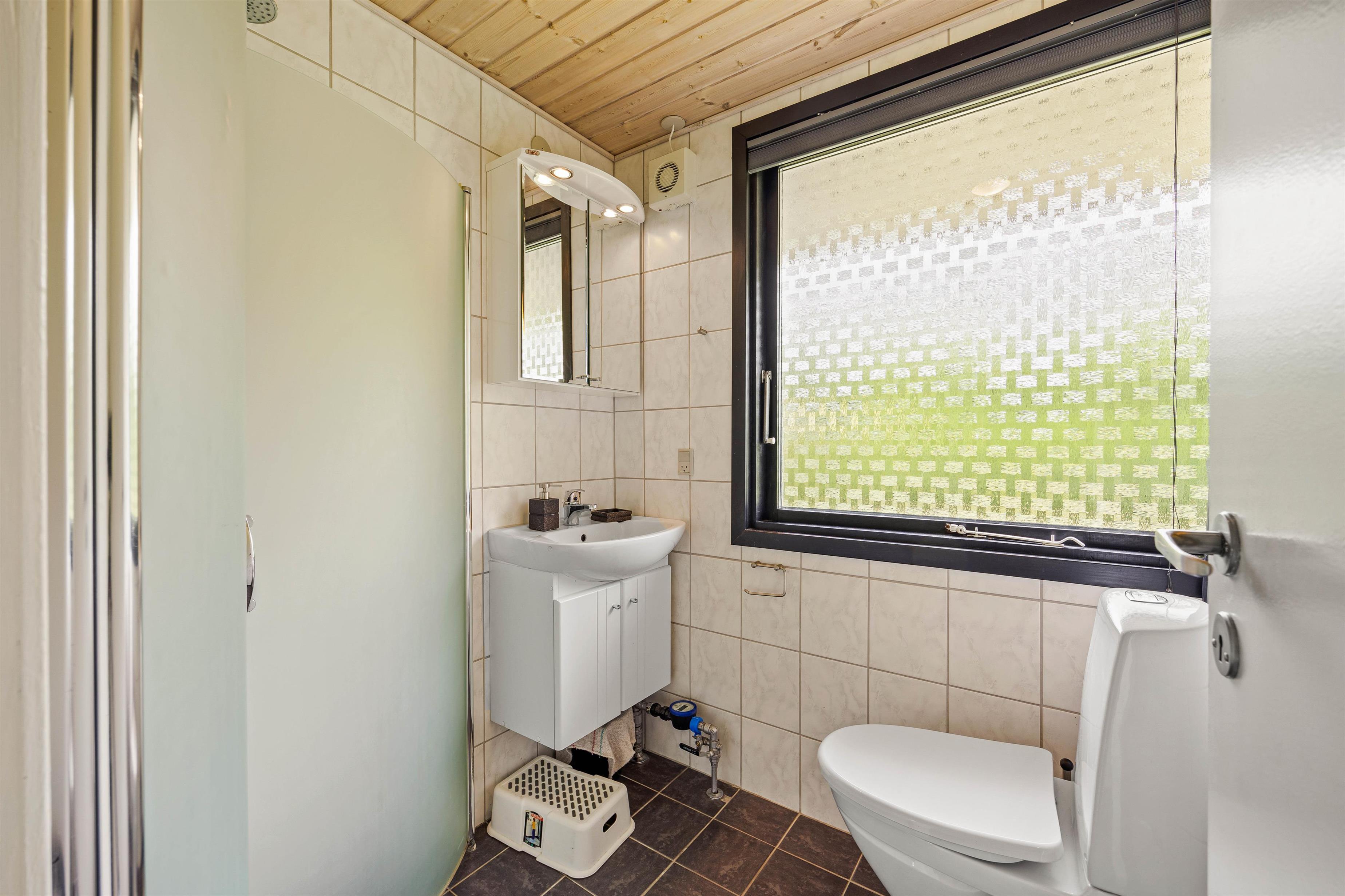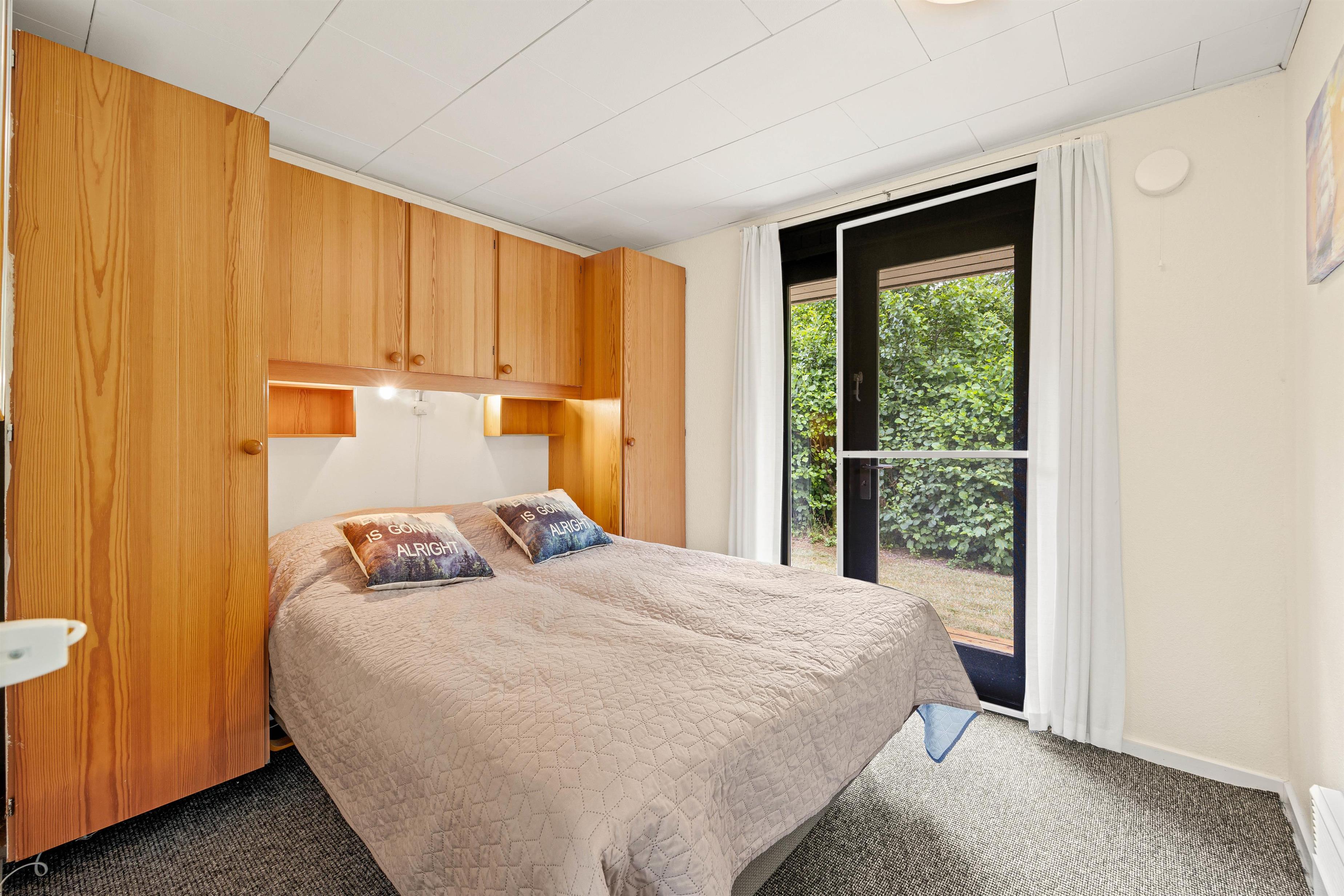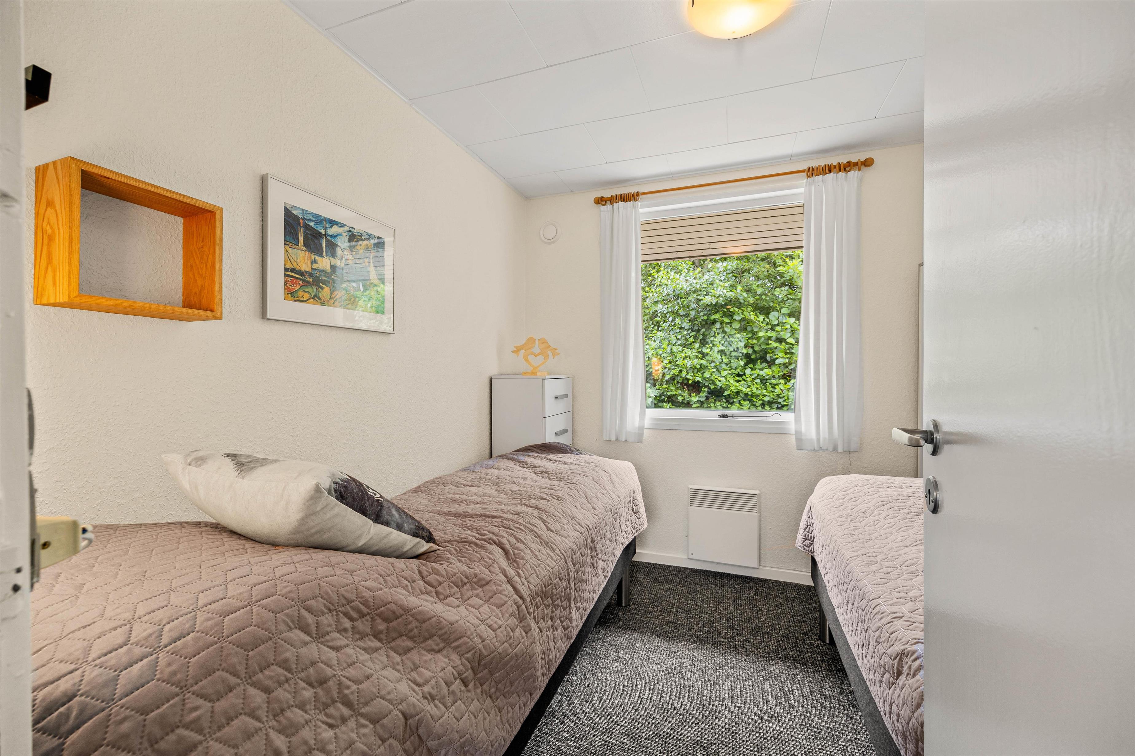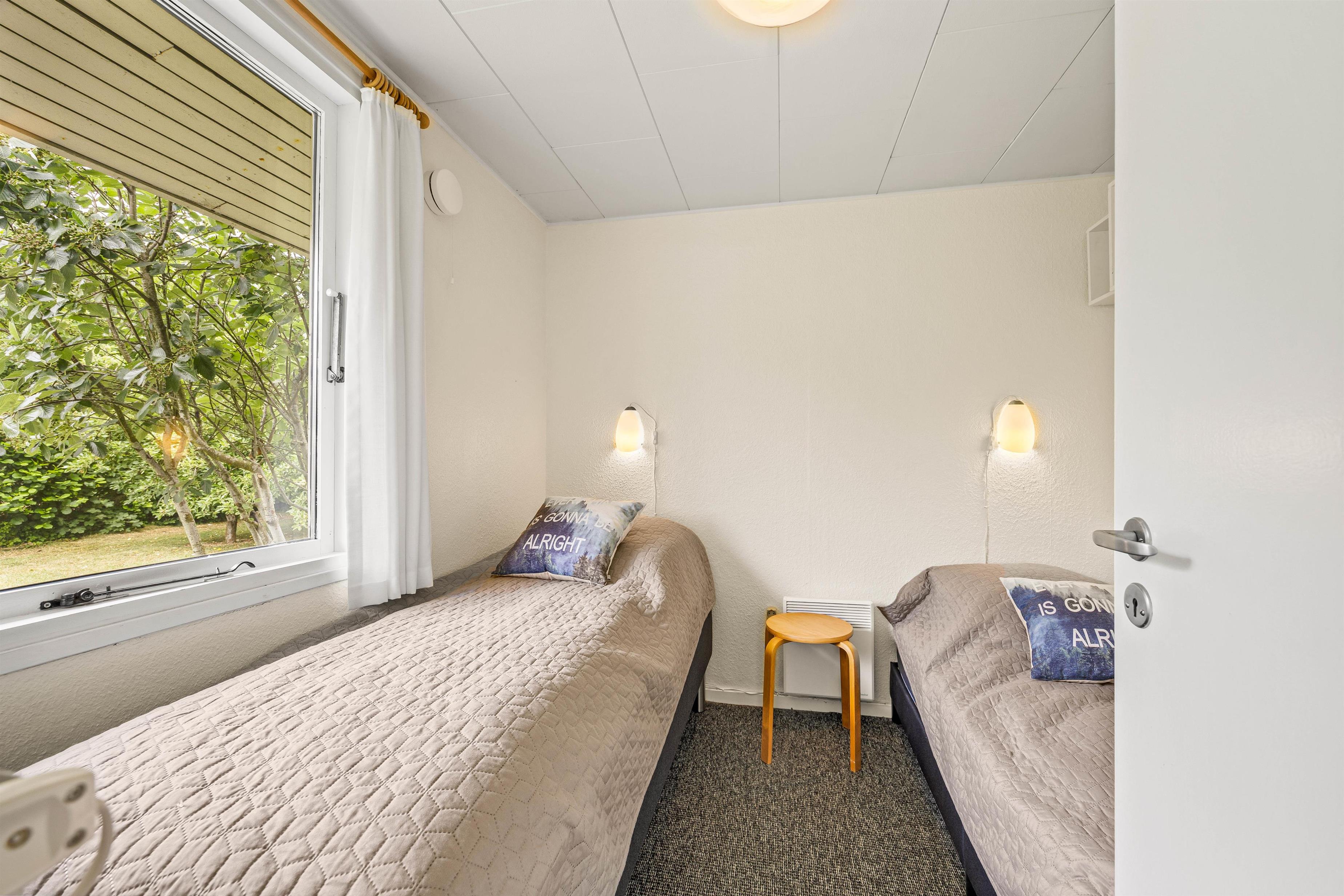 Sommerhuset er i klassisk sommerhusstil, som indbyder til ægte hygge med familie og venner. Indretningen er gennemtænkt med opholdsrum i den ene ende med adgang til terrassen og soveafdeling i den anden. Når I træder ind i sommerhuset, bliver I mødt af de tre soveværelser og et lille badeværelse med gulvvarme. De tre værelser er indrettet med en dobbeltseng og fire enkeltsenge,